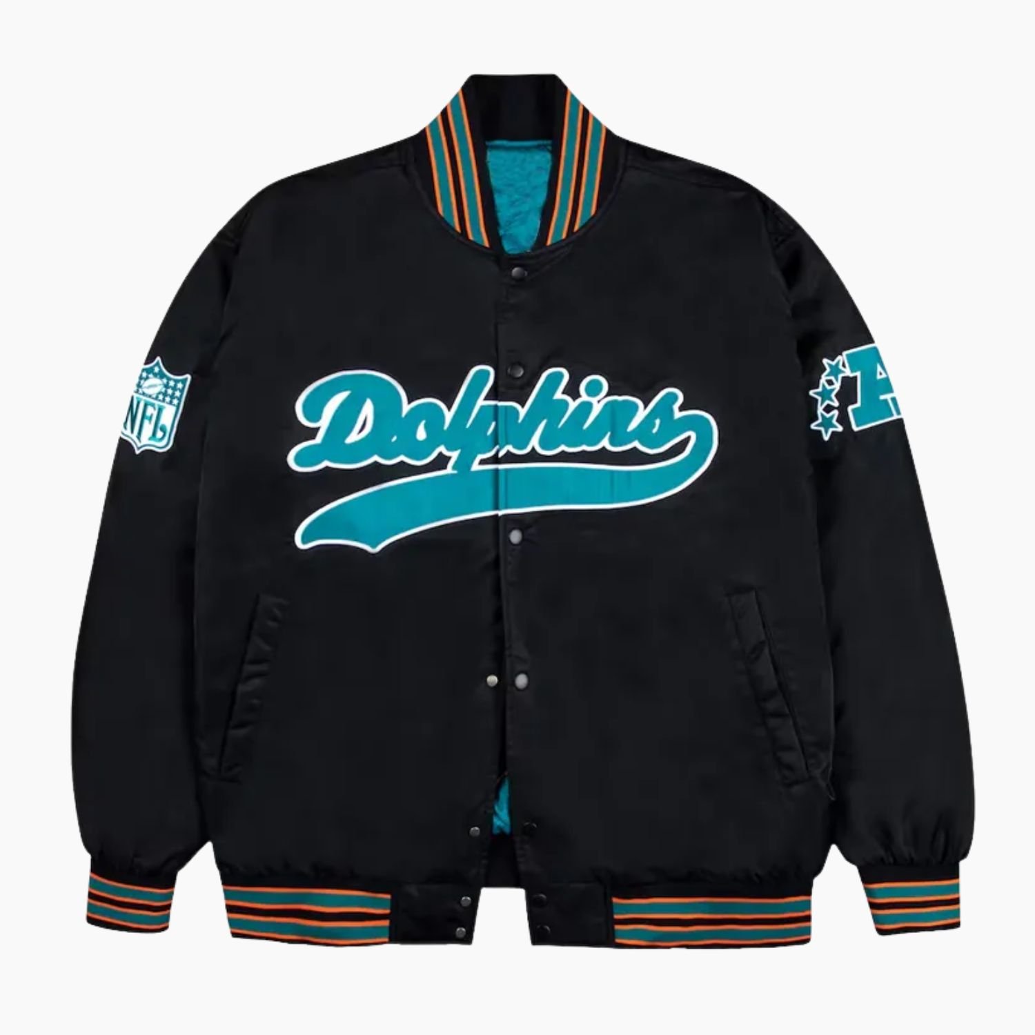 The rib knit standup collar adds an athletic touch featuring vibrant aqua and orange stripes that highlight the Dolphins iconic color scheme. This same contrast striping appears throughout the jacket creating a cohesive sports inspired appearance. Inside the soft viscose lining provides all day comfort making it easy to wear during game days casual outings or everyday layering.