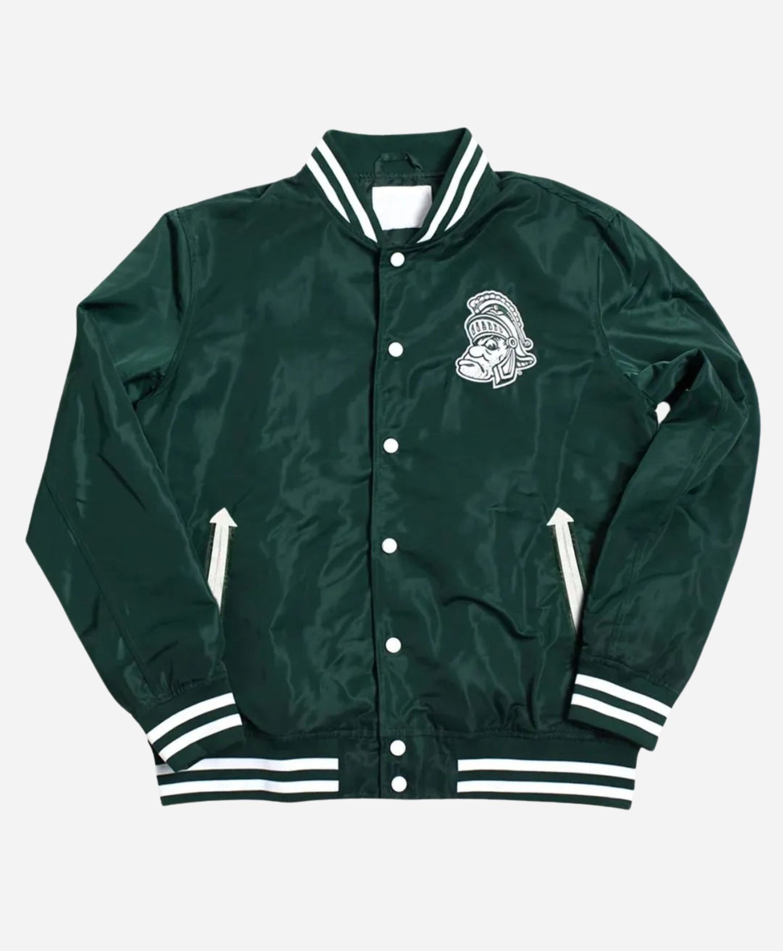 Functionality meets style with the classic snap-button closure, allowing for easy wear and a timeless varsity look. Two spacious side waist pockets provide a convenient spot for your essentials or a place to keep your hands warm. With top-quality stitching throughout, this jacket by Movie Jackets Hub is built for durability, ensuring it remains a staple in your wardrobe for seasons to come. Elevate your sports-inspired style and represent the Spartans with the elegance and grit they deserve.