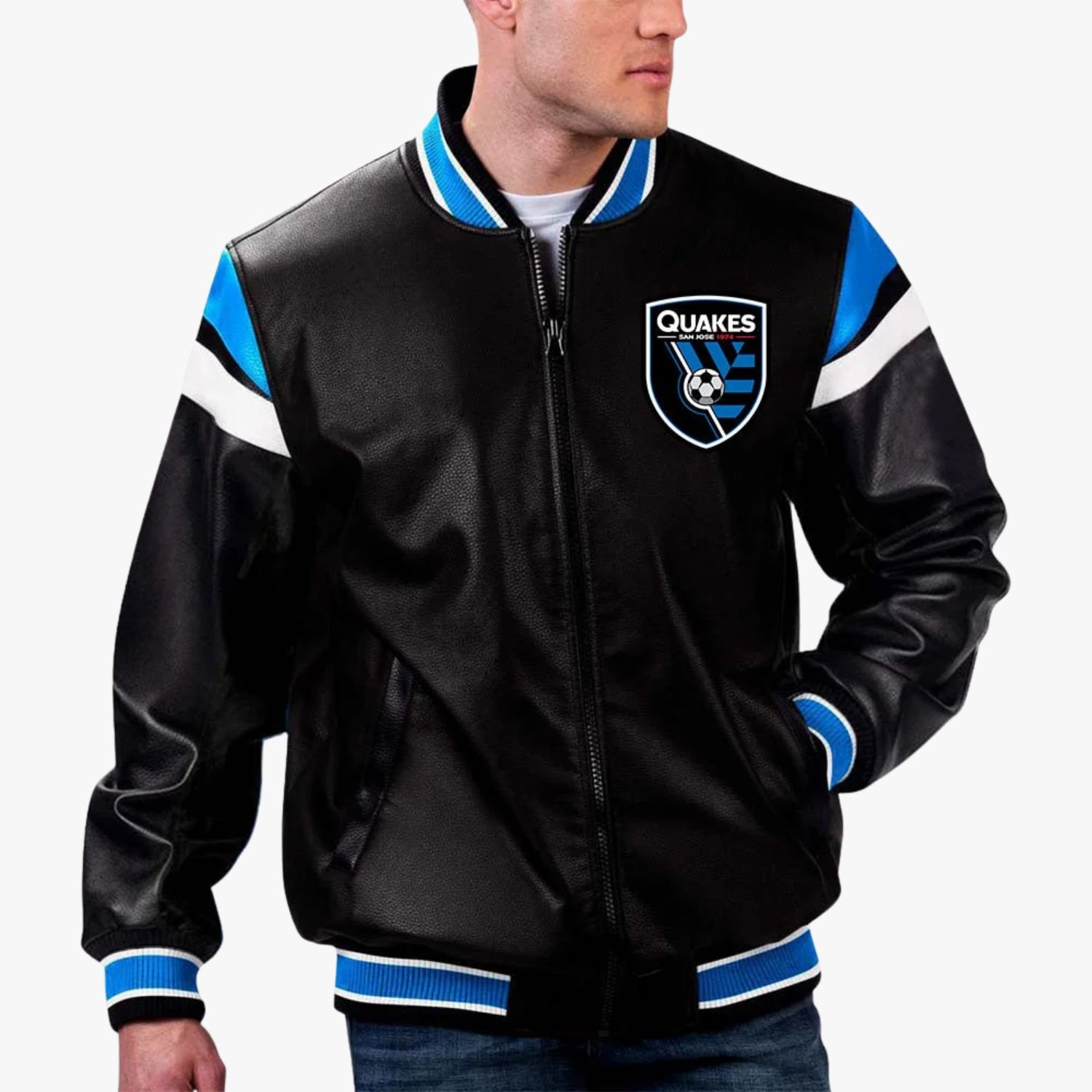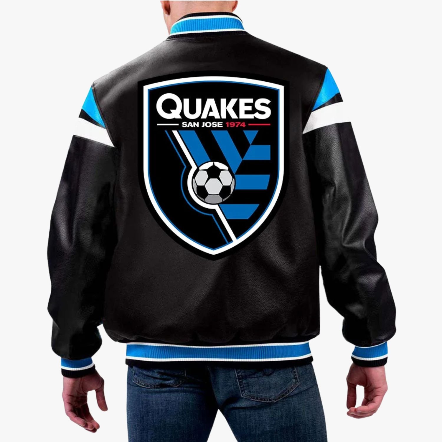 Represent the tremors of the West Coast soccer scene with a garment that balances grit and grace. The San Jose Earthquakes Genuine Leather Varsity Jacket is a departure from standard stadium merch, moving into the realm of luxury streetwear. While the Earthquakes are famous for their blue and black kit, this “Eclipse Edition” focuses on a monochromatic black palette, highlighting the premium textures of the materials rather than just the colors.
