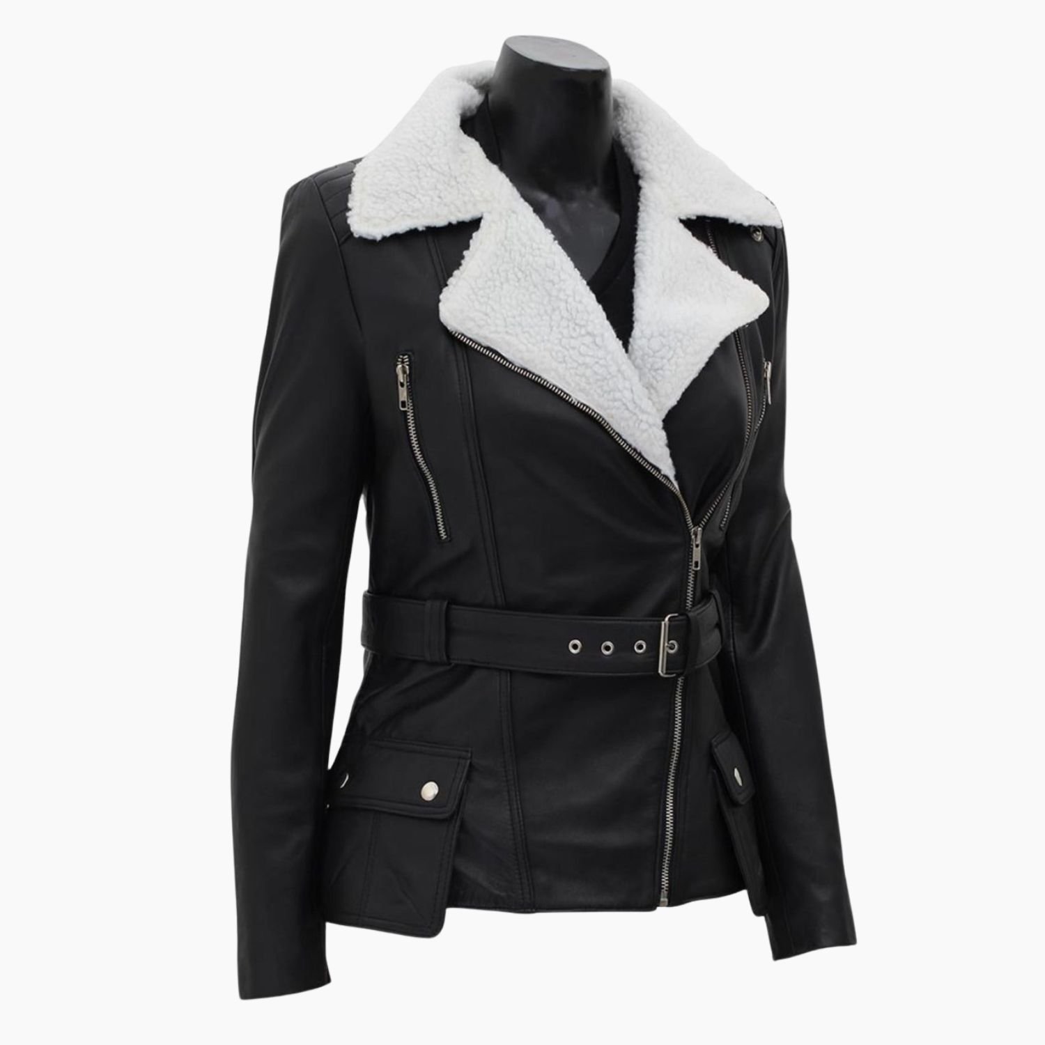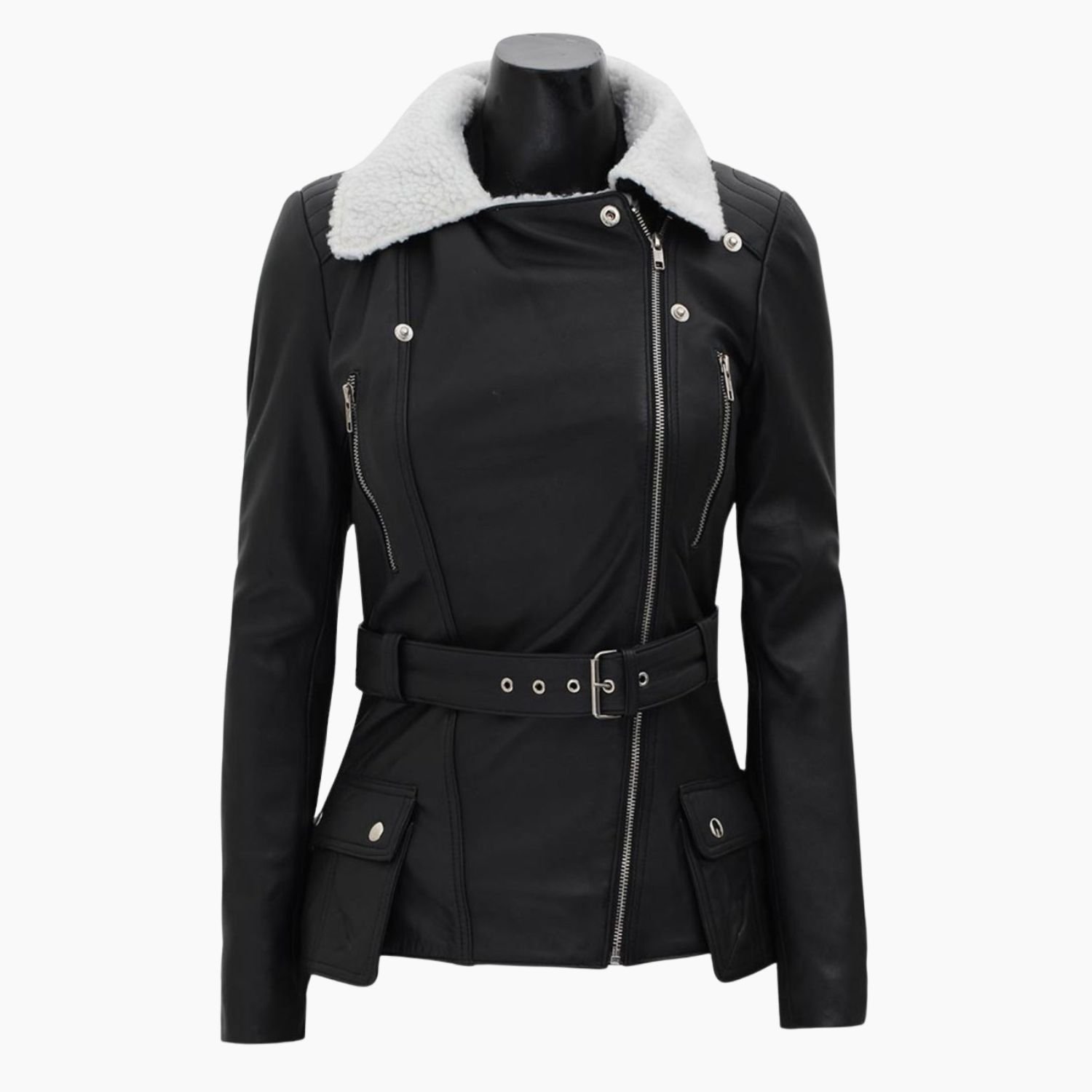 Natalie Genuine Shearling Black Belted Asymmetrical Biker Leather Jacket