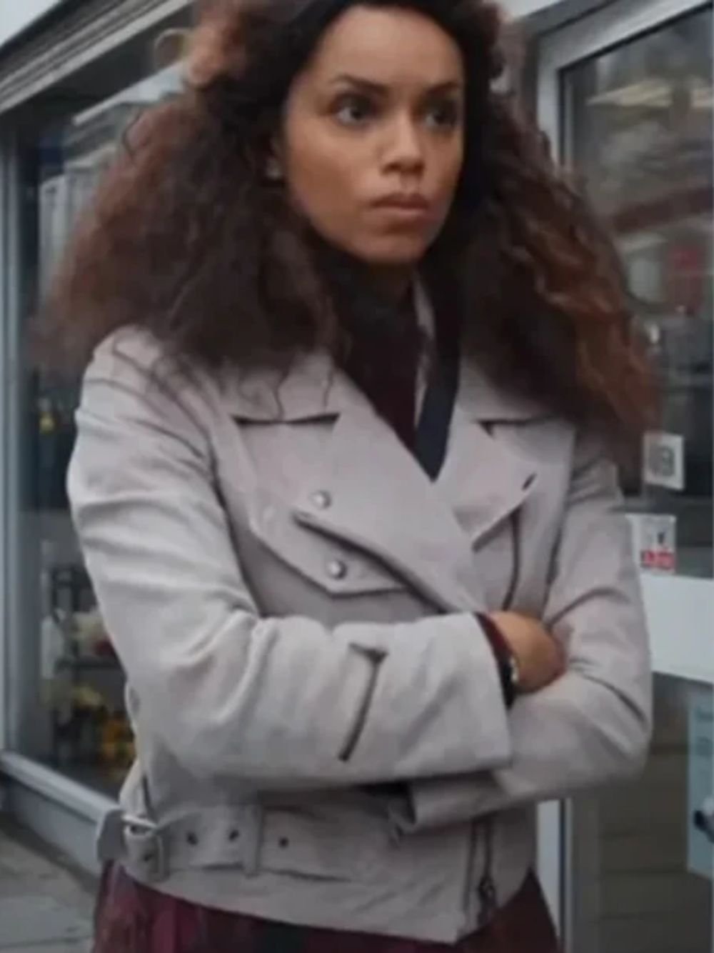 Georgina Campbell TV Series Suspicion Season 01 Natalie Thompson Cropped Biker Suede Leather Jacket