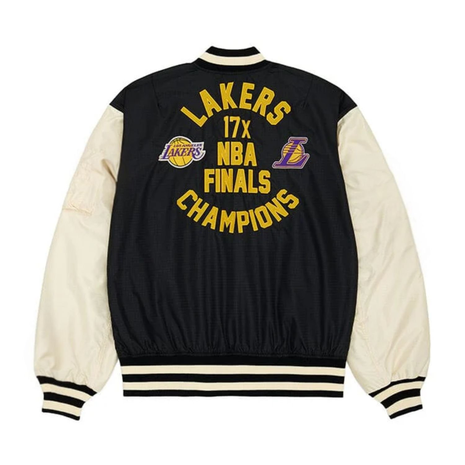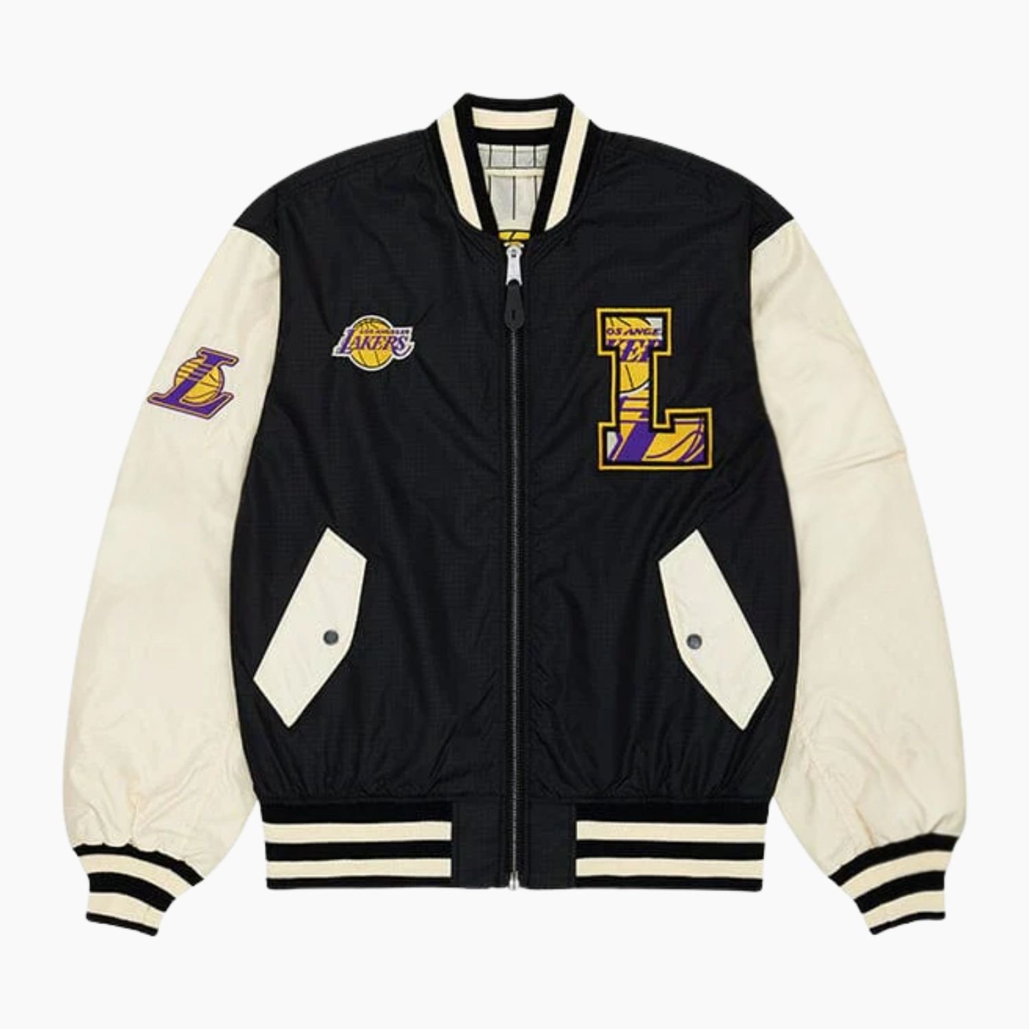 Practicality is woven into every detail of this bomber. It features two spacious side pockets, providing convenient storage for your smartphone and keys while doubling as handwarmers during cooler evenings. The full-length sleeves are finished with ribbed cuffs that match the collar and hemline, creating a secure fit that helps retain body heat and maintain the jacket’s sharp profile. Adorned with iconic NBA team logos and finished with top-quality stitching, this Lakers bomber is built for durability and long-lasting wear. Elevate your fan gear with a piece that balances professional craftsmanship with the legendary pride of the LakeShow.