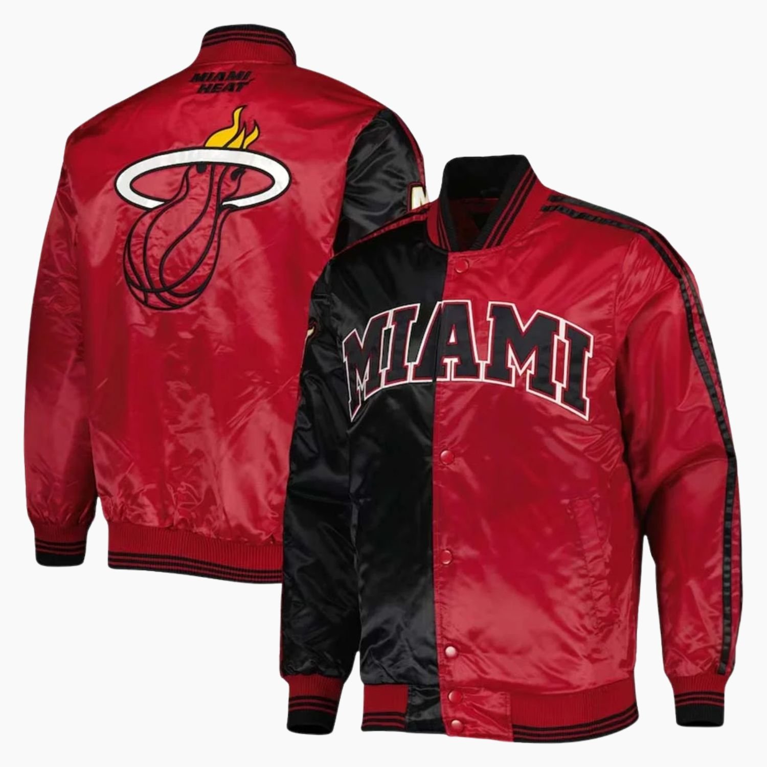 Bring the heat with the NBA Men’s Miami Heat Black Red Fast Break Satin Full Snap Jacket, a varsity-inspired jacket designed for fans who want style, comfort, and team pride all in one. Inspired by authentic NBA team jackets, this piece captures the bold energy of the Miami Heat while delivering a sleek, athletic look.