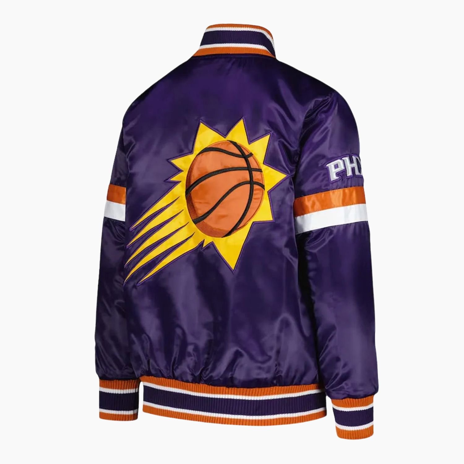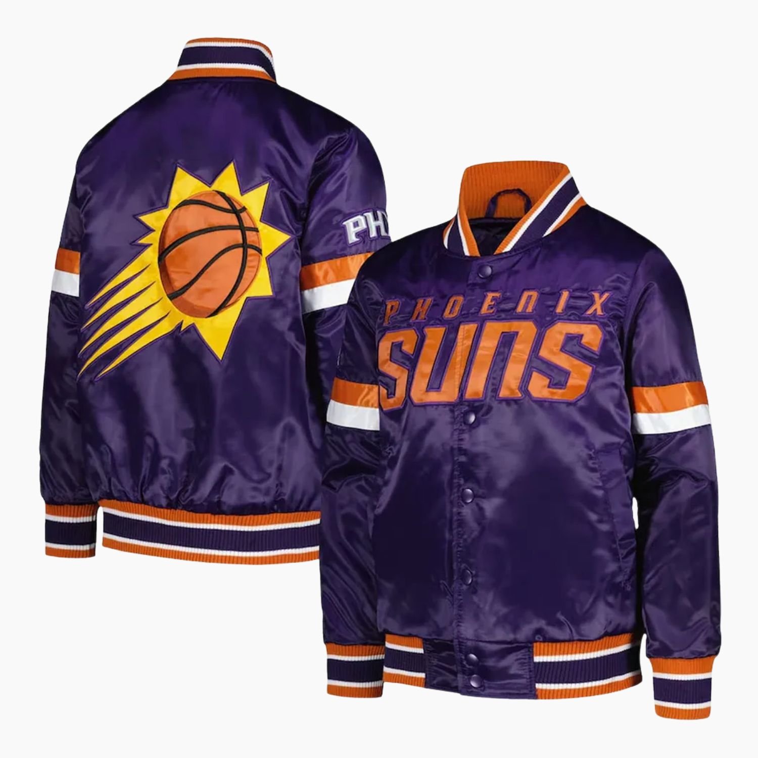 Embrace the vibrant energy of the Valley with the NBA Phoenix Suns Satin Varsity Jacket. This premium piece of fan apparel is a bold tribute to one of the most exciting franchises in basketball, featuring the team’s iconic purple colorway. The jacket is crafted from high-quality satin that provides a lustrous, high-shine finish, capturing the desert sun’s intensity and the neon glow of the arena. Whether you are cheering from the stands at the Footprint Center or bringing a sporty edge to your weekend street style, this jacket offers a lightweight and luxurious feel that makes it a standout addition to any Suns supporter’s wardrobe.