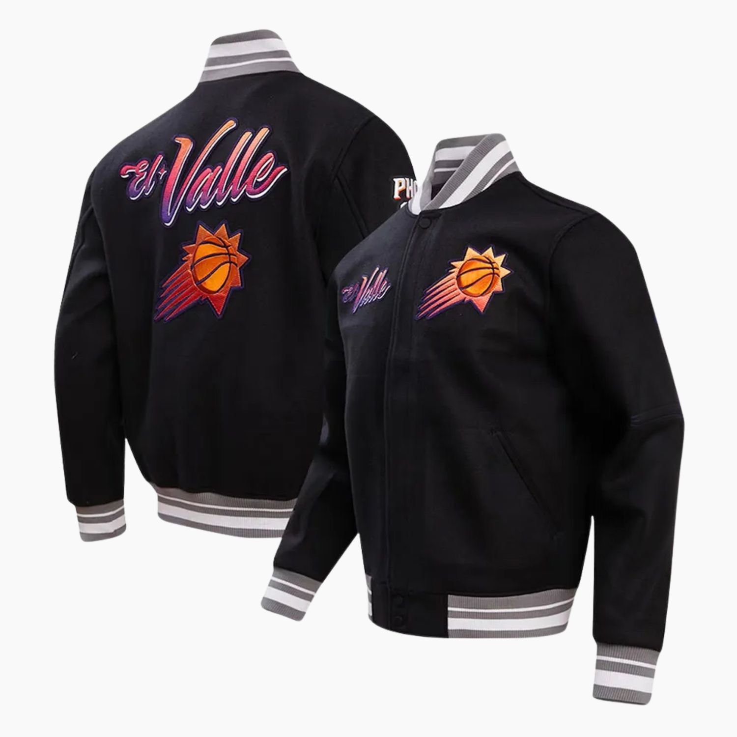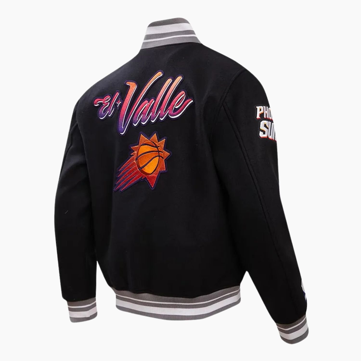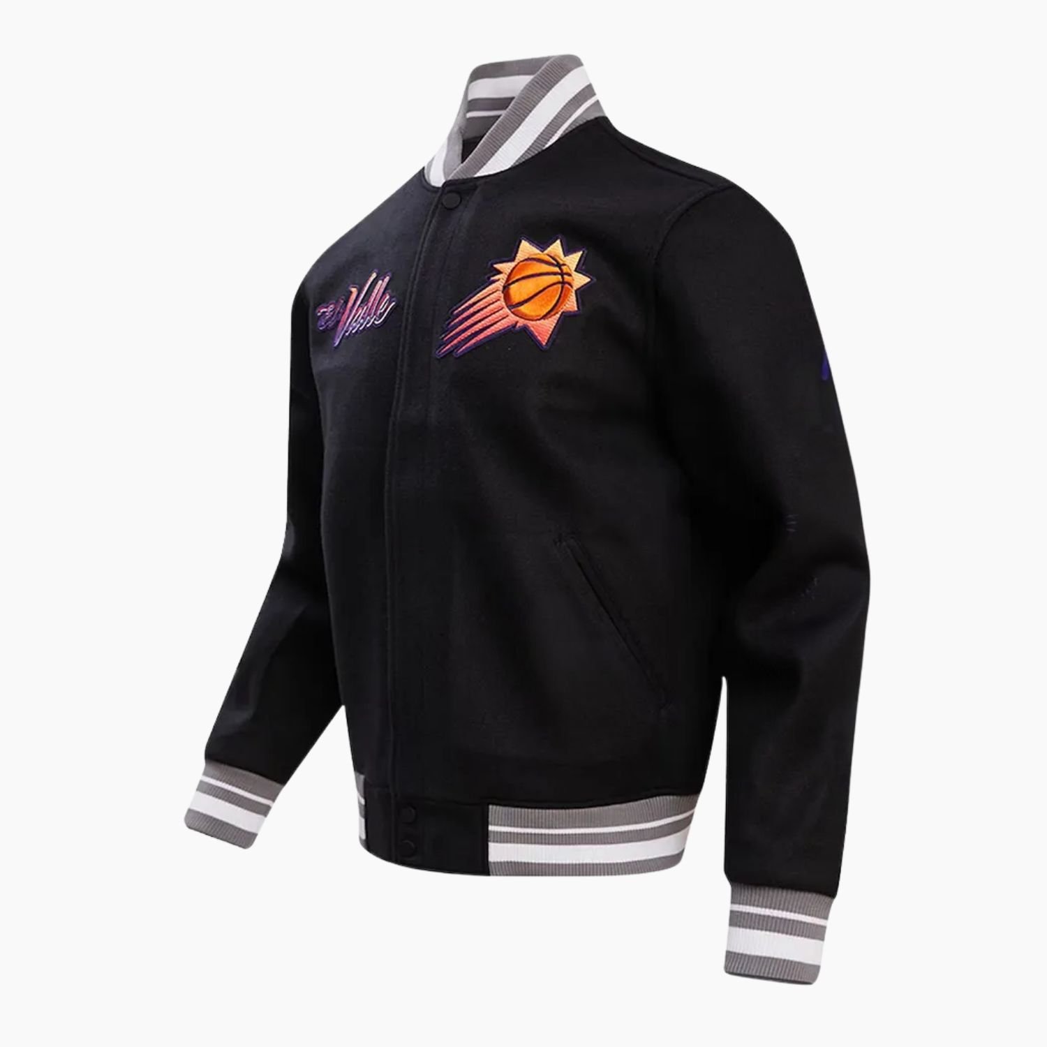 Ignite your winter wardrobe with the NBA Phoenix Suns Wool Varsity Jacket, a premium piece of athletic outerwear designed for the dedicated Valley fan. This jacket offers a sophisticated take on team loyalty, utilizing a deep black colorway that provides a sleek, modern alternative to traditional bright palettes. Crafted from high-density, premium wool, the exterior is engineered to provide superior warmth and a substantial, high-end feel. Whether you are navigating the cool desert evenings or heading into the Footprint Center for a high-stakes playoff game, this jacket ensures you remain shielded from the elements while maintaining an elite, professional silhouette.