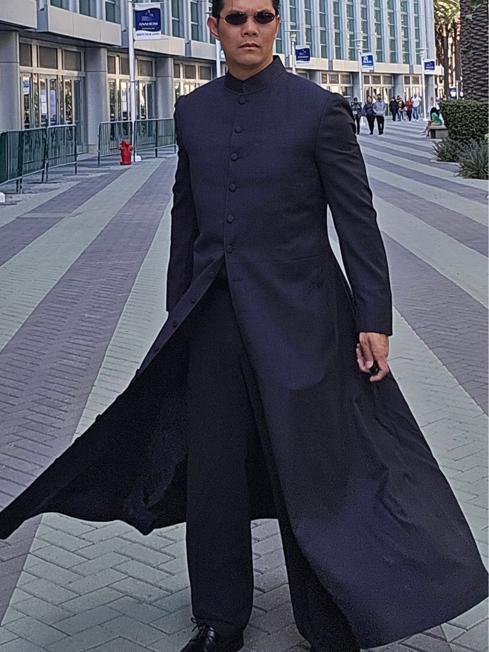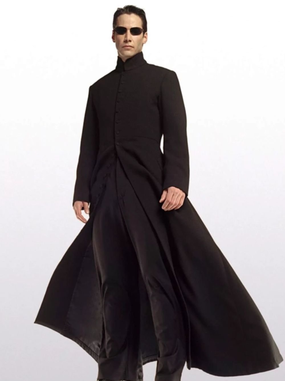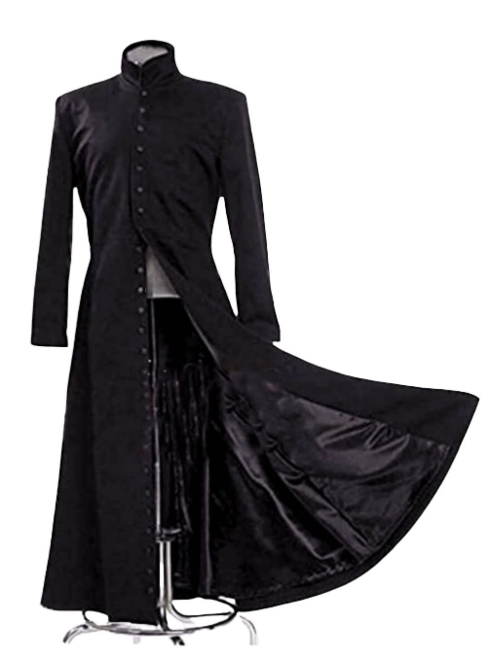 Designed with a classic shirt-style collar, full-length sleeves with open hem cuffs, and an open-style front closure, this coat by Movie Jackets Hub exudes a timeless and effortlessly cool appeal. Its long black silhouette captures the essence of Neo’s signature style, making it a must-have for cosplay, Halloween, or movie-inspired fashion.