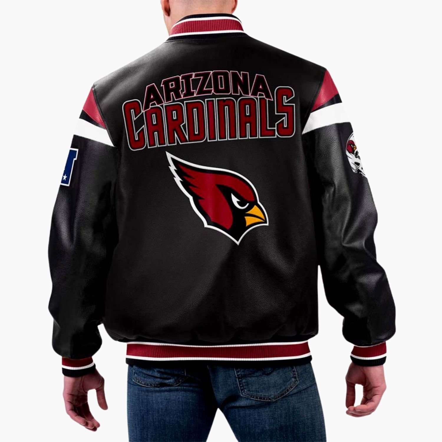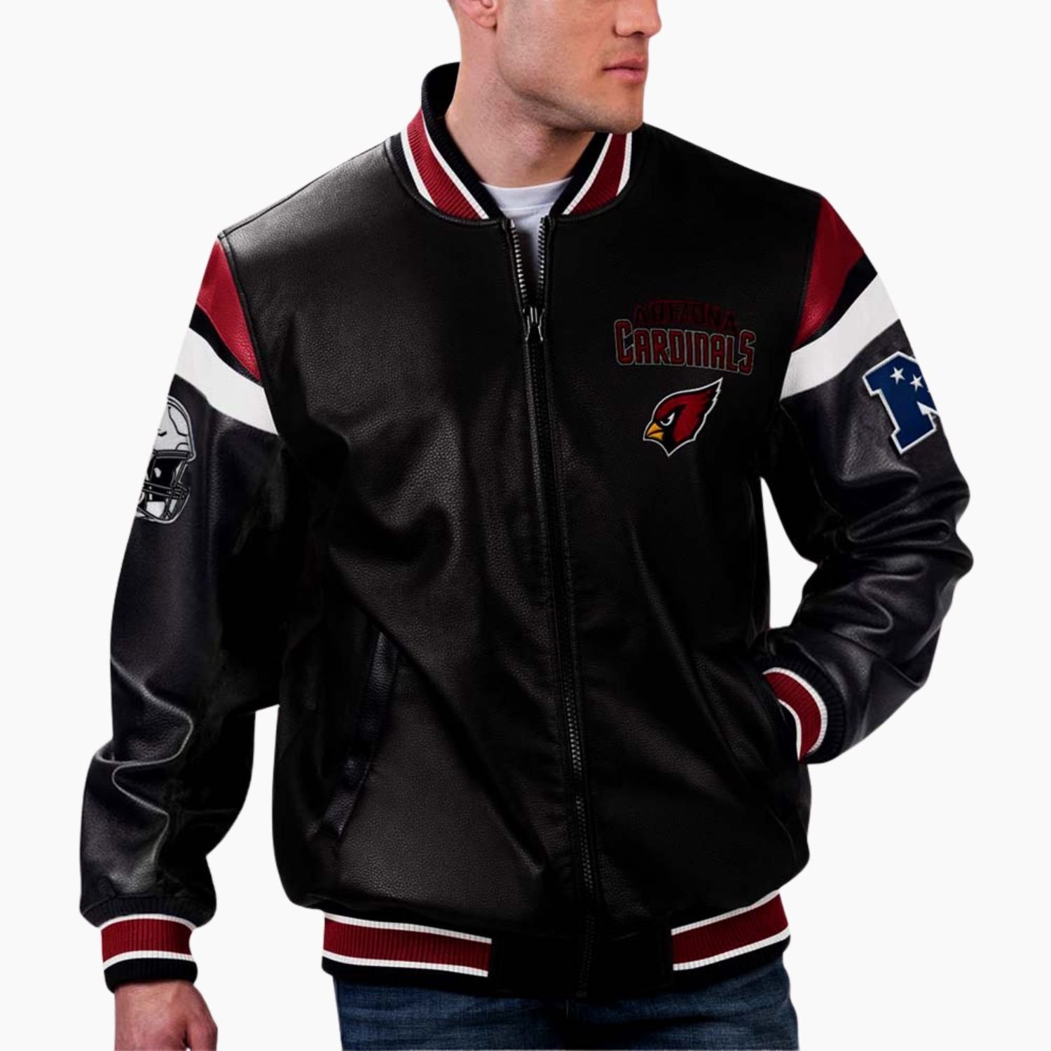 Ignite your passion for football with the NFL Arizona Cardinals Multicolor Varsity Leather Jacket, a premium piece of outerwear designed for those who demand excellence in their fan gear. This heavyweight bomber is a testament to superior craftsmanship, meticulously tailored from 100% premium genuine leather. The result is a jacket that offers a substantial, high-end feel and a resilient exterior that stands up to the elements while developing a unique character over time. While the primary color-blocked black design provides a sleek and modern aesthetic, the vibrant multicolor accents and iconic Cardinals details ensure your loyalty is visible from any distance. Inside, the jacket is finished with a soft viscose fabric lining, providing a smooth, breathable layer that ensures you stay comfortable from the first kickoff to the final whistle.