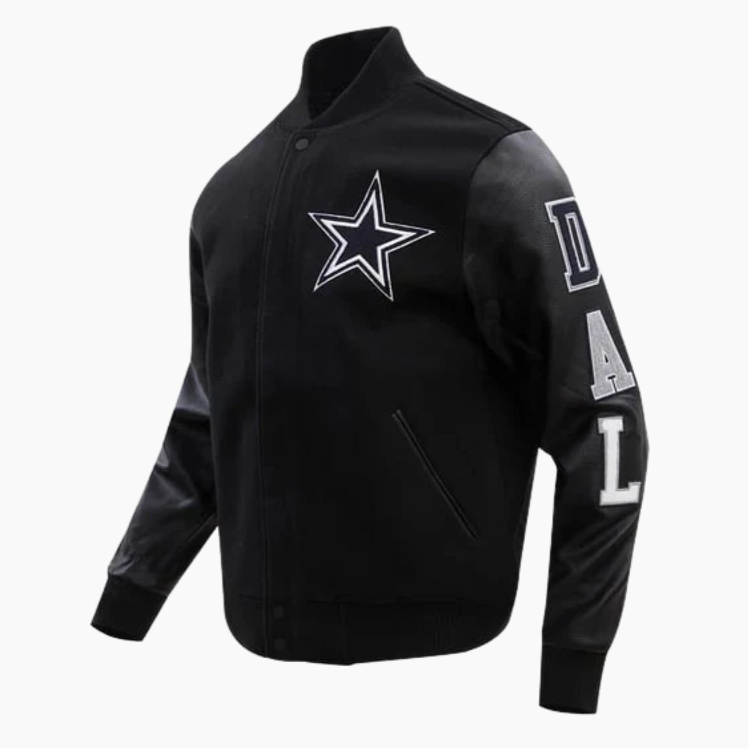 The visual identity of this jacket is rooted in authentic team heritage and modern street style. The Dallas Cowboys’ world-renowned star logos and graphics are applied using traditional DTF (Direct to Film) stickers, which provide high-definition clarity and vibrant silver and navy tones that stand out against the deep black base. These specialized accents are bonded to the material to resist cracking and peeling, ensuring the iconic star remains sharp for years to come. The classic varsity silhouette is enhanced by a striped, ribbed-knit baseball-style collar and matching cuffs. These elasticated details are not just for style; they provide a secure fit that helps retain body heat and maintains the jacket’s structured, athletic shape through every celebration.