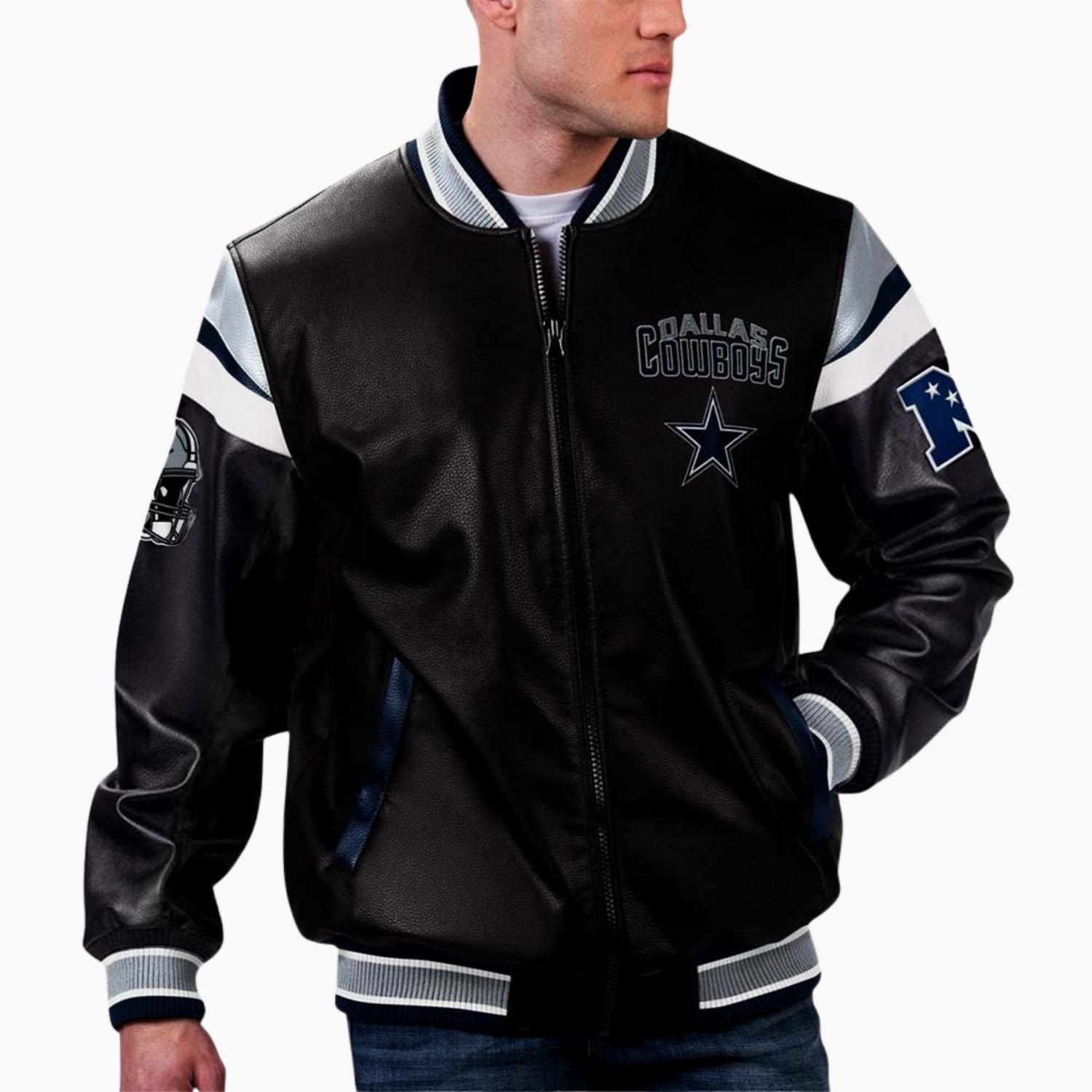 Every feature of this jacket is engineered for the modern supporter. The full-length leather sleeves offer rugged protection and a timeless look, while the high-quality front zipper closure provides a more secure and modern alternative to traditional snap buttons. For the fan on the go, we have integrated four strategic pockets: two exterior waist pockets to keep your hands warm and two hidden interior pockets to safeguard your smartphone, wallet, or season tickets. This isn’t just fan gear; it is a durable investment in your style that pays homage to the legendary Cowboy culture. Join the ranks of the most stylish fans in the league and elevate your wardrobe with this iconic piece of NFL history.