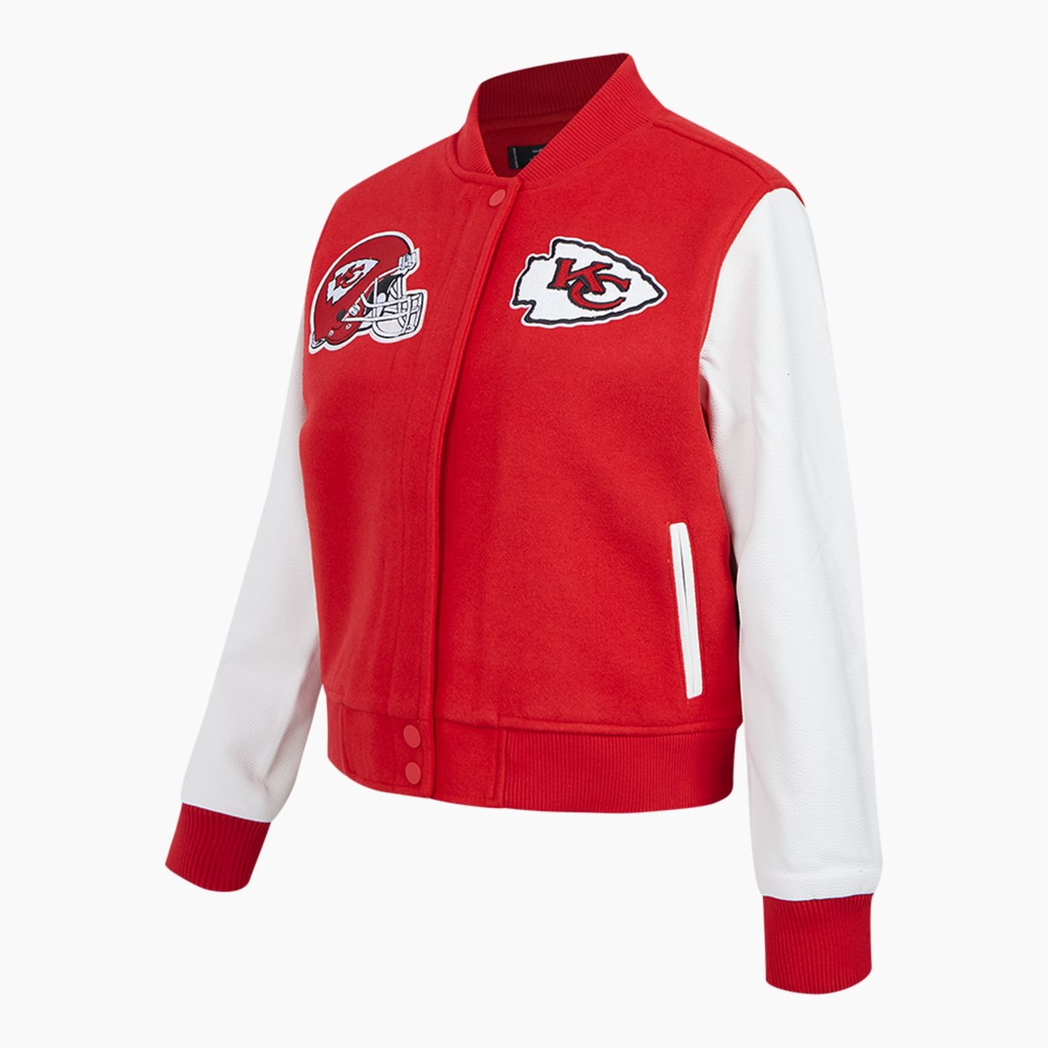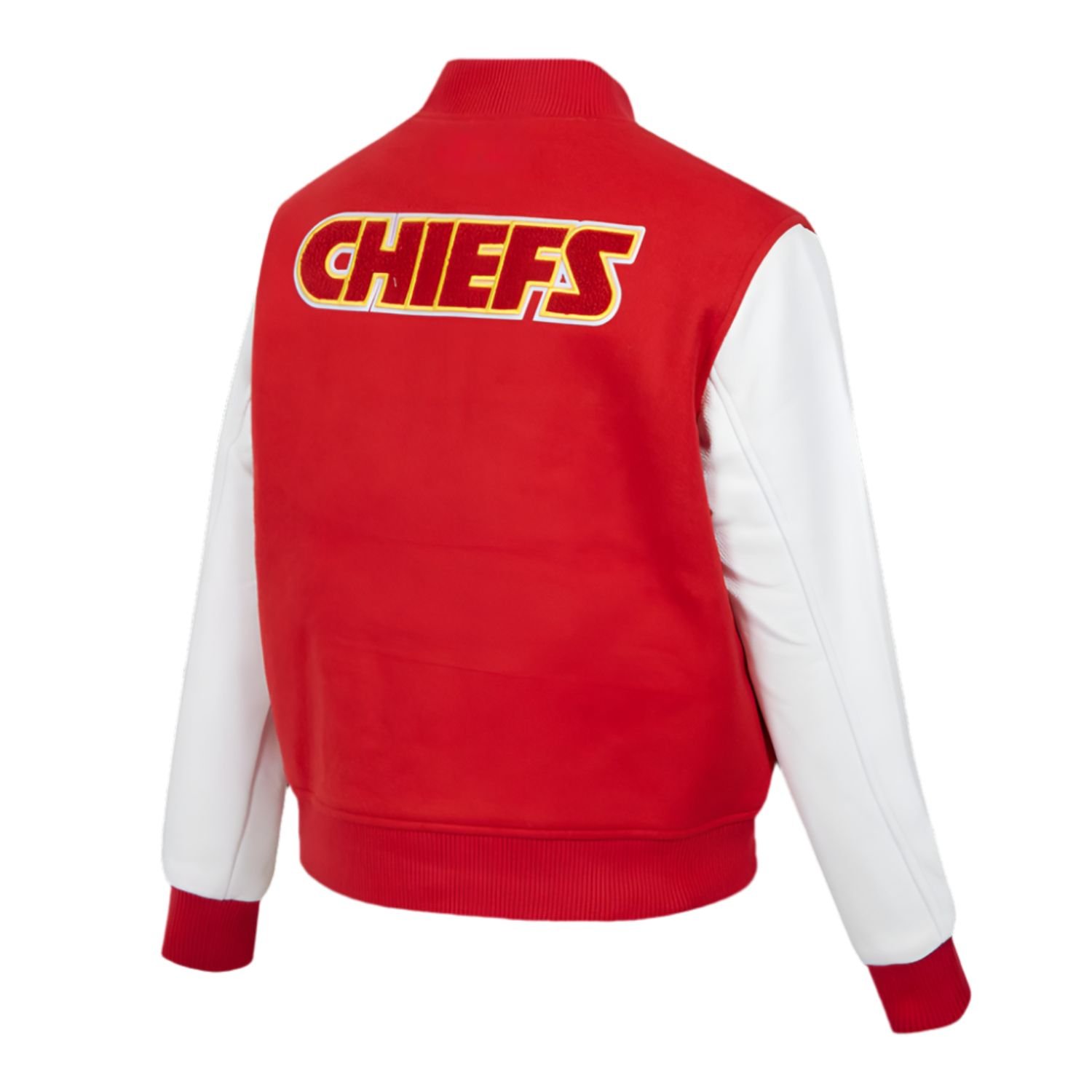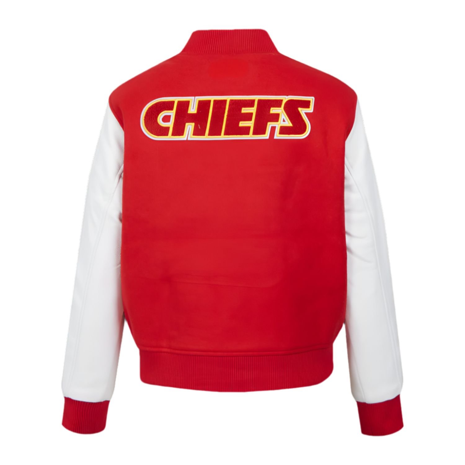 The visual identity of this jacket is a bold salute to the team’s heritage, utilizing the Inspired by palette of Chiefs Red, Gold, and White. The world-renowned arrowhead logos and team graphics are applied using traditional DTF (Direct to Film) stickers, which provide high-definition clarity and vibrant color saturation. These specialized accents are bonded to the material to resist cracking and peeling, ensuring your team pride remains sharp through every victory celebration. The traditional varsity silhouette is enhanced by a striped, ribbed-knit baseball-style collar and matching cuffs. These elasticated details are not just for style; they provide a secure fit that helps retain body heat and maintains the jacket’s structured, athletic shape.