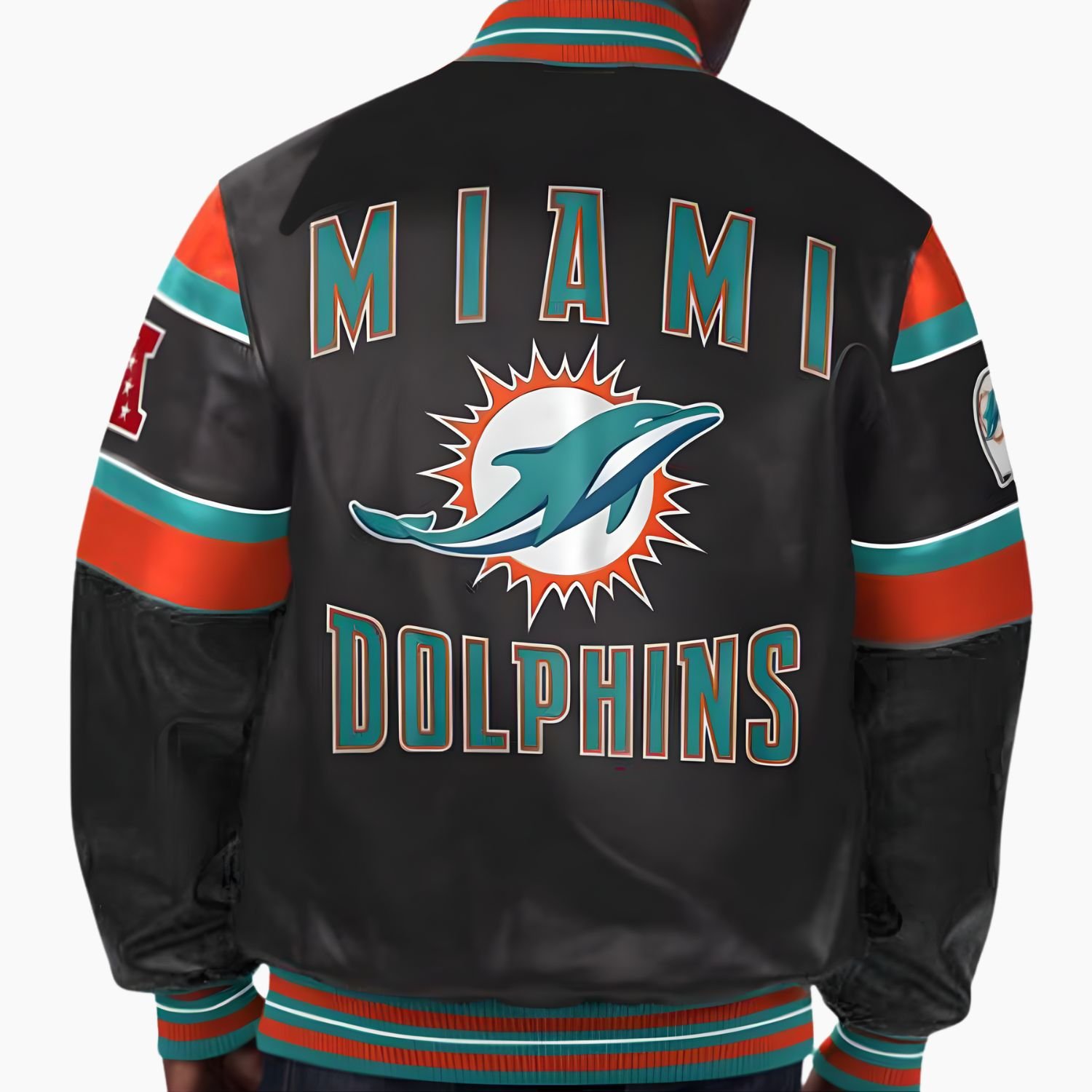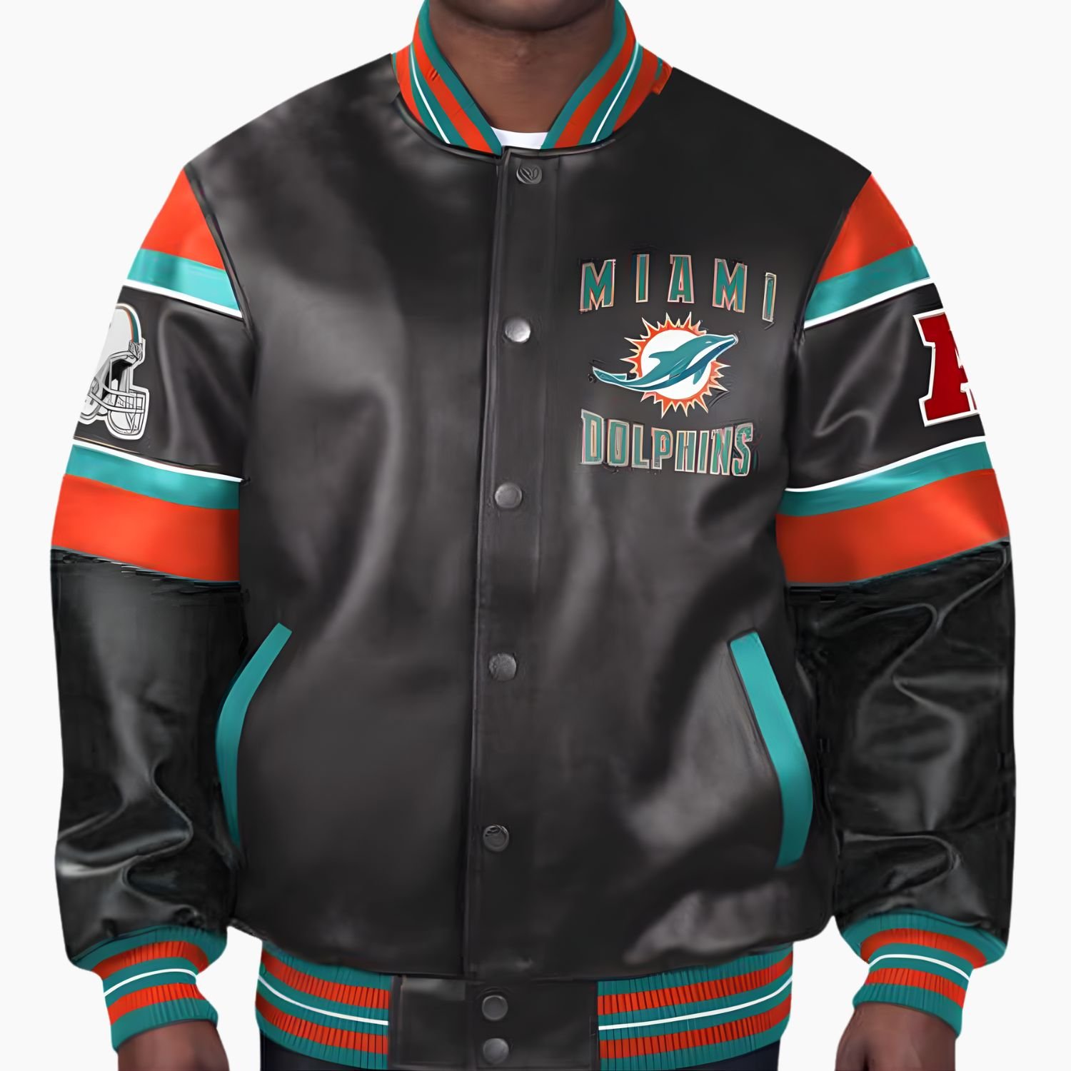 The NFL Miami Dolphins Multicolor Leather Jacket is a premium jacket designed for fans who want to display their team pride with style and confidence. Made from high-quality leather, this jacket offers a smooth, luxurious feel while providing long-lasting durability for regular wear. Its vibrant multicolor design perfectly combines classic leather craftsmanship with the Miami Dolphins’ iconic team colors.