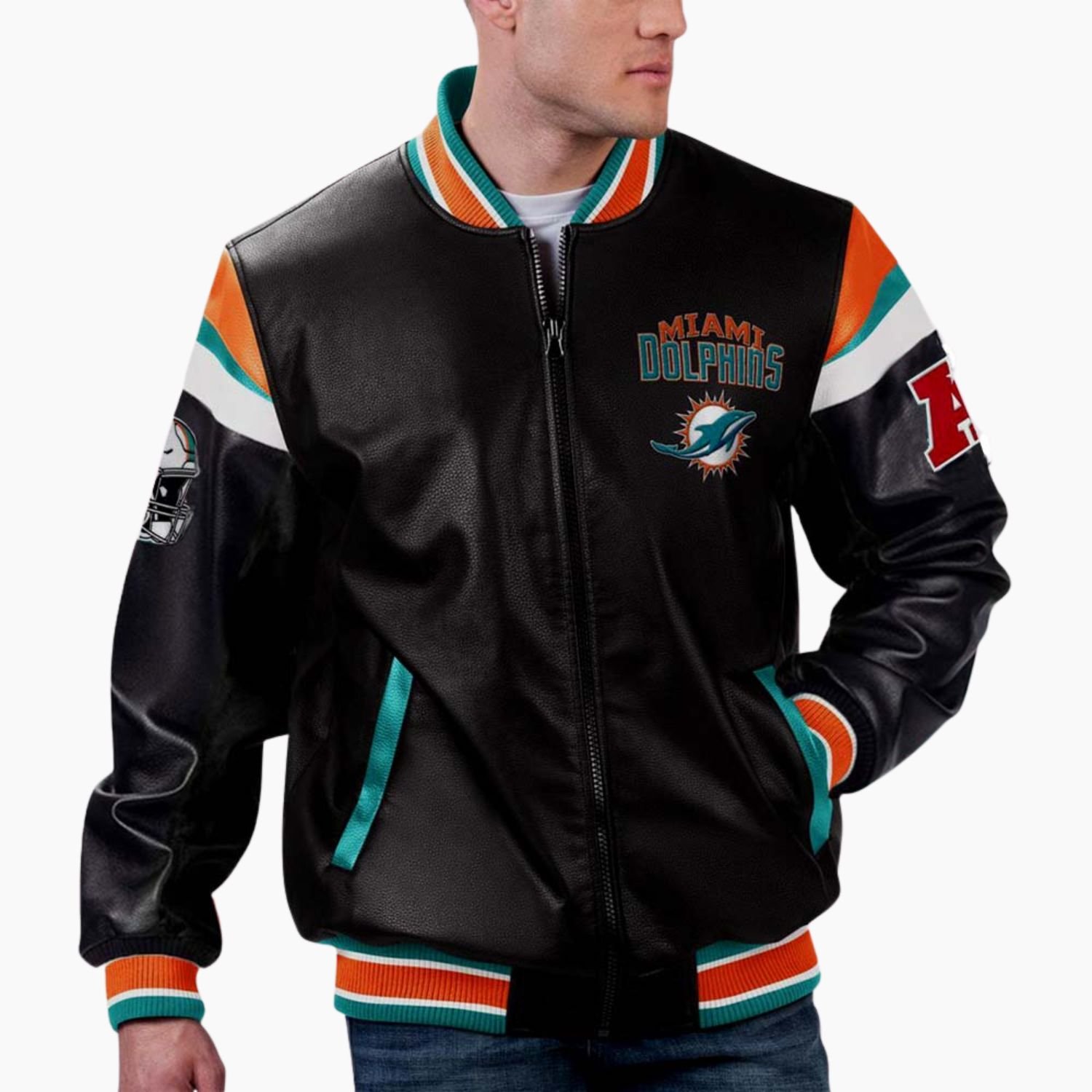 Infuse your winter wardrobe with the vibrant energy of South Florida with the Miami Dolphins Varsity Leather Jacket. This isn’t just an ordinary piece of sports apparel; it is a premium tribute to the only team in NFL history to achieve a perfect season. Designed for those who demand excellence in both their team and their attire, this jacket captures the refreshing aqua and orange hues that have defined the Dolphins’ legacy since 1966. Whether you are strolling down Ocean Drive or cheering from the stands at Hard Rock Stadium, this outerwear piece ensures your loyalty is displayed with unmatched sophistication.