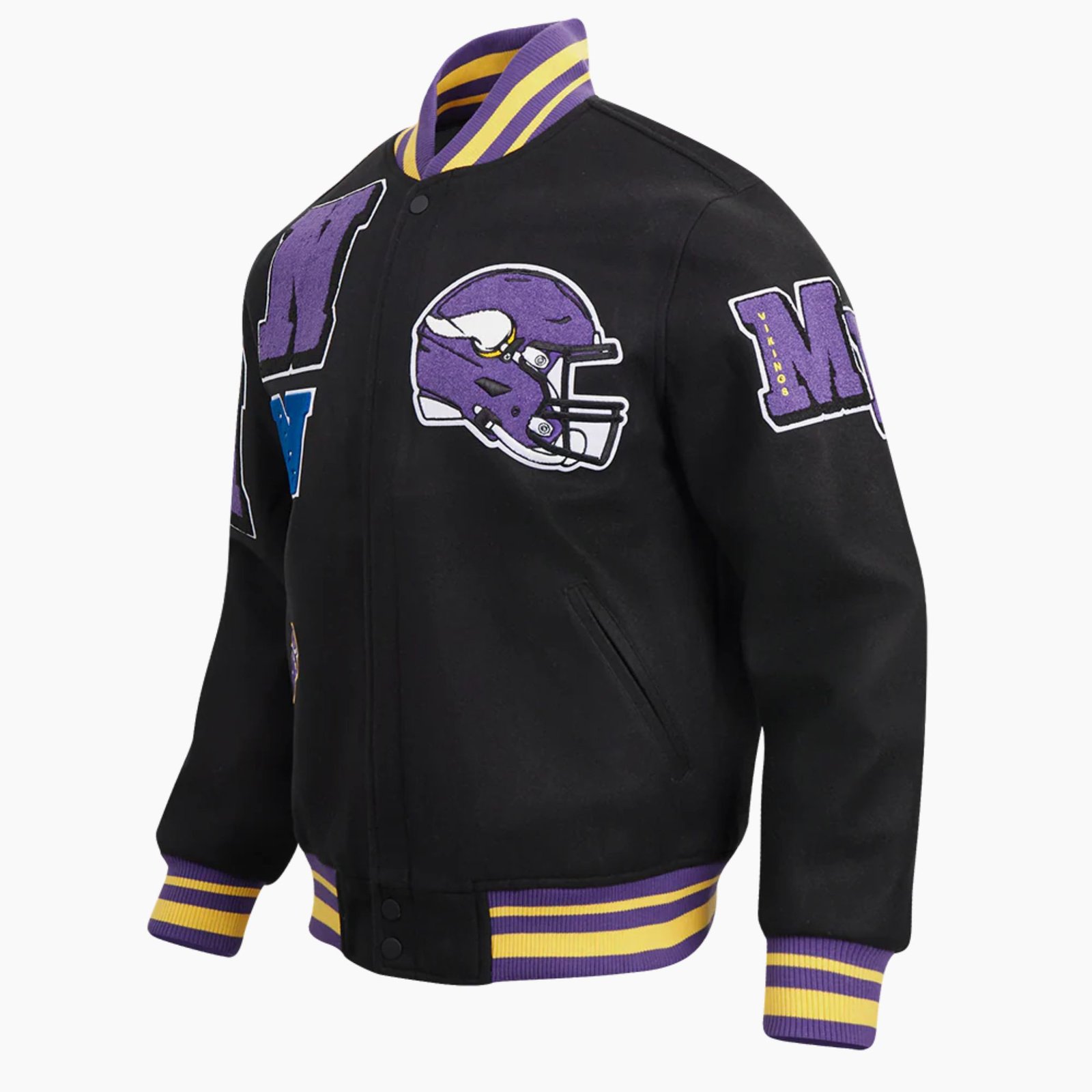This Minnesota Vikings varsity jacket by Movie Jackets Hub features detailed team graphics on the chest, back, and sleeves including the iconic helmet emblem, giving you a truly standout mashup design. With two side welt pockets and two inner pockets, it offers convenient storage without compromising style.
