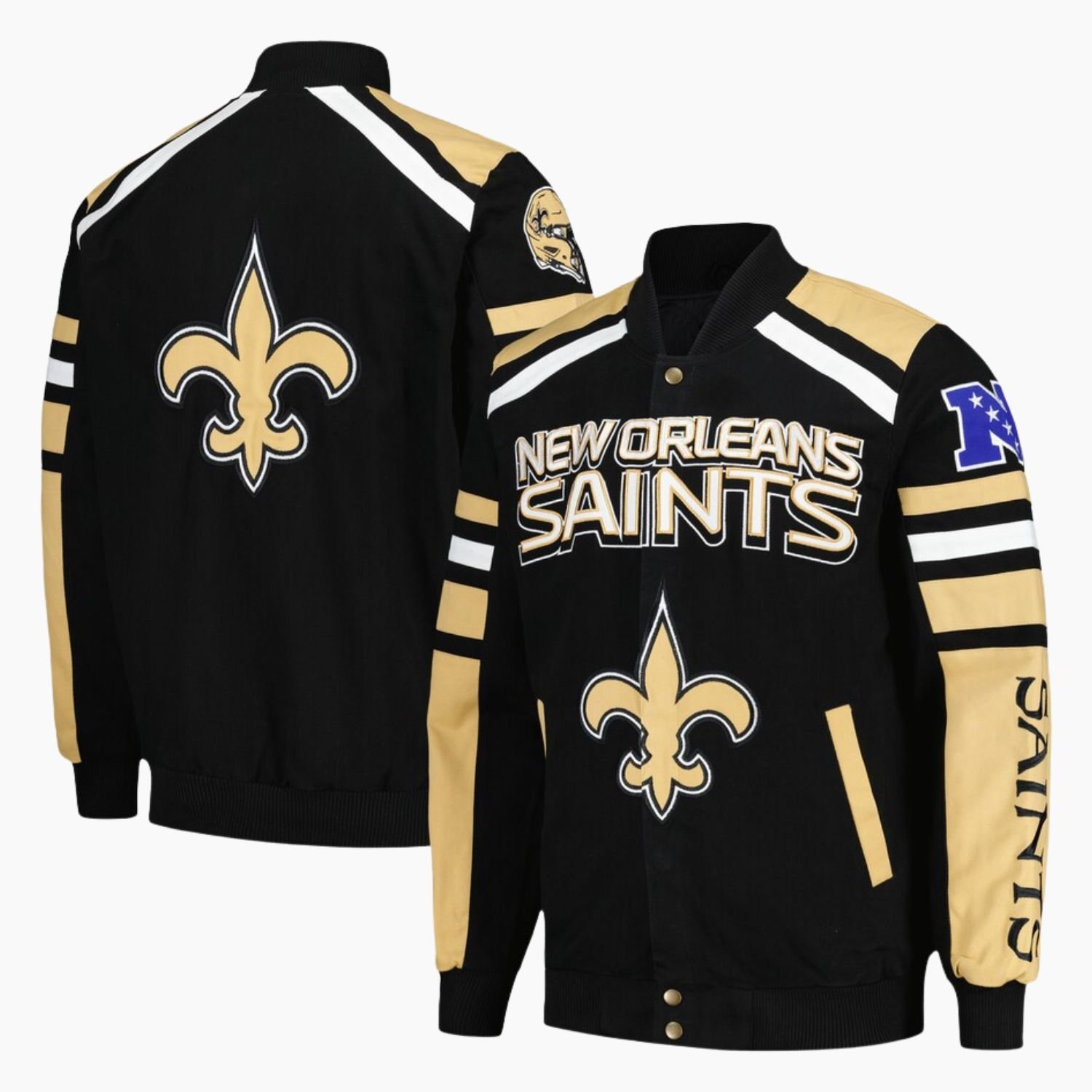 The unique full snap closure reinforced with an additional zipper offers practicality and security setting it apart from standard varsity jackets. Two exterior contrast lined pockets provide easy access storage while two inner pockets keep your valuables protected. Team lettering and logo details are prominently placed at the front back and sleeves giving the jacket a bold fan focused finish that Saints supporters will love.