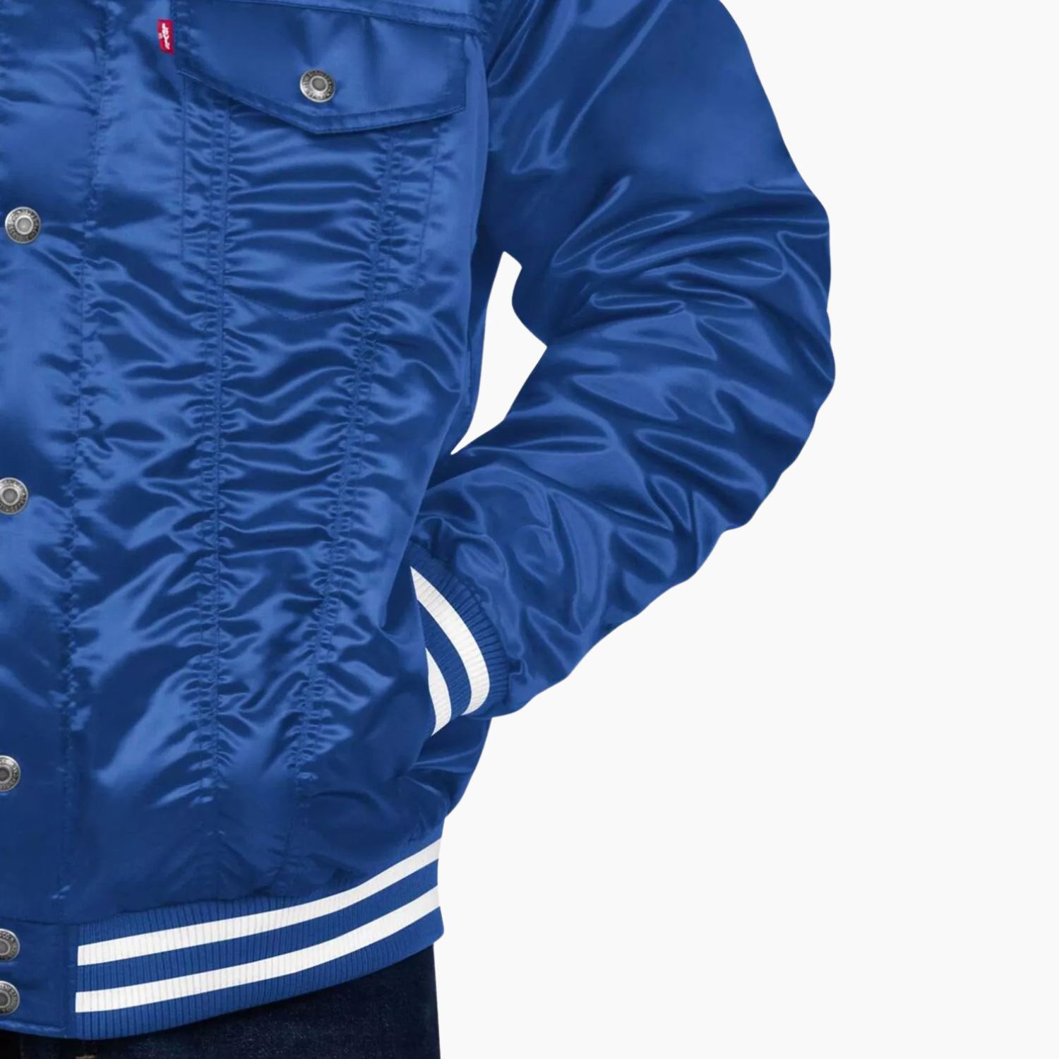 Crafted from high-quality satin, the jacket offers a smooth glossy finish while the soft quilted lining keeps you comfortable and warm. Its standing collar along with rib-striped cuffs and hemline provide a structured fit and timeless varsity look. Full snap tab button closure adds convenience and enhances the jacket’s retro-inspired aesthetic.