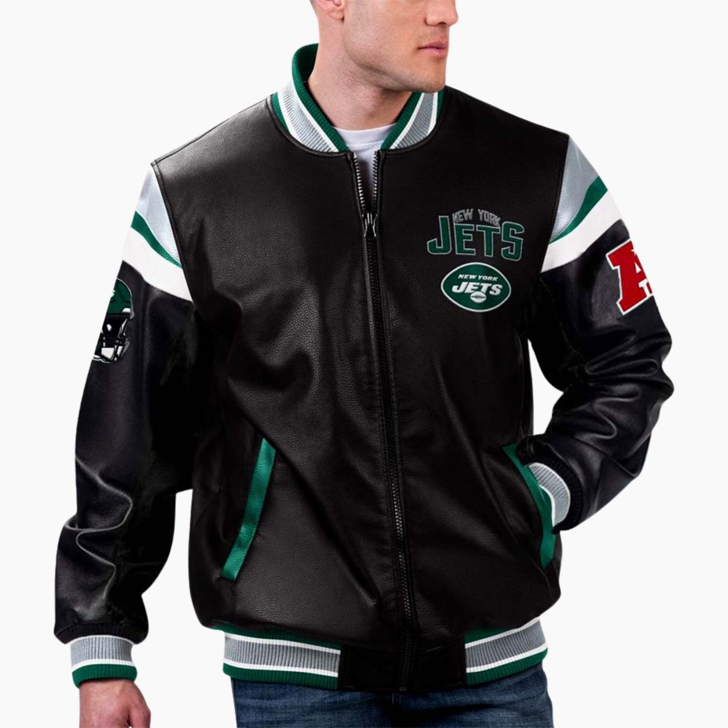 Whether paired with jeans sneakers or layered over casual outfits, the NFL New York Jets Multi Varsity Leather Jacket offers versatile styling options. It is an ideal choice for fans looking to represent their team in a fashionable and confident way.