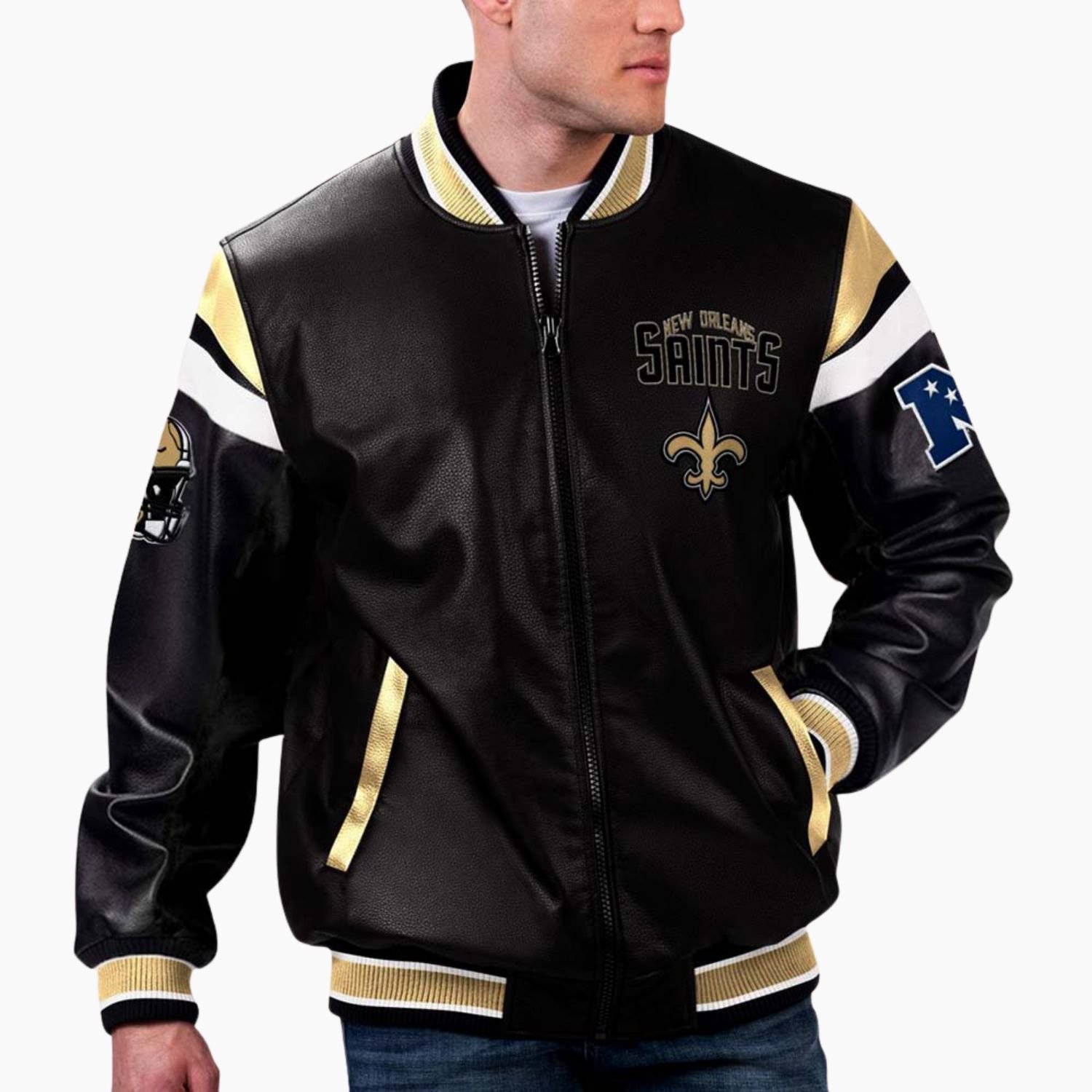Celebrate the vibrant culture and resilient spirit of New Orleans with the NFL New Orleans Saints Multicolor Varsity Leather Jacket. This isn’t just a piece of outerwear; it’s an invitation to join the legendary “Who Dat Nation” in style. Meticulously crafted from 100% premium genuine leather, this heavyweight bomber offers a substantial feel and a lustrous finish that captures the opulence of the team’s signature gold and black colors. The sophisticated color-blocked black foundation provides a sleek, modern canvas for the iconic fleur-de-lis and team branding, making it a versatile staple for both the electric atmosphere of the Caesars Superdome and the lively streets of the French Quarter. To ensure you stay comfortable through every touchdown and second-line dance, the interior is finished with a soft viscose fabric lining that provides a smooth, breathable layer against the skin.