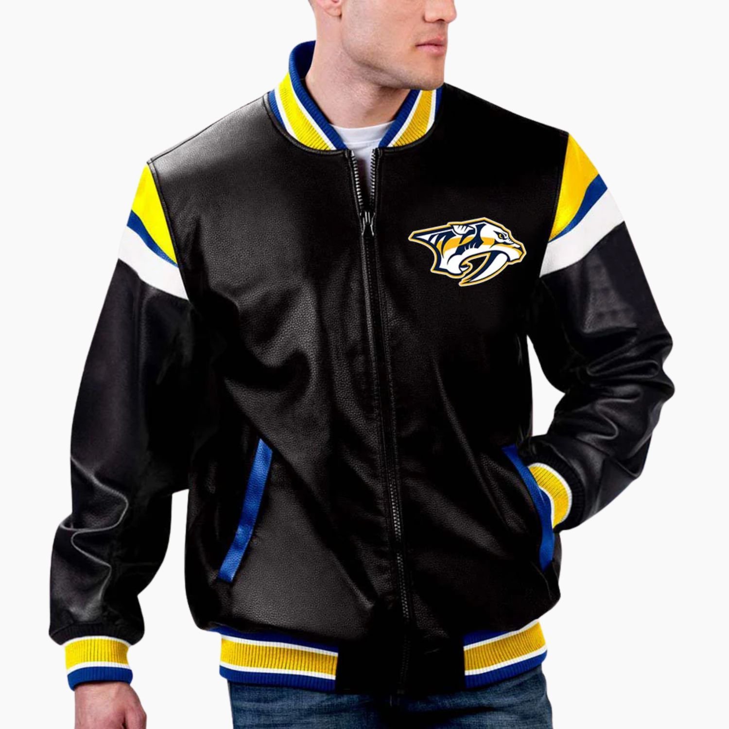 This Nashville Predators leather jacket by Movie Jackets Hub features a full front zipper closure that gives you easy wearability and a clean varsity inspired appearance. The ribbed collar delivers a classic sports jacket finish, while the full length sleeves with ribbed cuffs add both structure and comfort. With two practical side pockets, you can keep essentials close while maintaining a sharp and athletic style.
