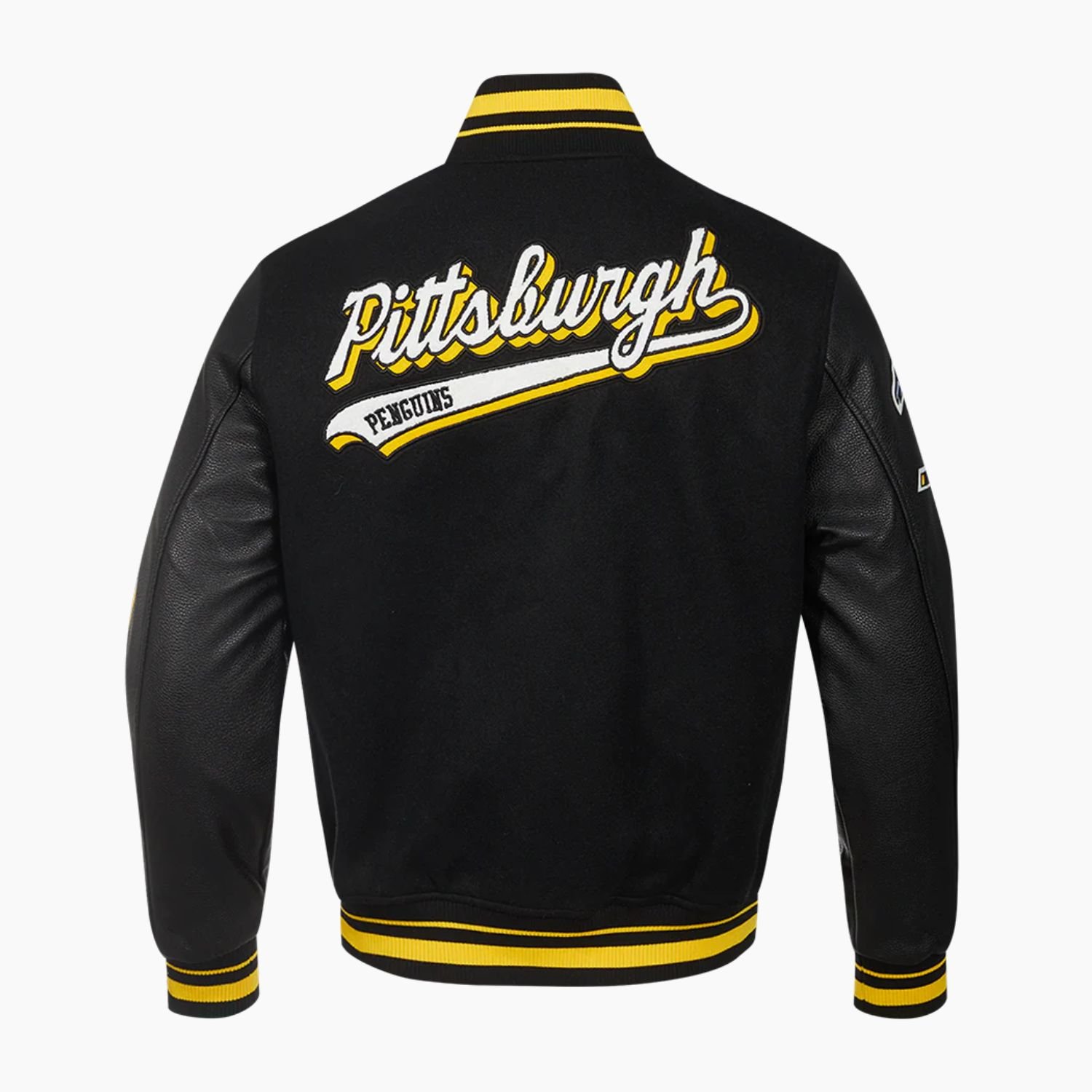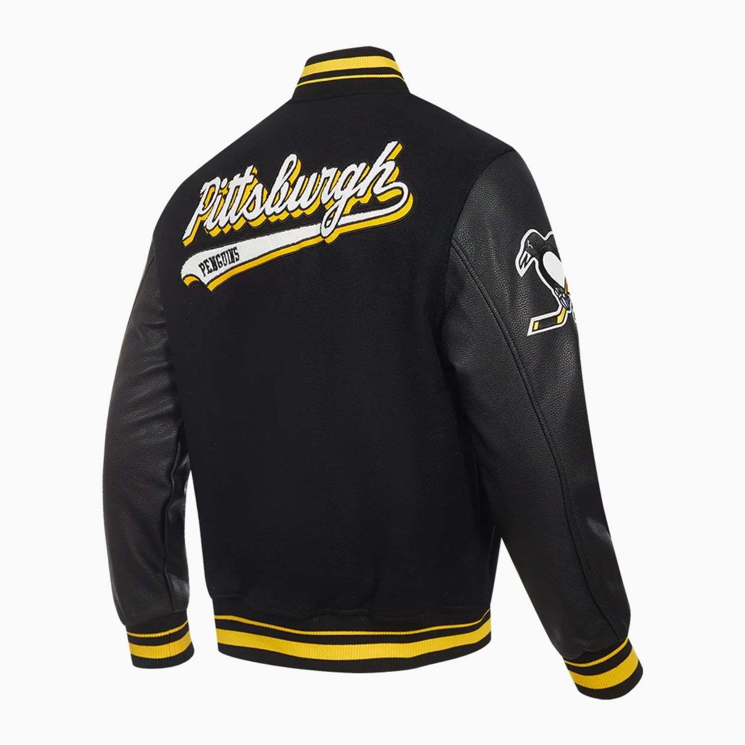 Show your true fan pride with the NHL Pittsburgh Penguins Script Tail Mens Rib Wool Varsity Jacket. Designed for comfort and style, this jacket combines classic varsity aesthetics with high-quality materials, making it perfect for game day, casual outings, or your everyday wardrobe.