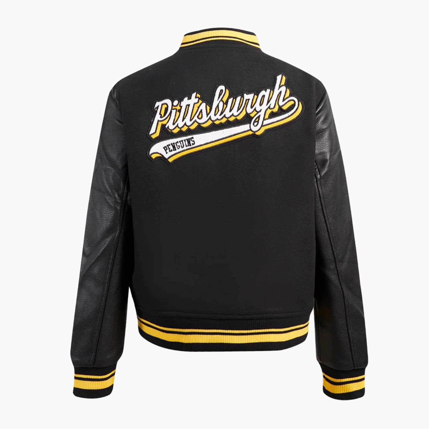 Show off your Penguins pride in style with the NHL Pittsburgh Penguins Script Tail Womens Wool Varsity Jacket. This classic varsity jacket blends timeless design with premium quality materials, making it perfect for game days, casual outings, or everyday wear.