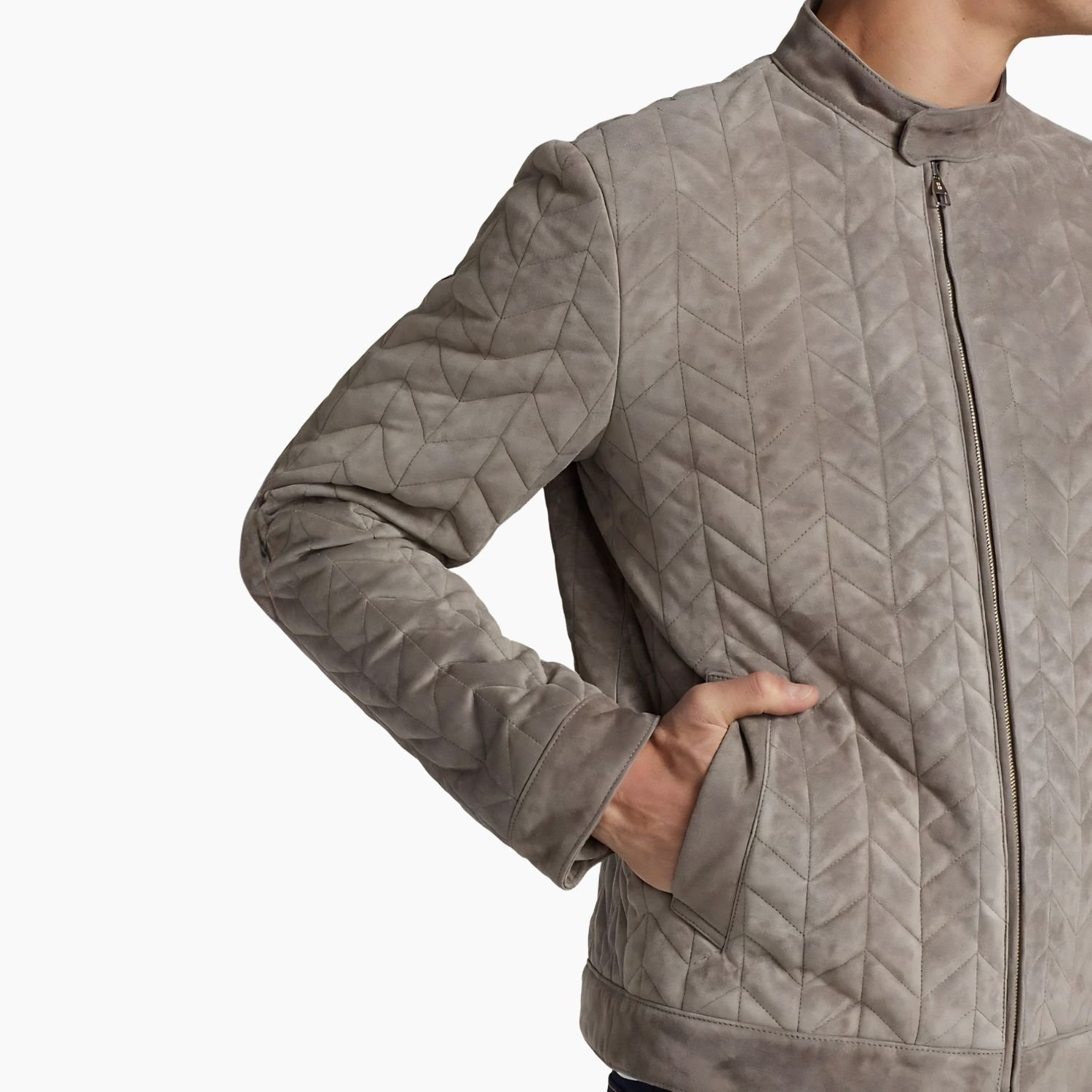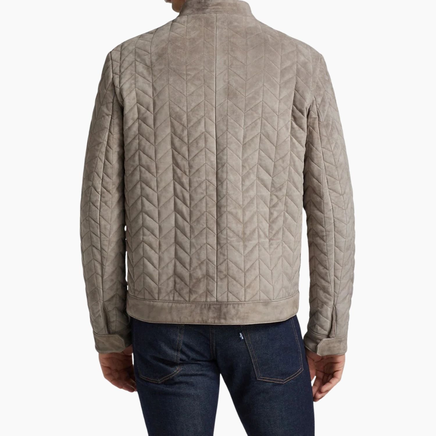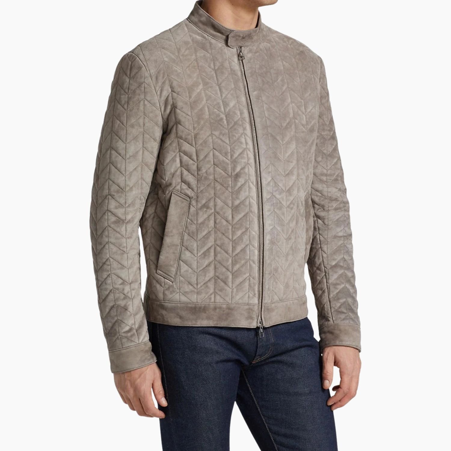 Elevate your outerwear collection with this exquisite Padded Real Suede Biker Leather Jacket, featuring embossed chevron quilting that adds a touch of textural refinement to its sleek silhouette. Designed for both style and functionality, this jacket is a must-have for those who appreciate sophistication in their wardrobe.