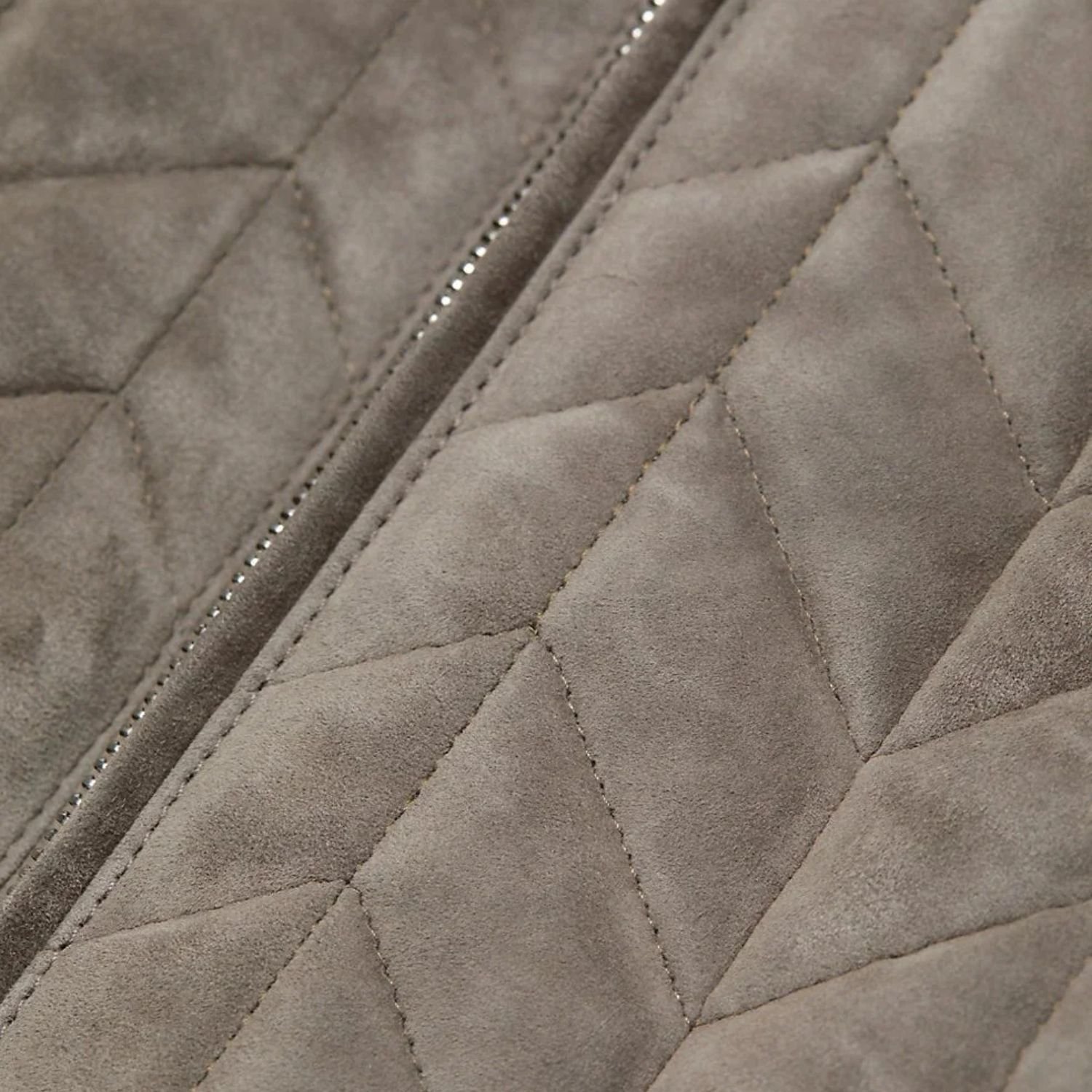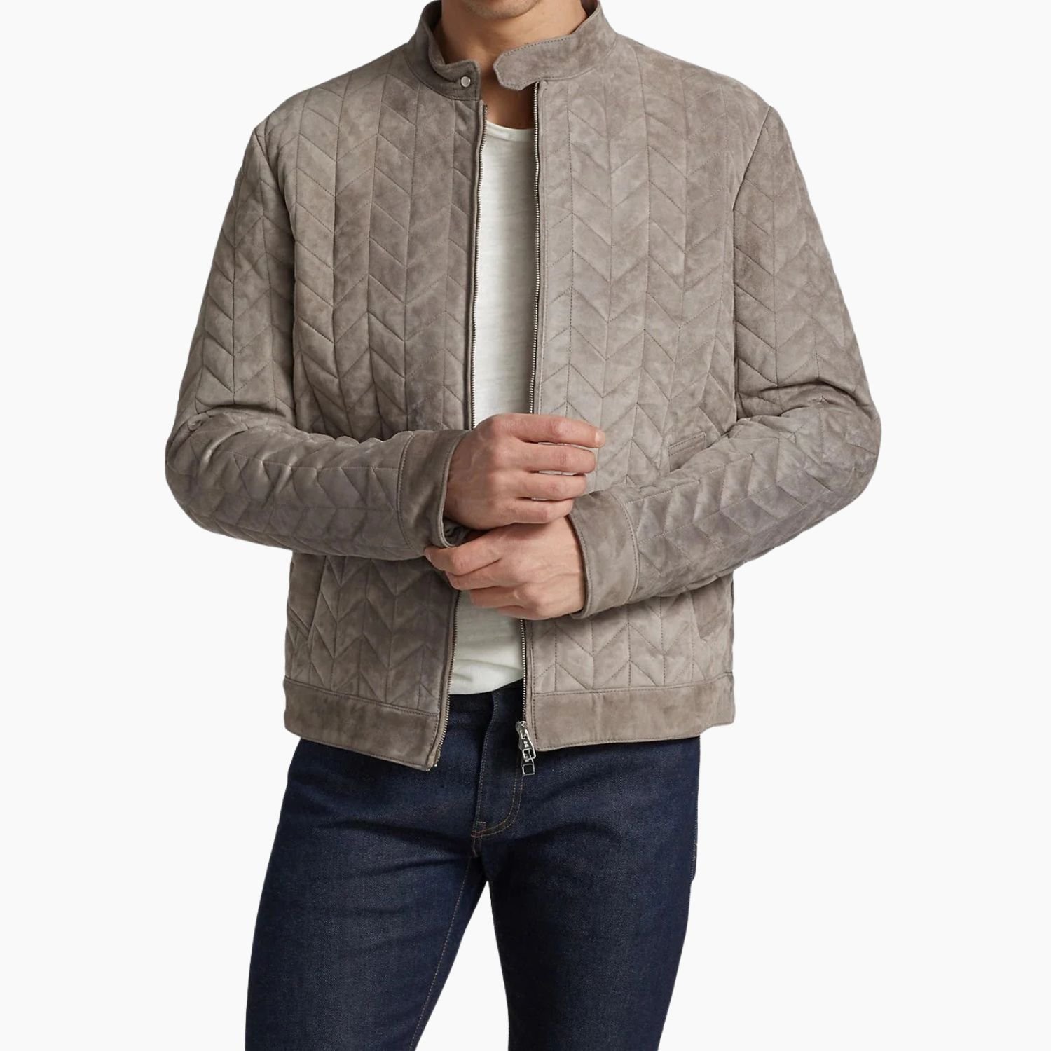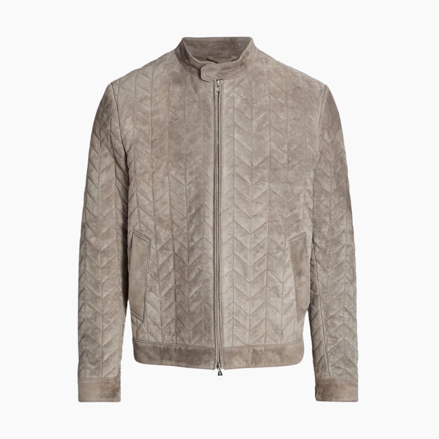 Elevate your outerwear collection with this exquisite Padded Real Suede Biker Leather Jacket, featuring embossed chevron quilting that adds a touch of textural refinement to its sleek silhouette. Designed for both style and functionality, this jacket is a must-have for those who appreciate sophistication in their wardrobe.