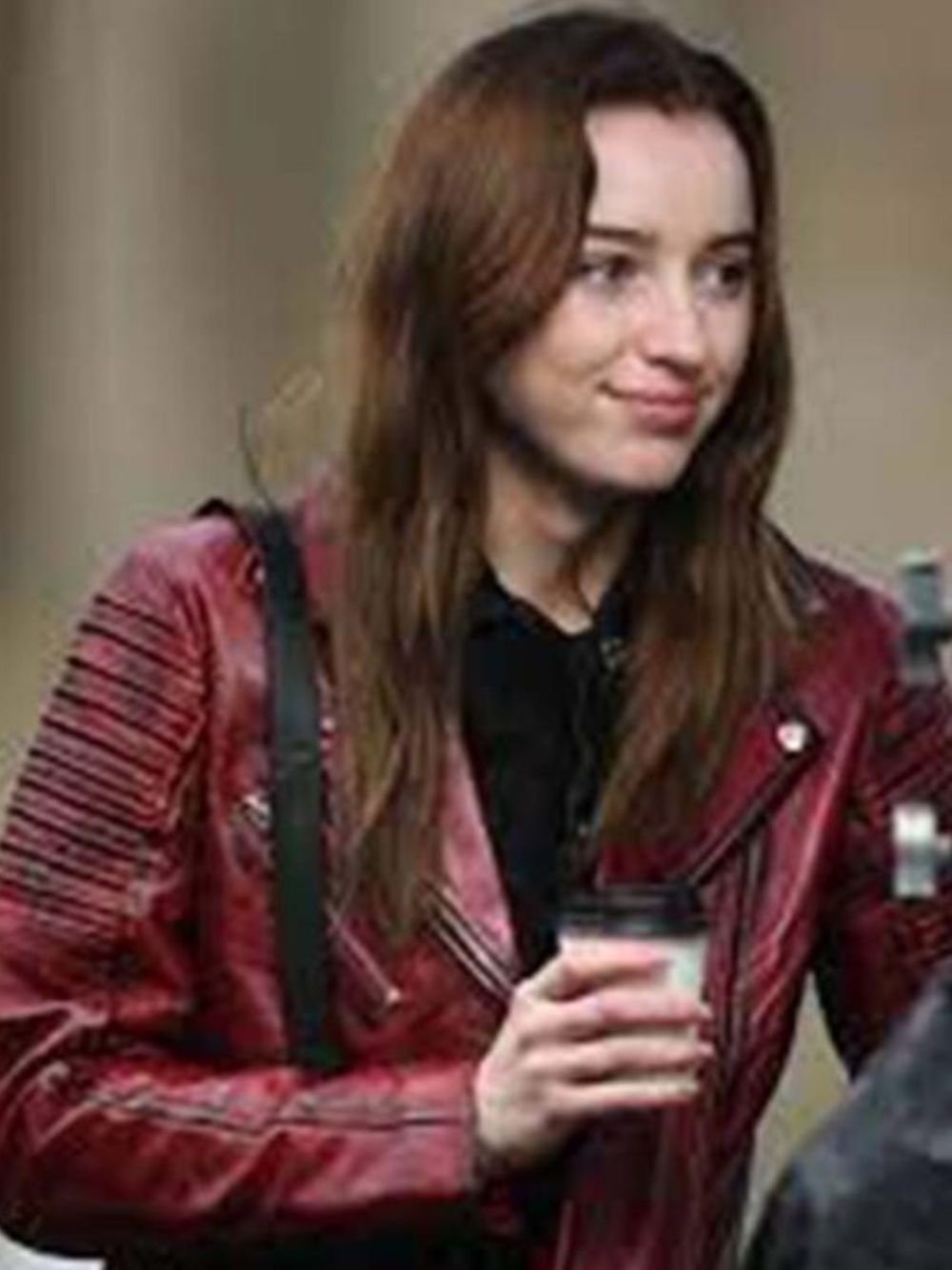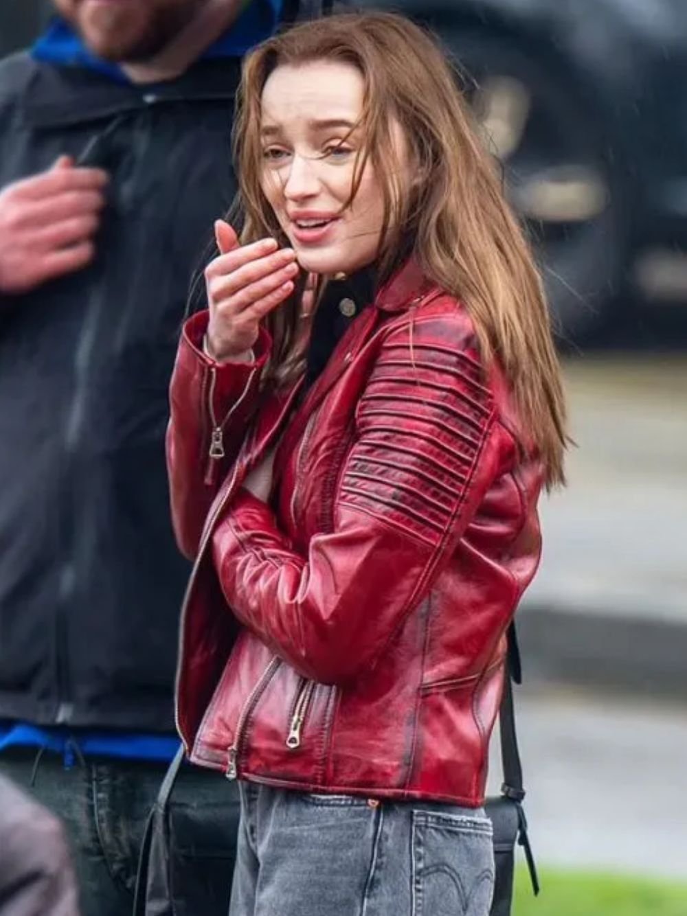 Alexandra Bank Of Dave Movie 2023 Phoebe Dynevor Red Biker Leather Jacket