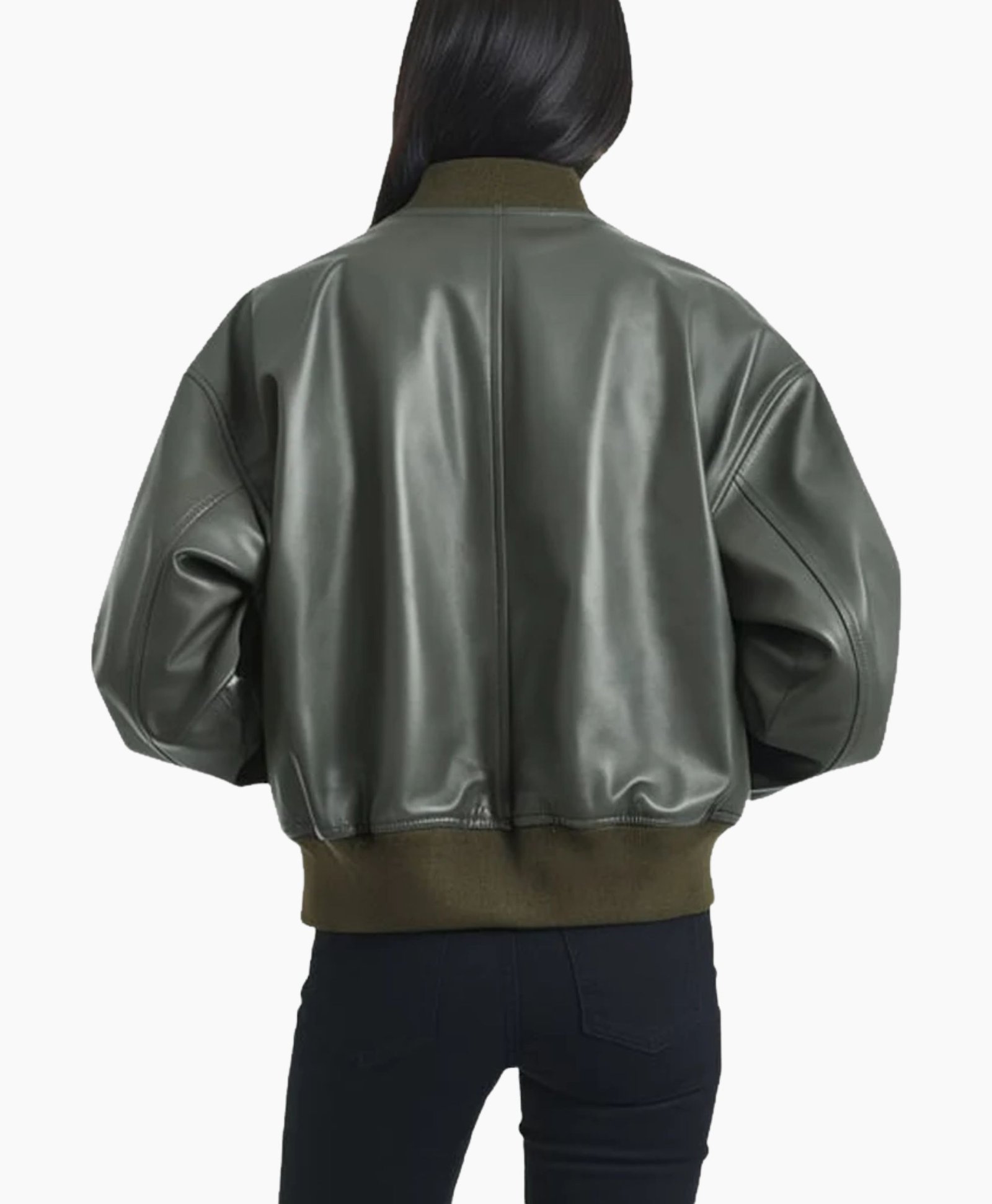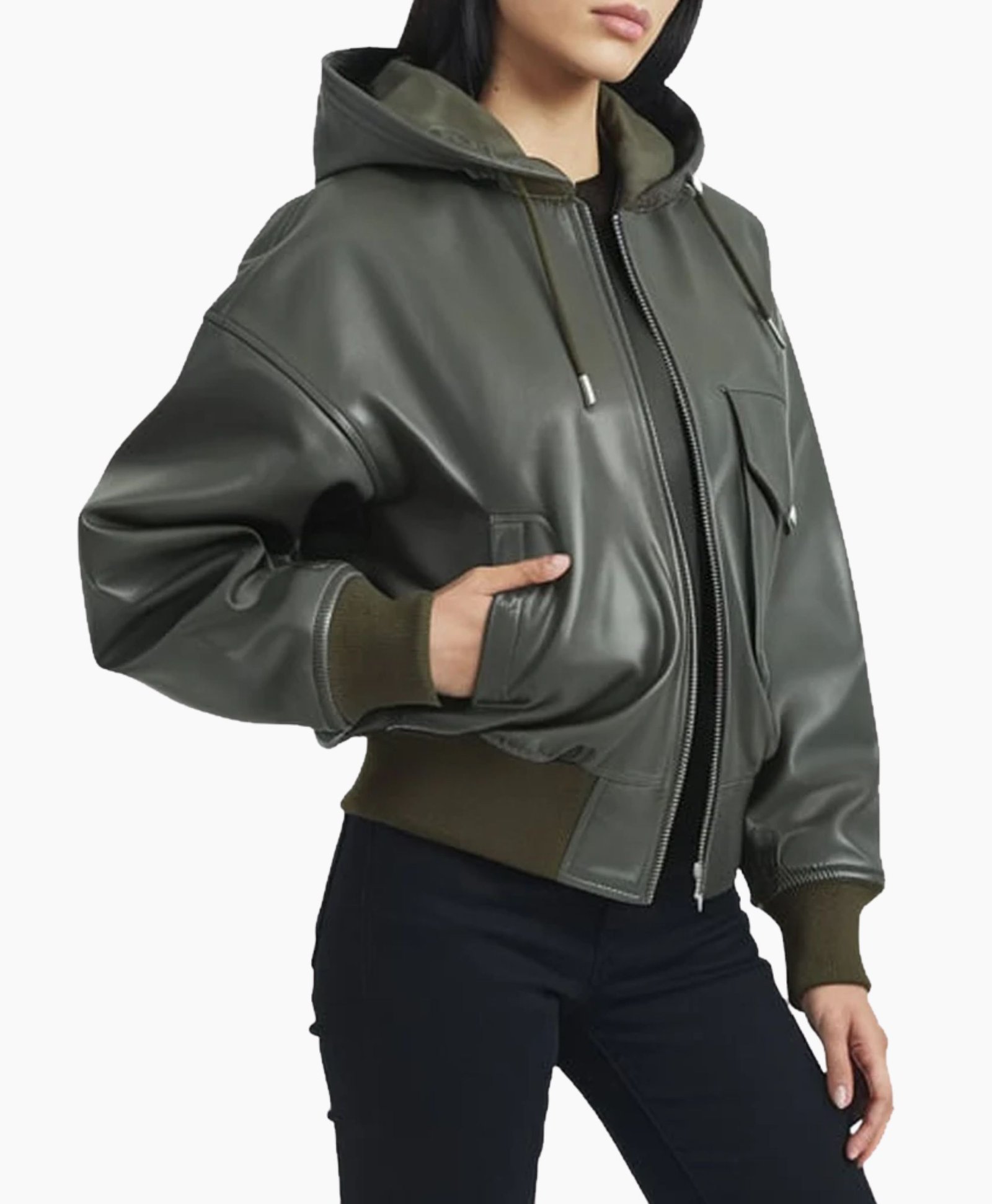 Premium Women’s Olive Green Leather Bomber Jacket With Hood
