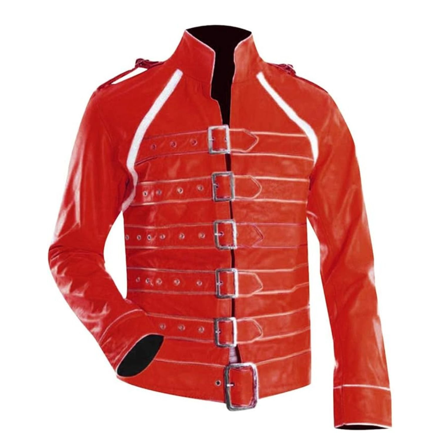 Queen Rock Band Military Red Jacket by Movie Jackets Hub has made with the synthetic leather material. This is considered as the best material of leather. It has viscose lining stitched inside to make it relatable. The military red jacket provides the most fashionable design like in the front of the jacket it has six belts for closing. Its specifications include an easy stand-up collar and open hem cuffs with full sleeves. The Freddie Mercury wore this jacket at the time of sing a song. Queen Rock Band Military Red Jacket has buckles on the shoulders. The buckle is a device used for fastening unfastened ends, with one cease attached to it and the opposite held by way of a trap in a comfortable but adjustable manner. Its red color makes it a more stylish and classic.
