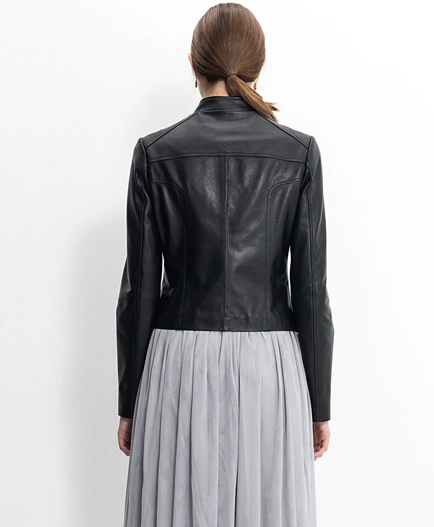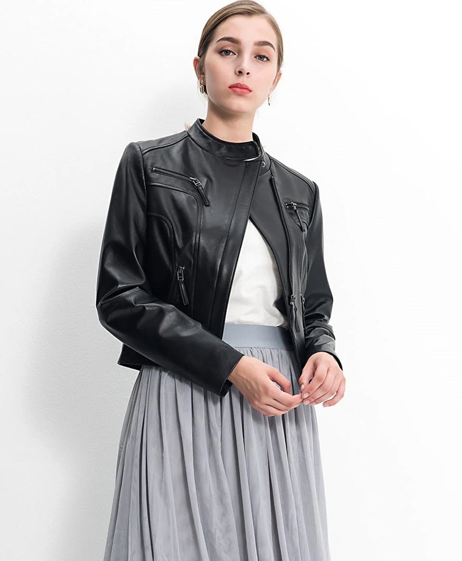 This everyday leather jacket is designed to be effortlessly stylish. Whether you pair it with jeans for a casual look or layer it over a dress for a chic vibe, it adapts to your style needs. Perfect for transitional weather, this jacket is your go to outerwear for all seasons.