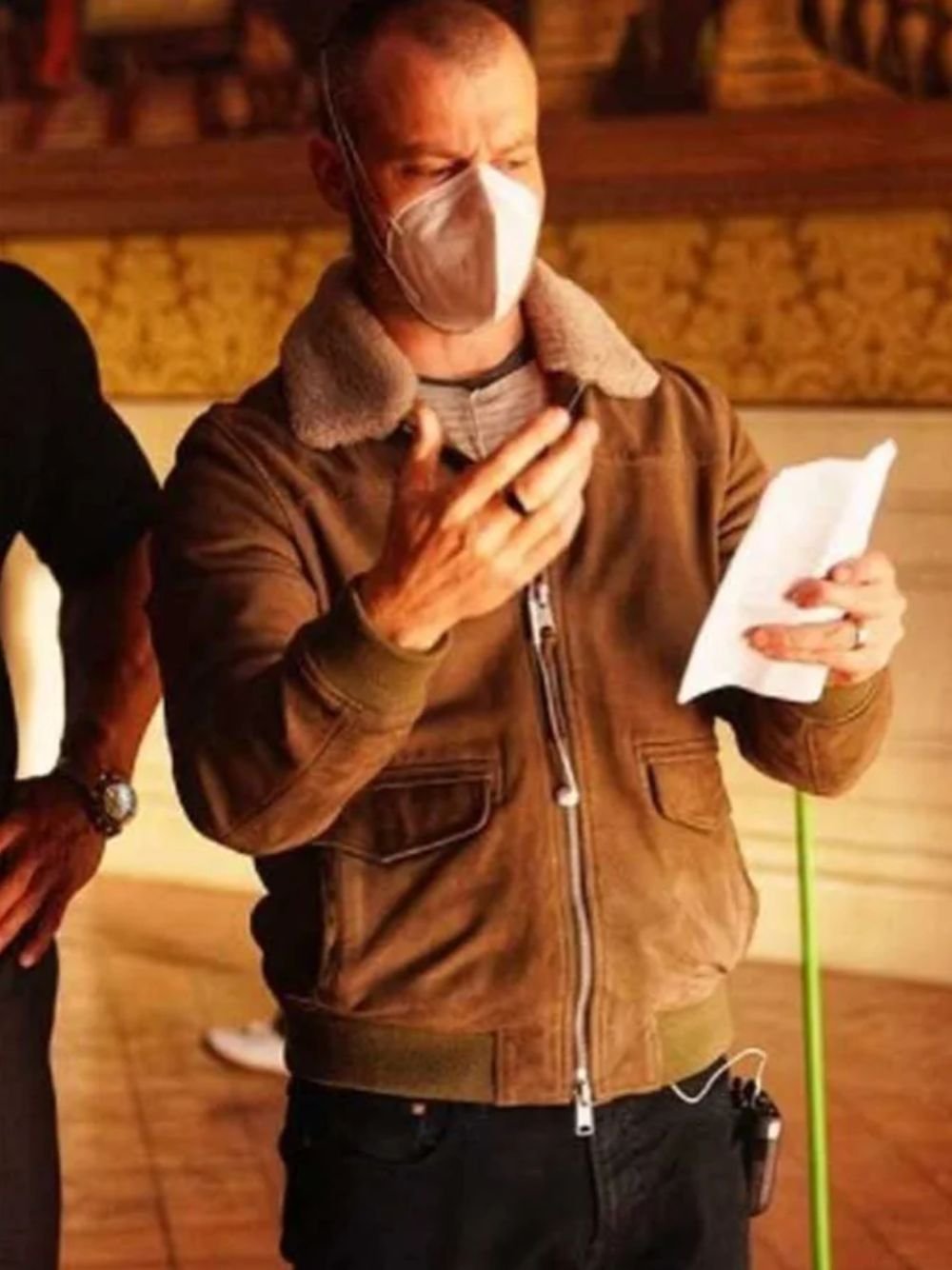 Rawson Marshall Thurber Movie Red Notice Brown Suede Leather Fur Collar Bomber Jacket