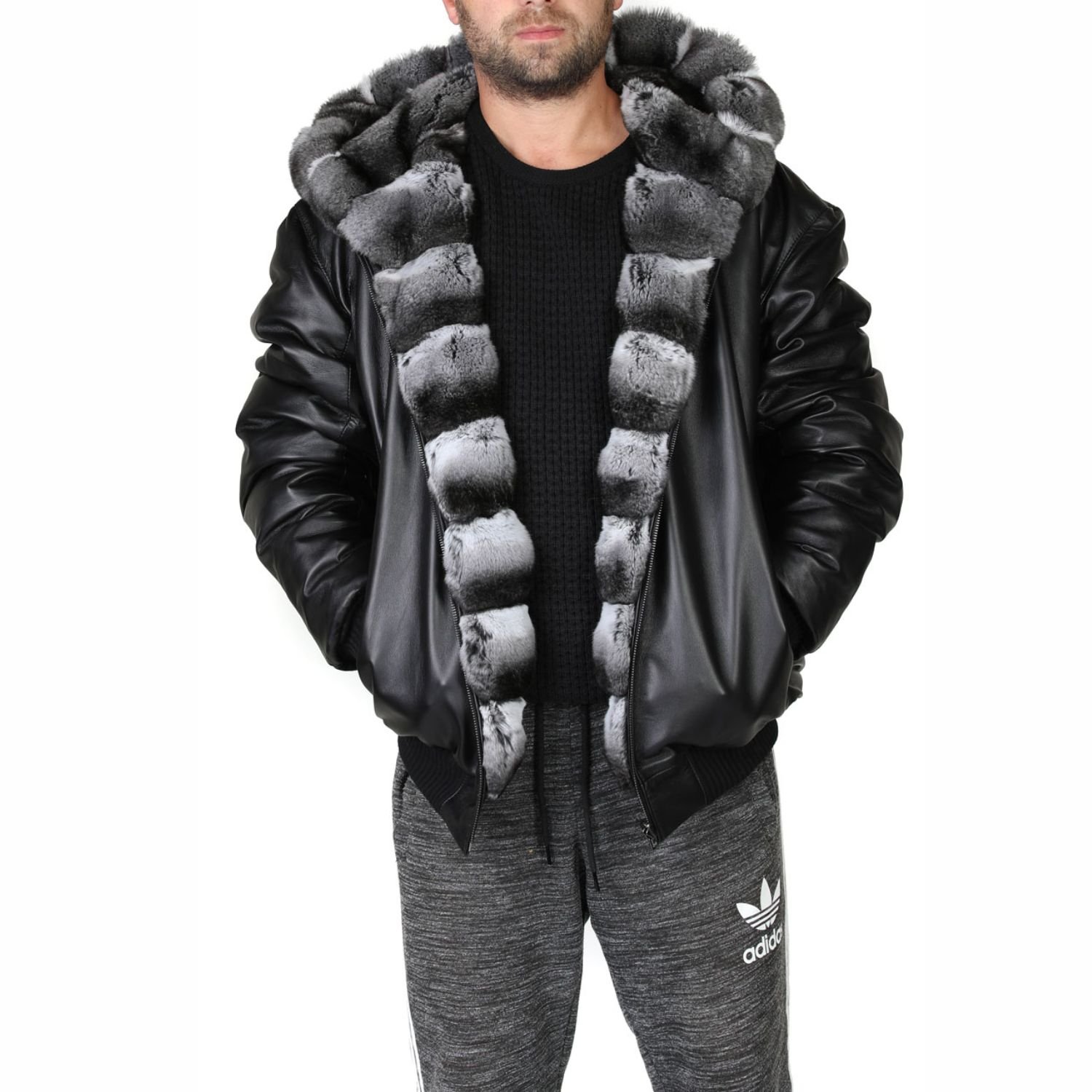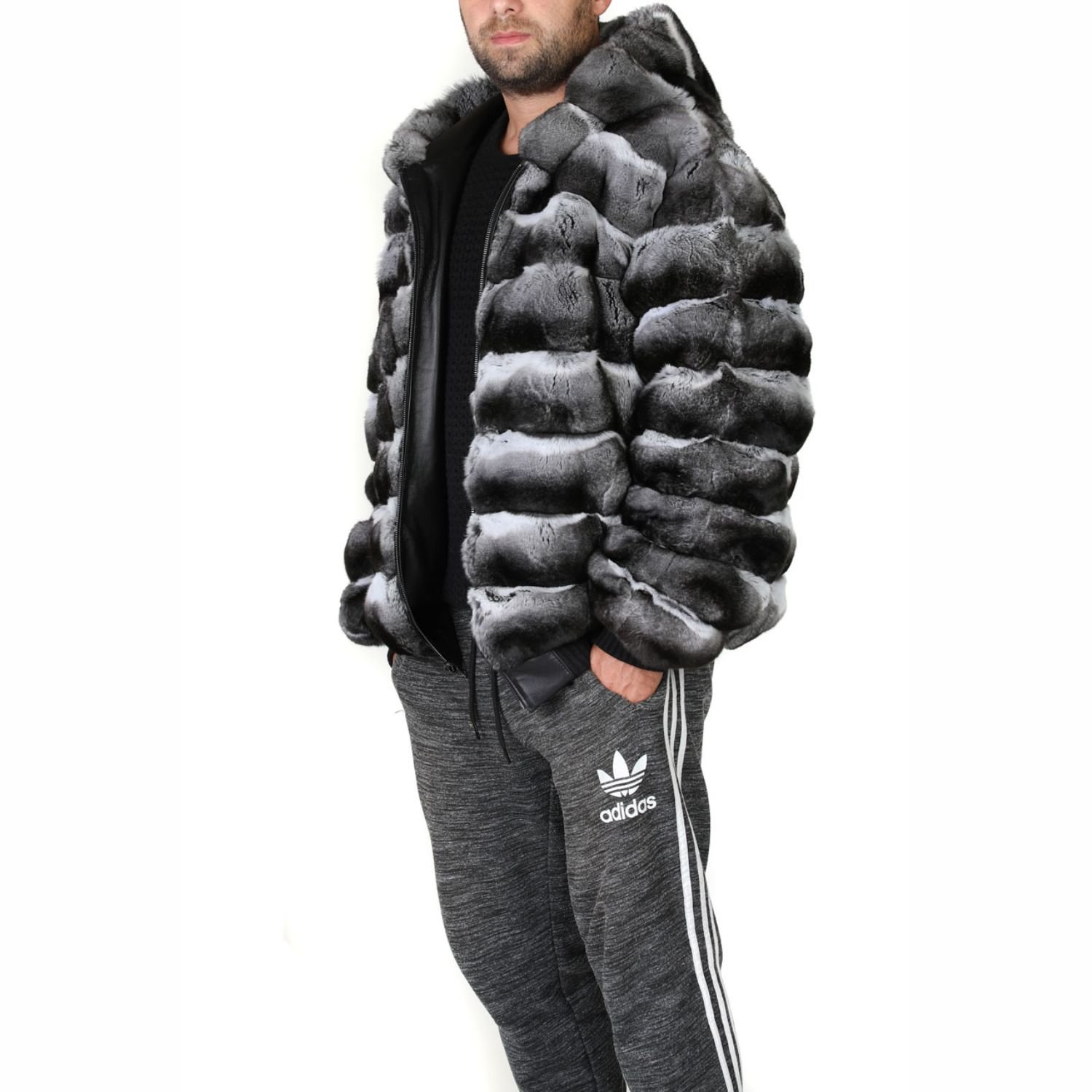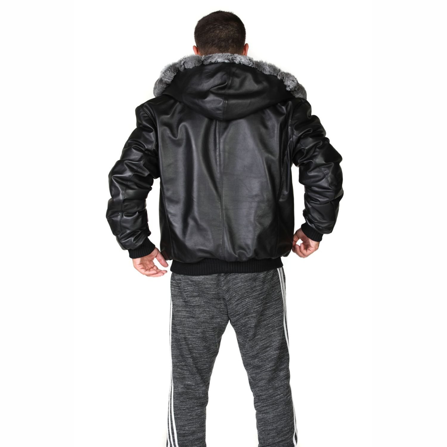 Reversible Hooded Chinchilla Fur Black Leather Bomber Jacket For Winter Season