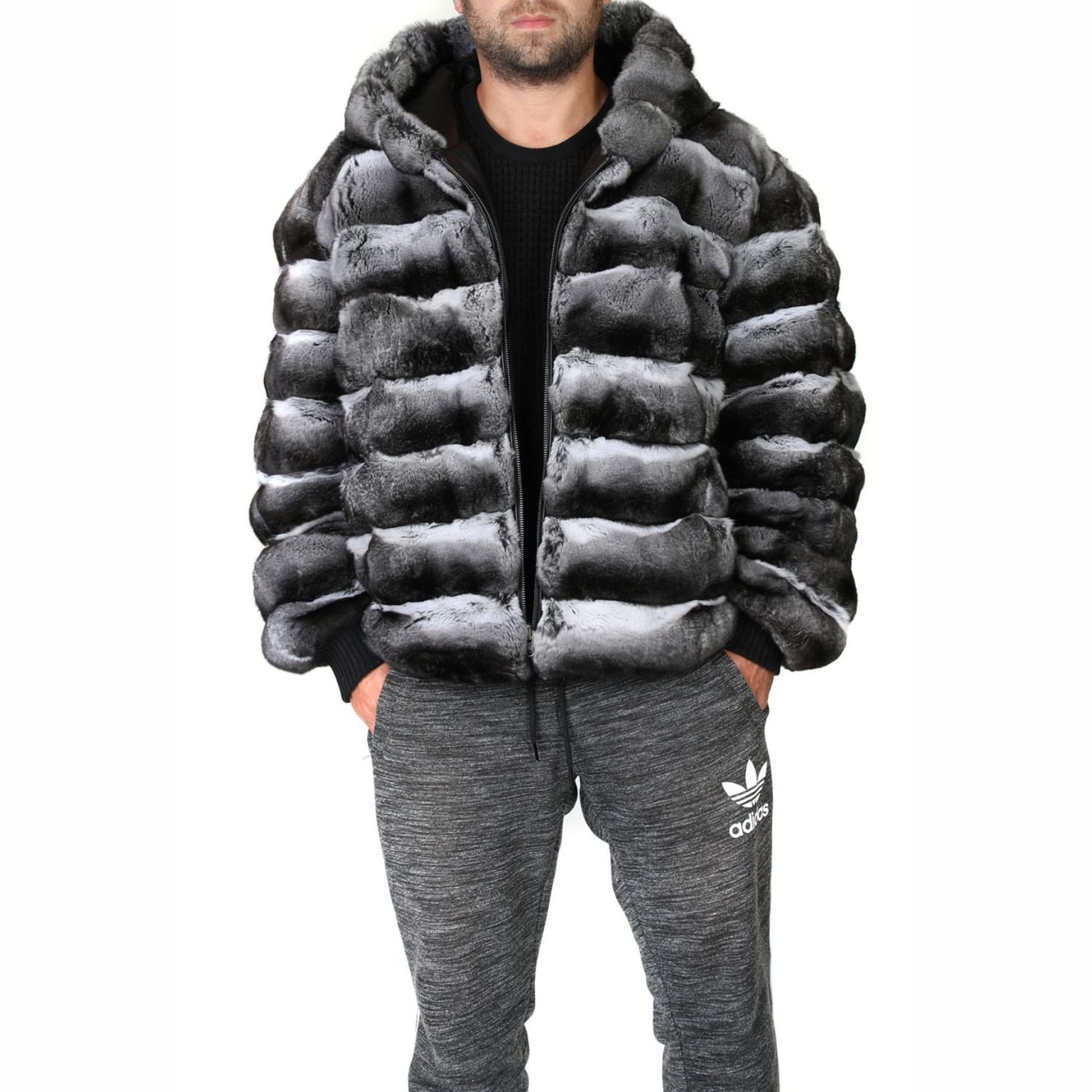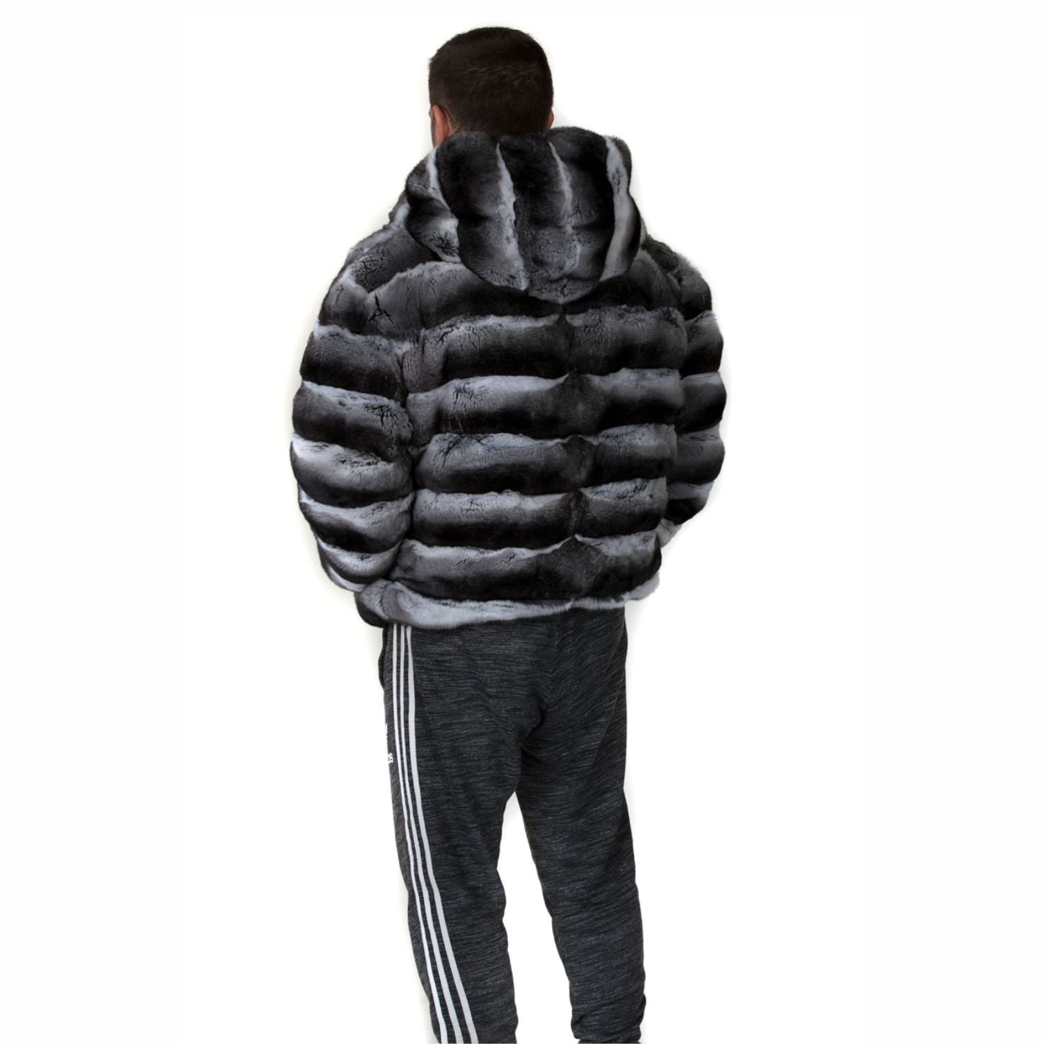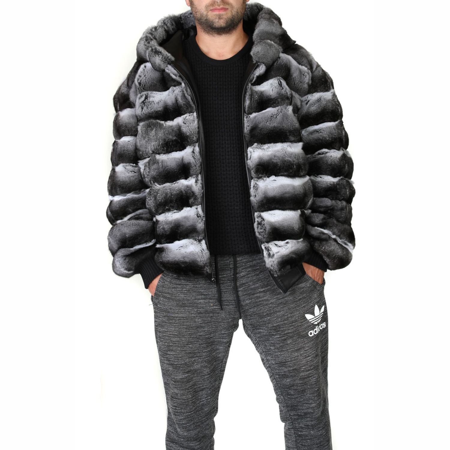 Reversible Hooded Chinchilla Fur Black Leather Bomber Jacket For Winter Season