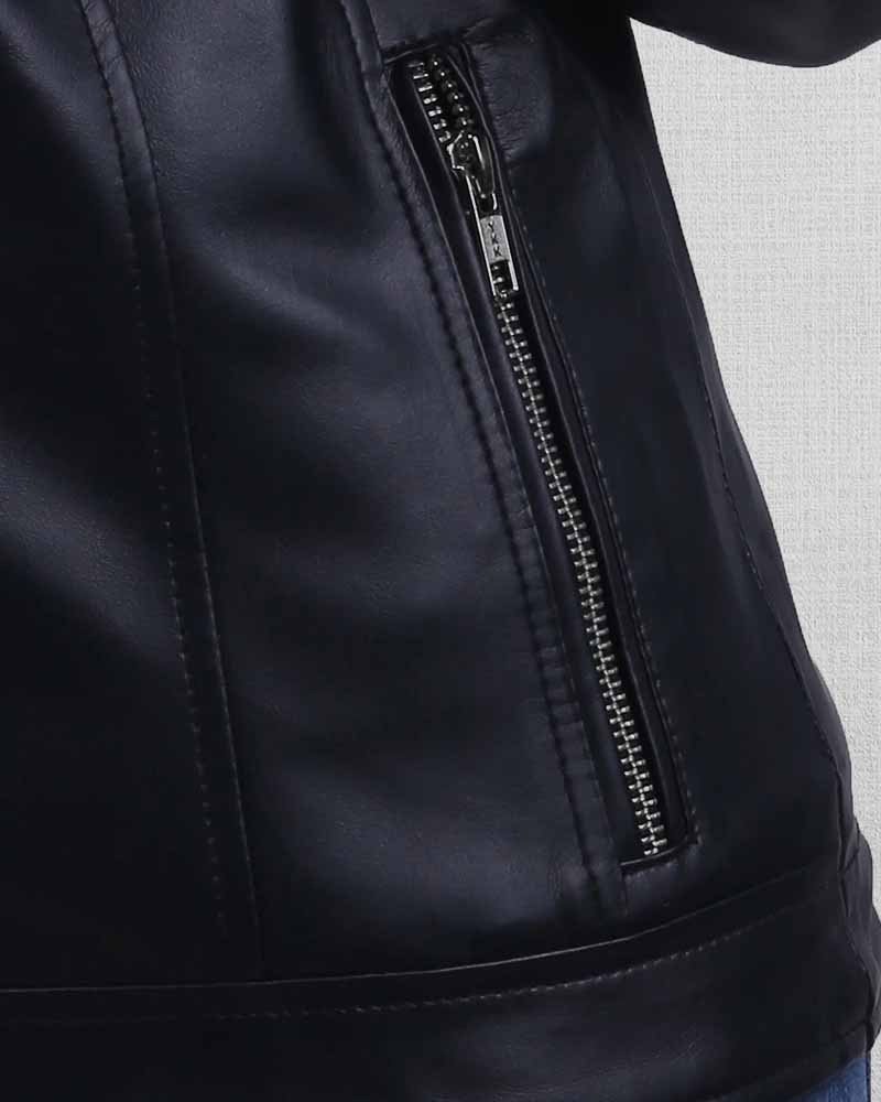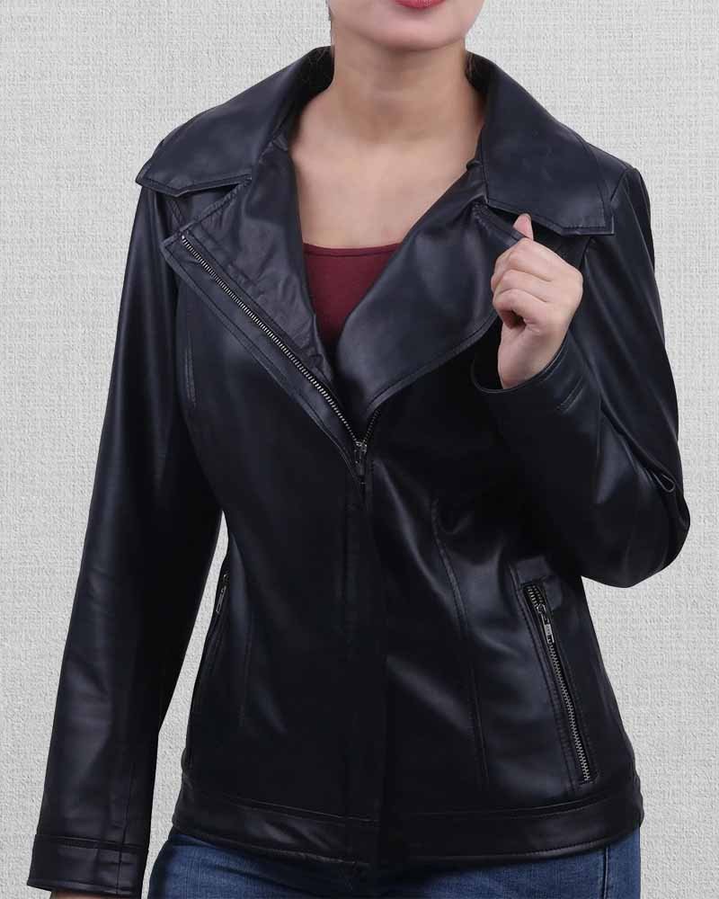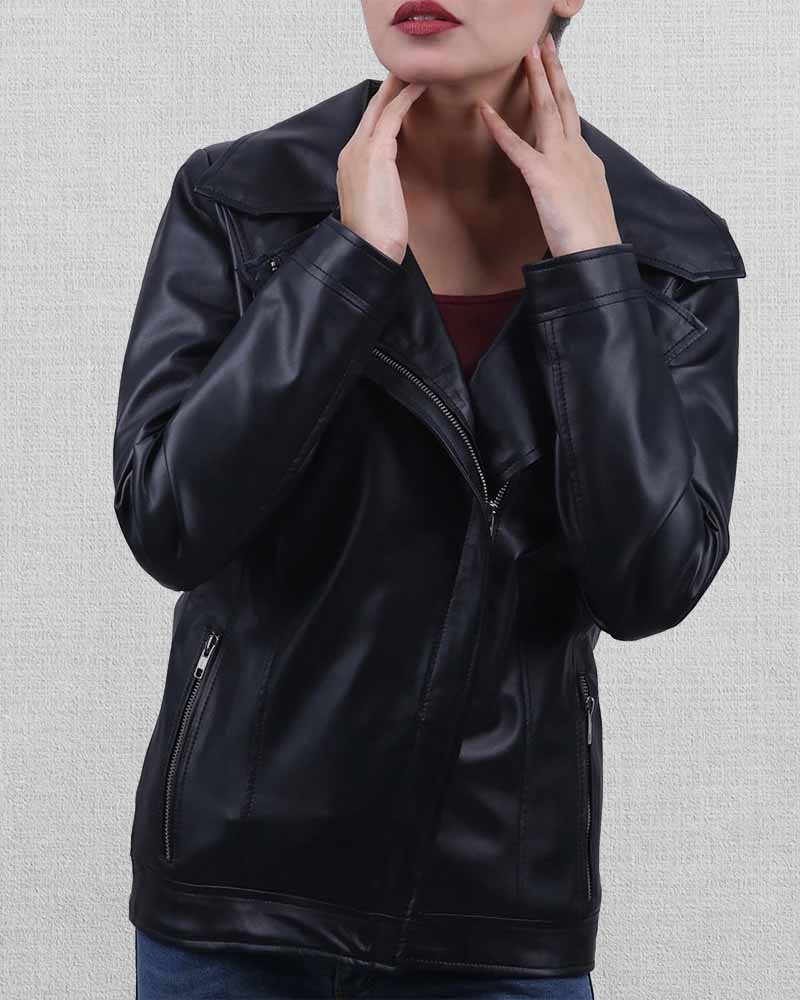 Upgrade your wardrobe with this sleek and minimalistic Revved Up women’s Biker Jacket by Movie Jackets Hub, perfect for those who appreciate understated style. Crafted from high-quality real leather, this jacket has a glossy finish and supple texture that exudes luxury. The meticulous tailoring and stitching details give it a premium look and feel. This black jacket has a body-shaping fit that’s both flattering and comfortable, making it a versatile and essential addition to your collection.
