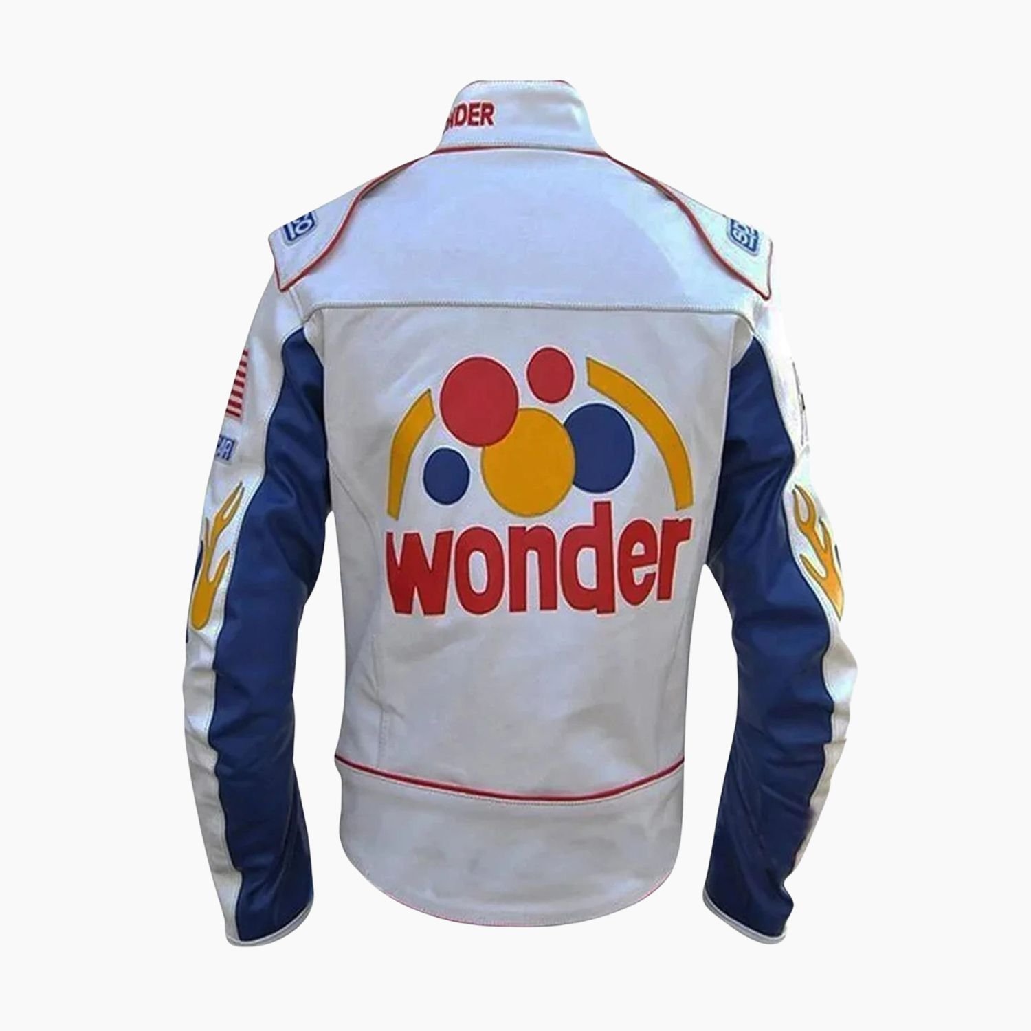 If you ain’t first, you’re last and this jacket is built to take the lead. Crafted from high-grade leather, the Ricky Bobby Racing Jacket features the bold, crisp white aesthetic of a professional driver’s suit. The front is embellished with authentic emblems, giving it the high-visibility look of a sponsored racer, while the back features the legendary “Wonder” emblem that fans will recognize instantly.