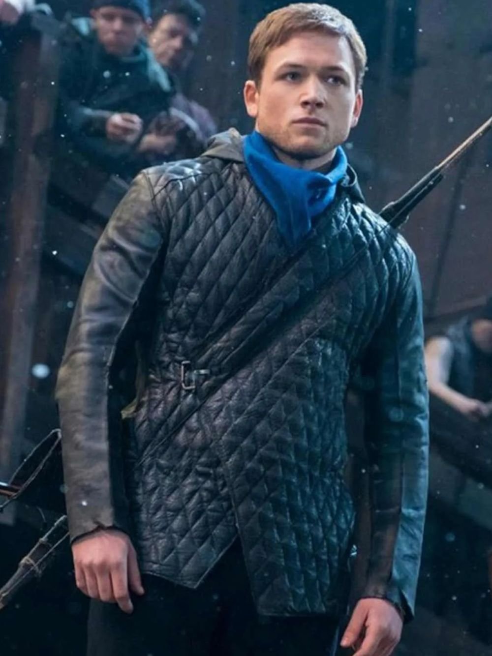 This jacket has a black color which quite common color in jackets and vest but it really suits on this particular one. Taron Egerton Leather Jacket is designed like the same feature of laces at the sides of waists which make it look like the same jacket of Robin Hood movie.