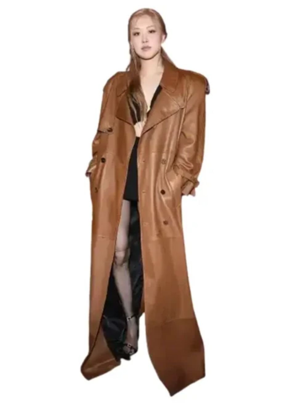 Singer Roseanne Park (ROSÉ) Paris Fashion Week 2023 Chocolate Leather Trench Coat