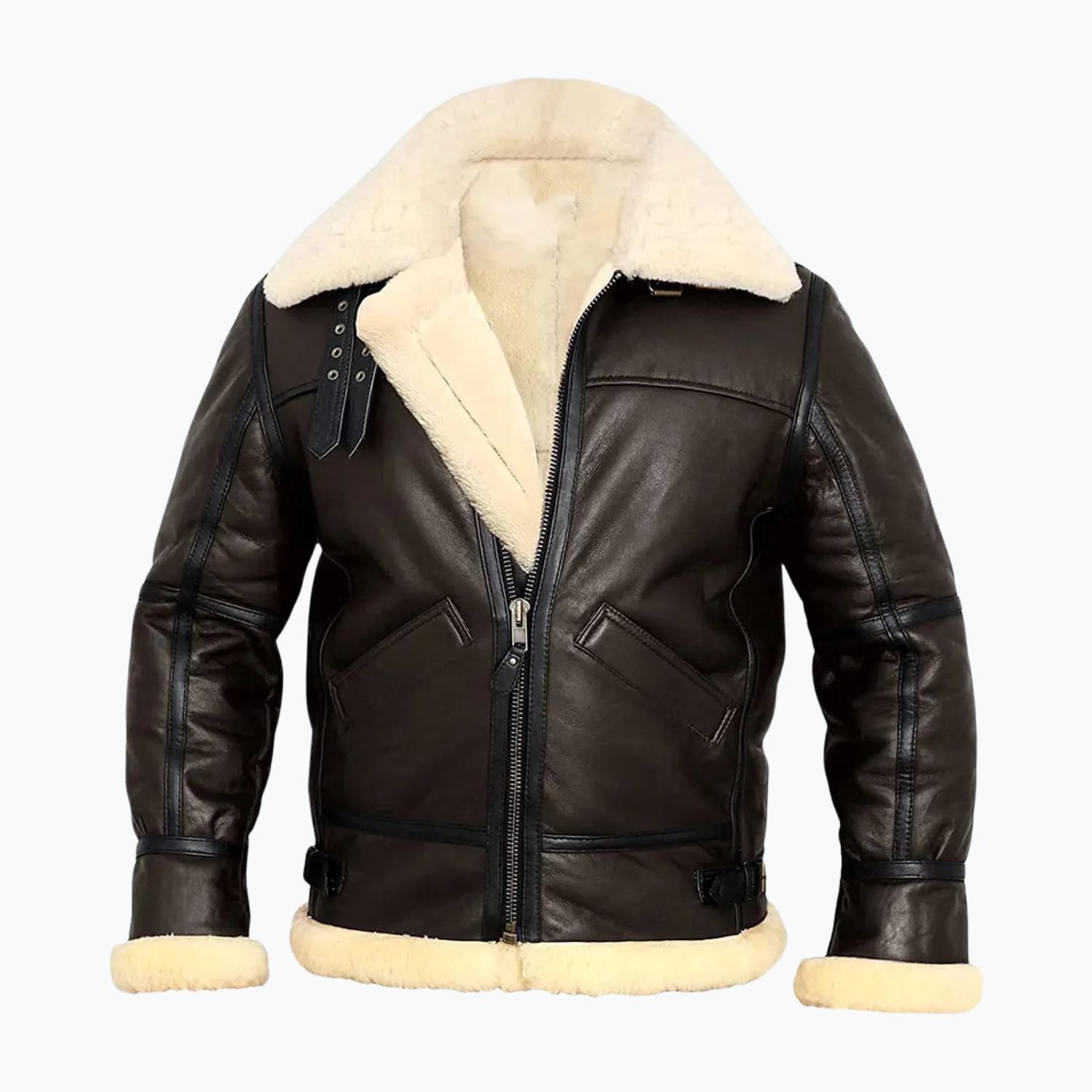 The interior of the Roy jacket is a sanctuary of thermal protection, featuring a full lining of plush shearling. This high-grade material is renowned for its ability to trap body heat while remaining breathable, providing a level of natural comfort that synthetic alternatives simply cannot match. The thick shearling extends to the oversized aviator collar and the cuffs, creating a striking visual contrast against the dark brown leather. The collar can be upturned and secured to protect the neck from biting winds, while the fur-lined cuffs ensure your wrists remain warm and comfortable. This “double-faced” construction allows you to face sub-zero temperatures with total confidence and ease.