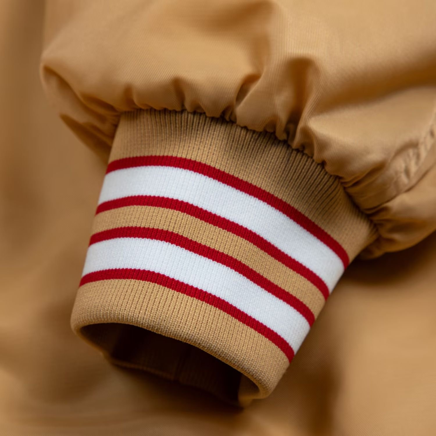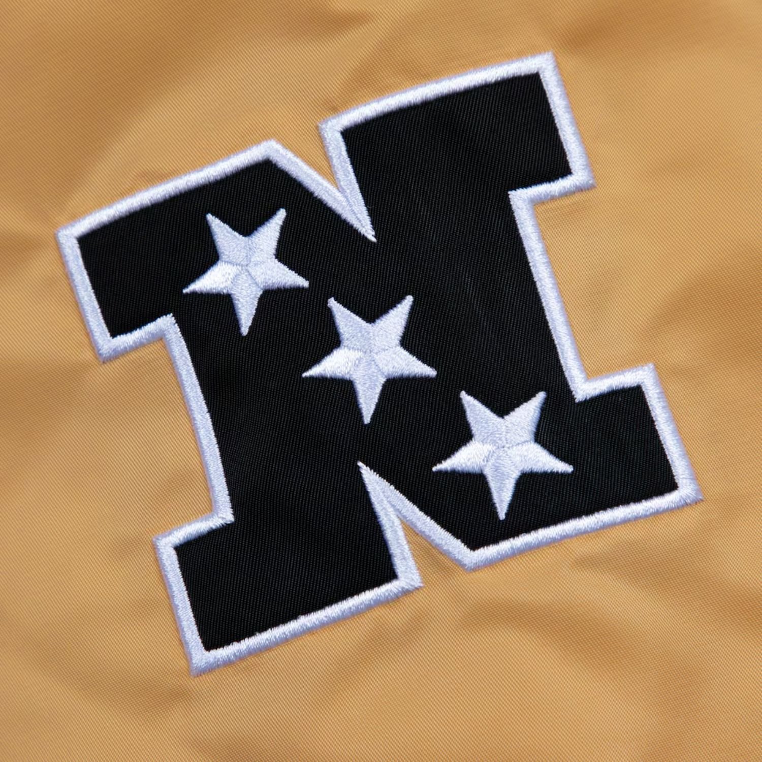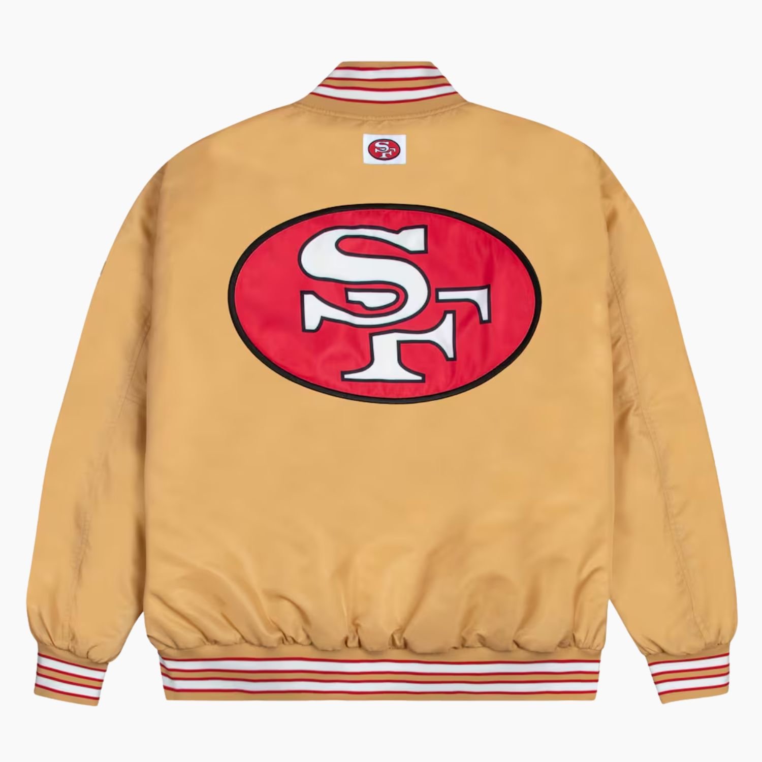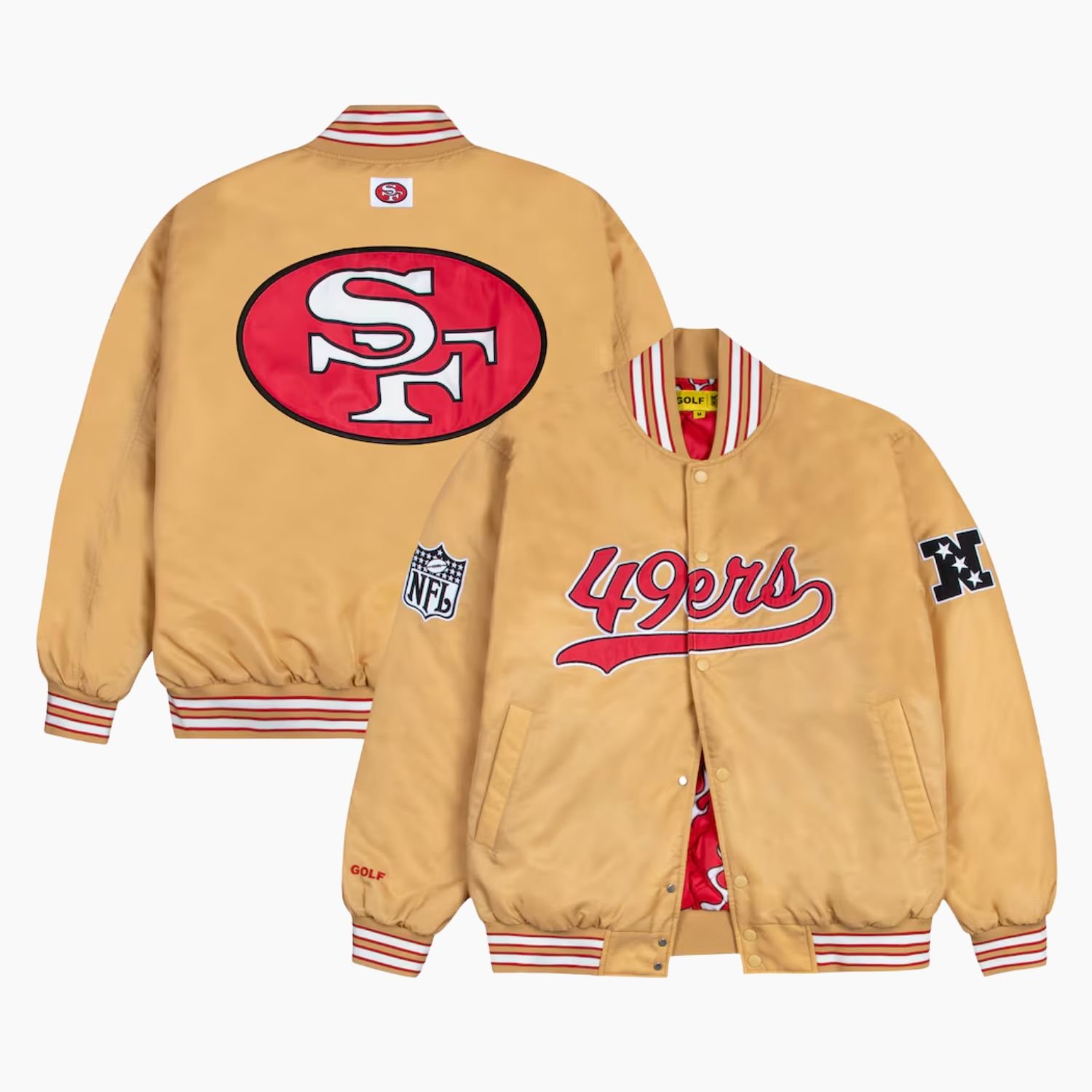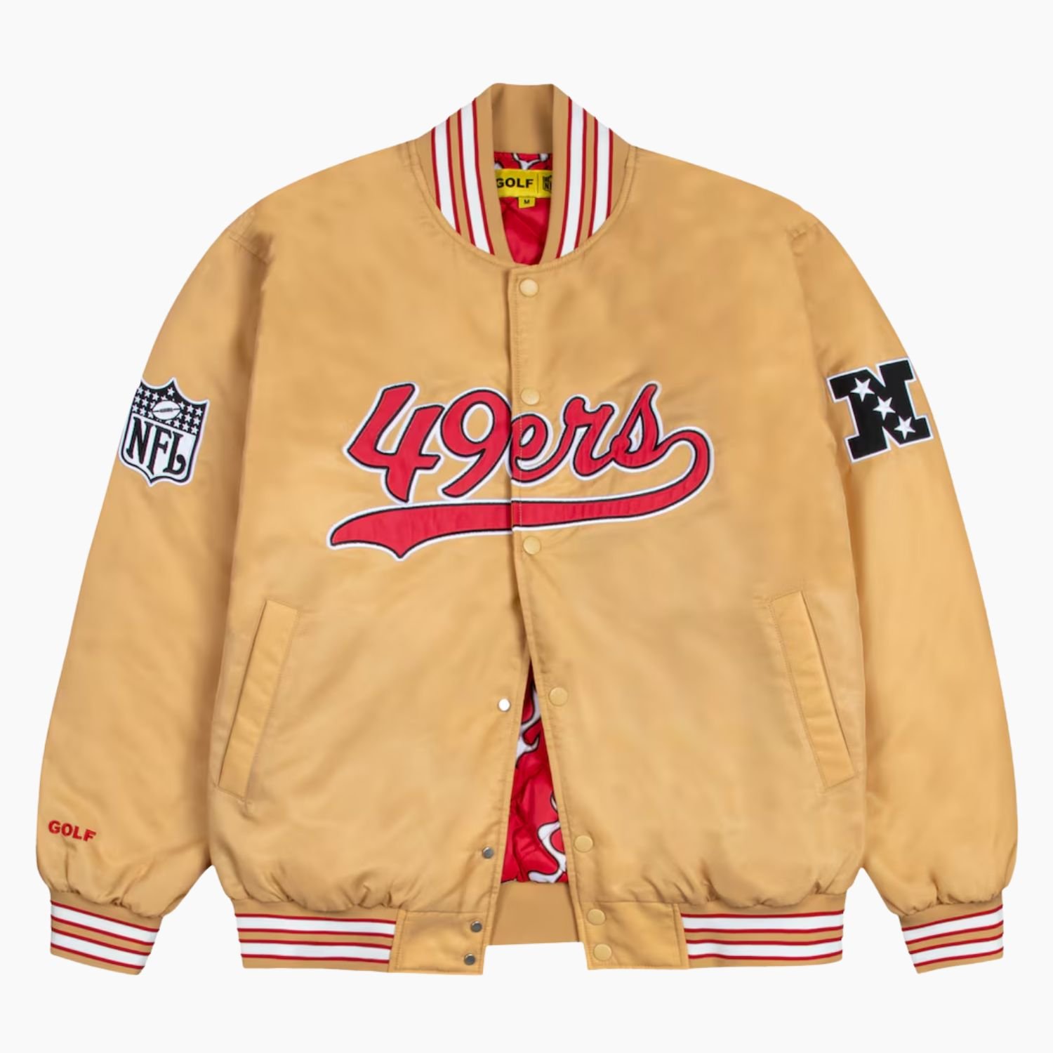Crafted from premium satin fabric, the jacket provides a smooth, sleek finish, while the soft viscose lining ensures all-day comfort. Its vibrant gold color with red and white accents makes a bold statement and embodies the iconic 49ers spirit.