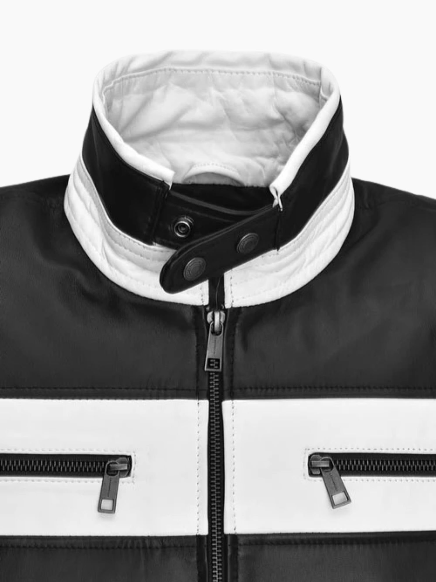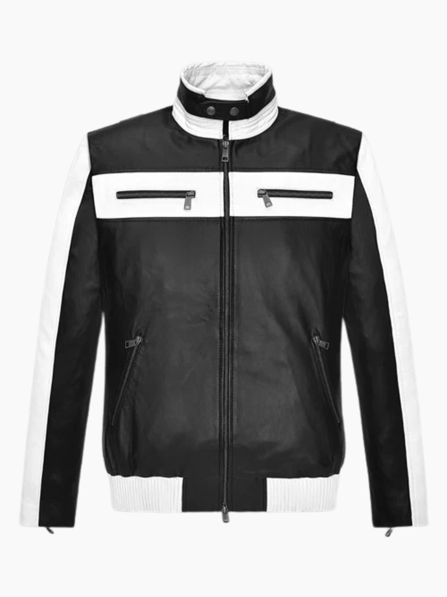The white stripe detailing across the chest and sleeves gives it a distinctive, eye catching edge, while the double chest pockets add both function and visual appeal. The zipper front closure and stand collar create a sharp, streamlined silhouette that looks effortlessly cool whether paired with jeans or casual trousers.