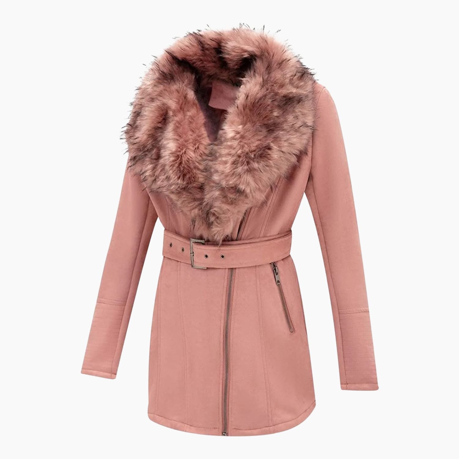 Make a bold and beautiful entrance this season with the Shearling Pink Coat with Faux Fur Collar. Crafted for the woman who loves timeless elegance with a touch of flair, this long leather coat is both cozy and captivating.