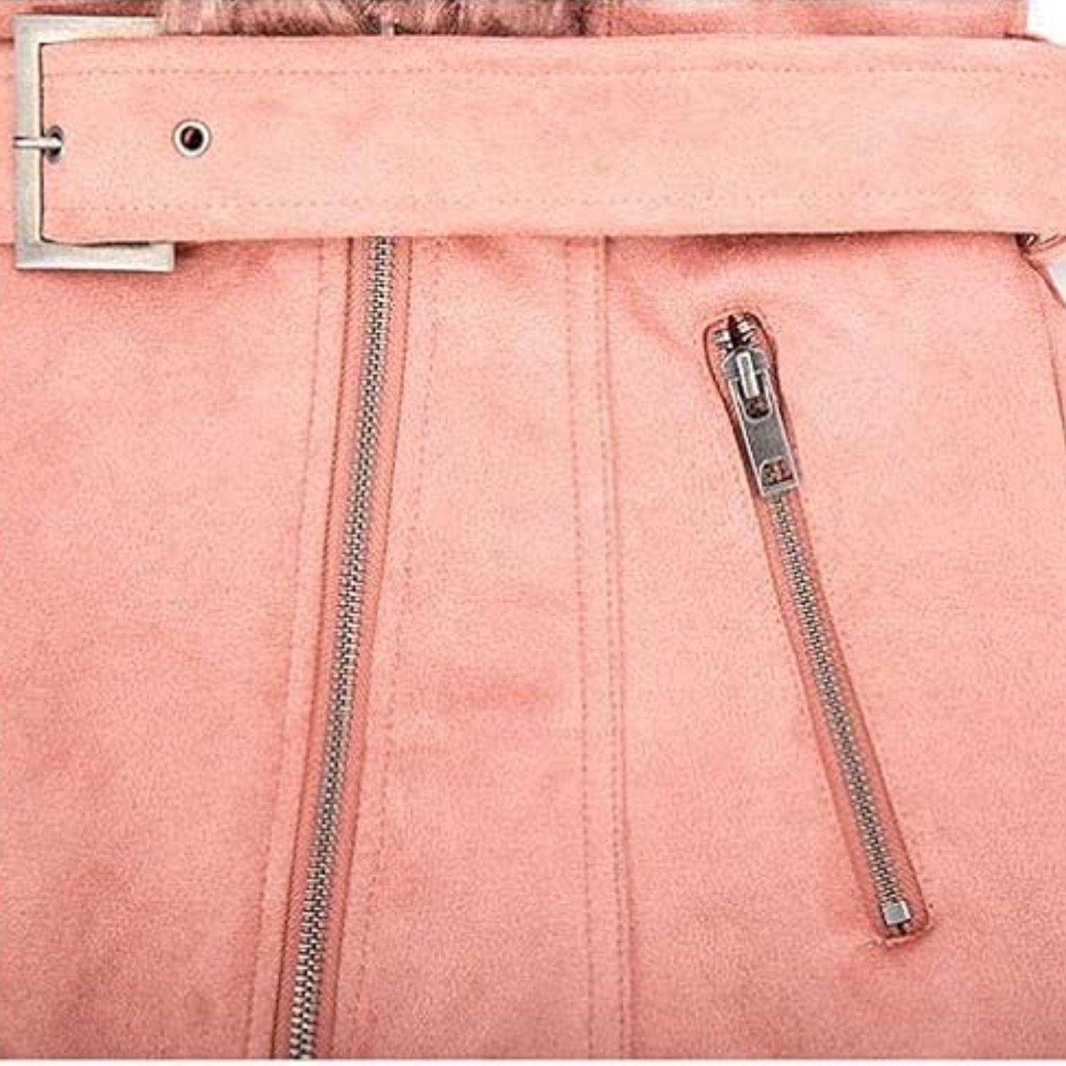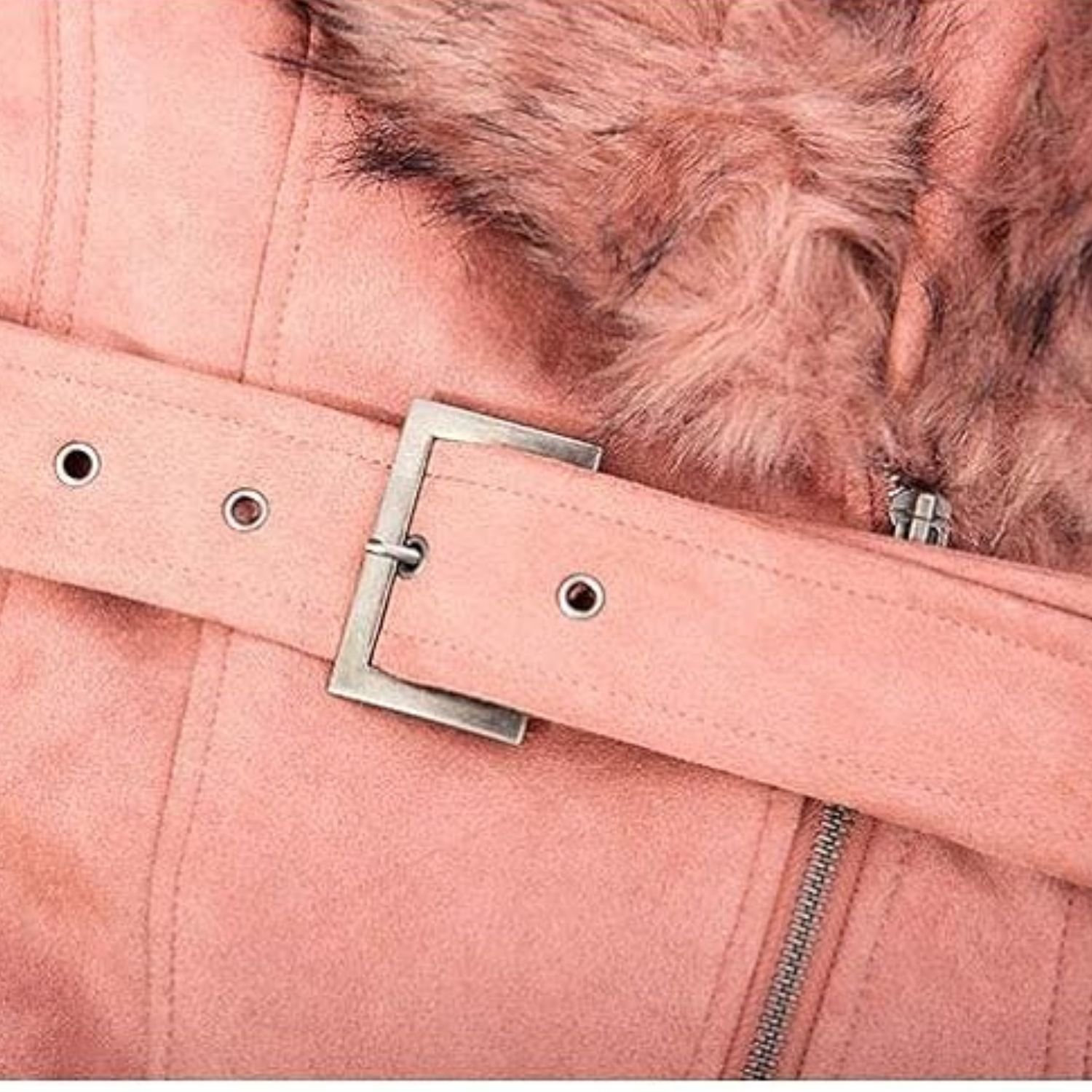 Made from premium faux leather, this coat from Movie Jackets Hub features a soft shearling interior lining for warmth and a luxurious faux fur collar for added sophistication. The delicate pink hue adds a chic, feminine charm, while the long silhouette enhances grace and presence perfect for winter days, evening strolls, or standout city style.