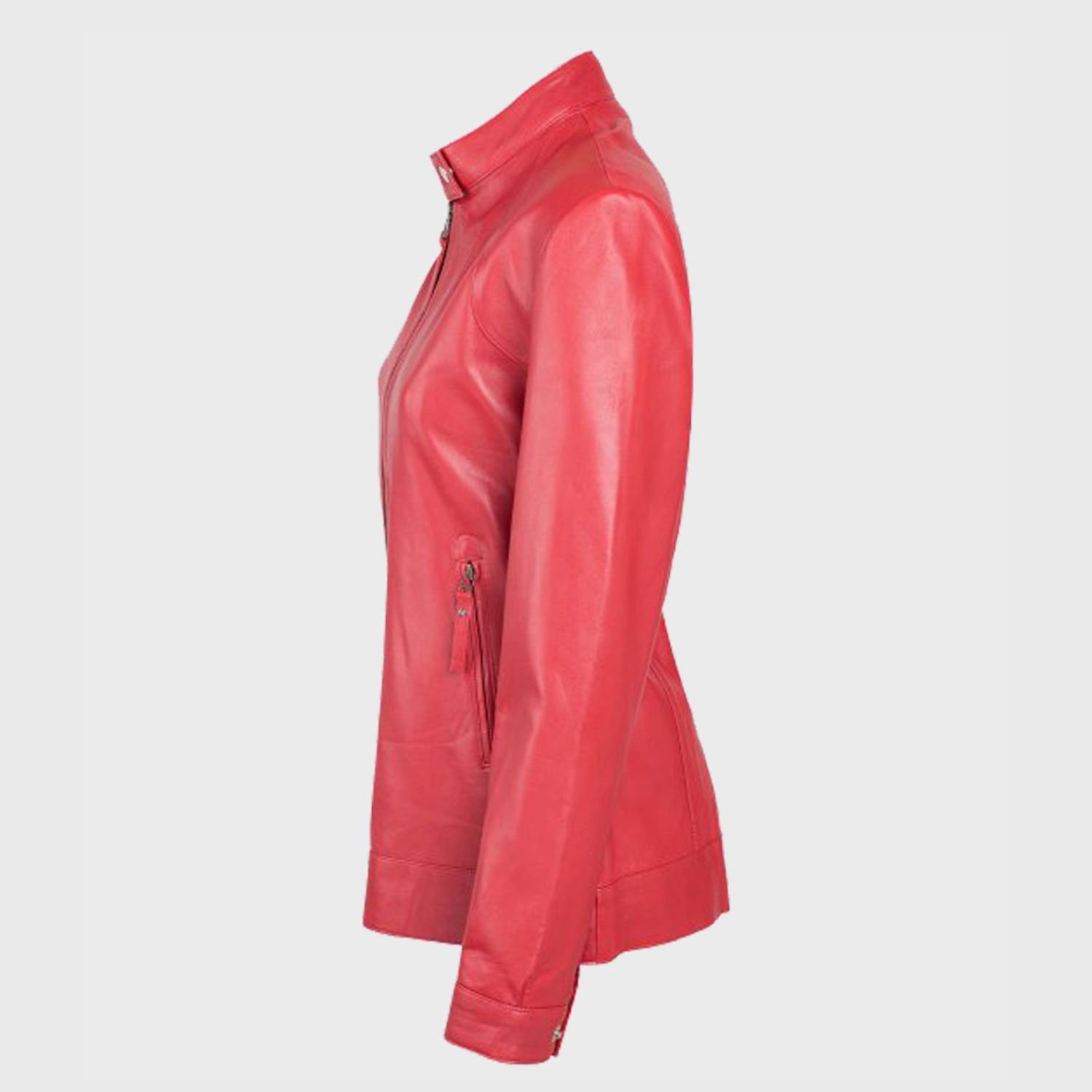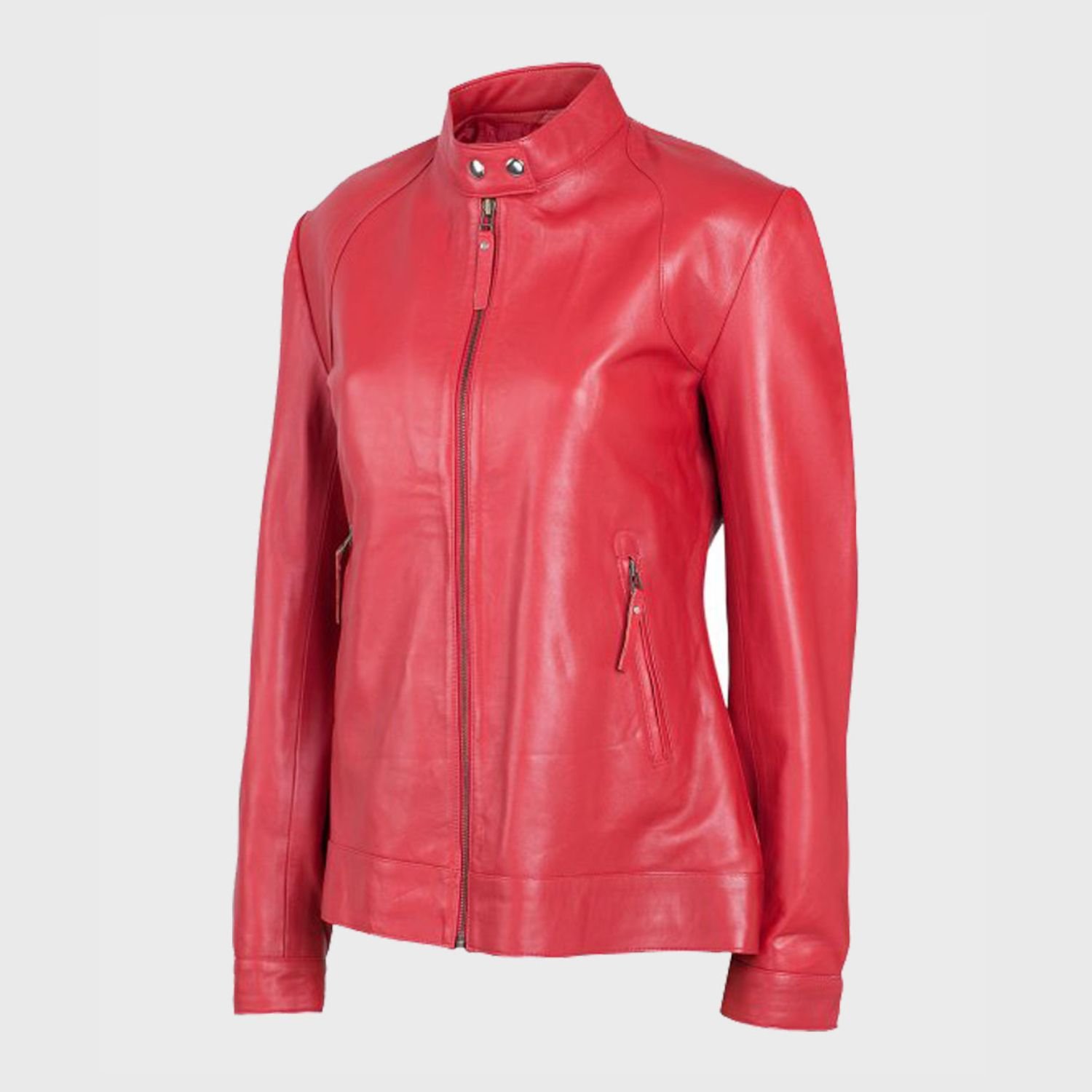 Women’s Snap Tab Collar Biker Red Sheepskin Leather Jacket has a snap-tab collar, it enhancing the jacket’s look. It has a branded front branded YKK zipper closure plus a full-length sleeve along with buttoned closure. The women’s red authentic leather jacket is available now at our store in shiny red color at a reasonable price. It has two zipped waist pockets and two inner pockets to keeping stuff.