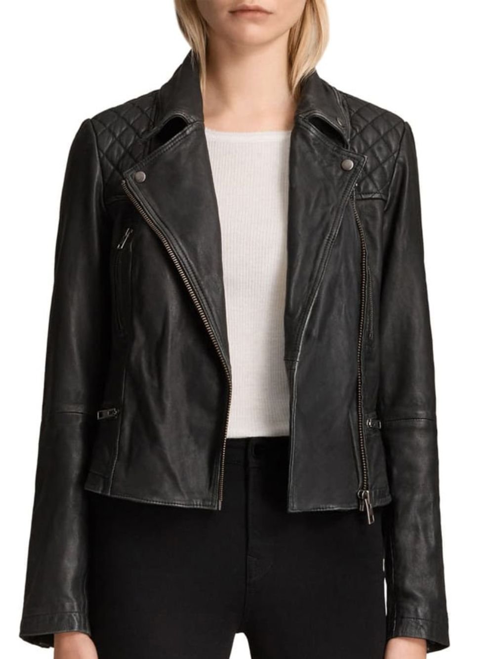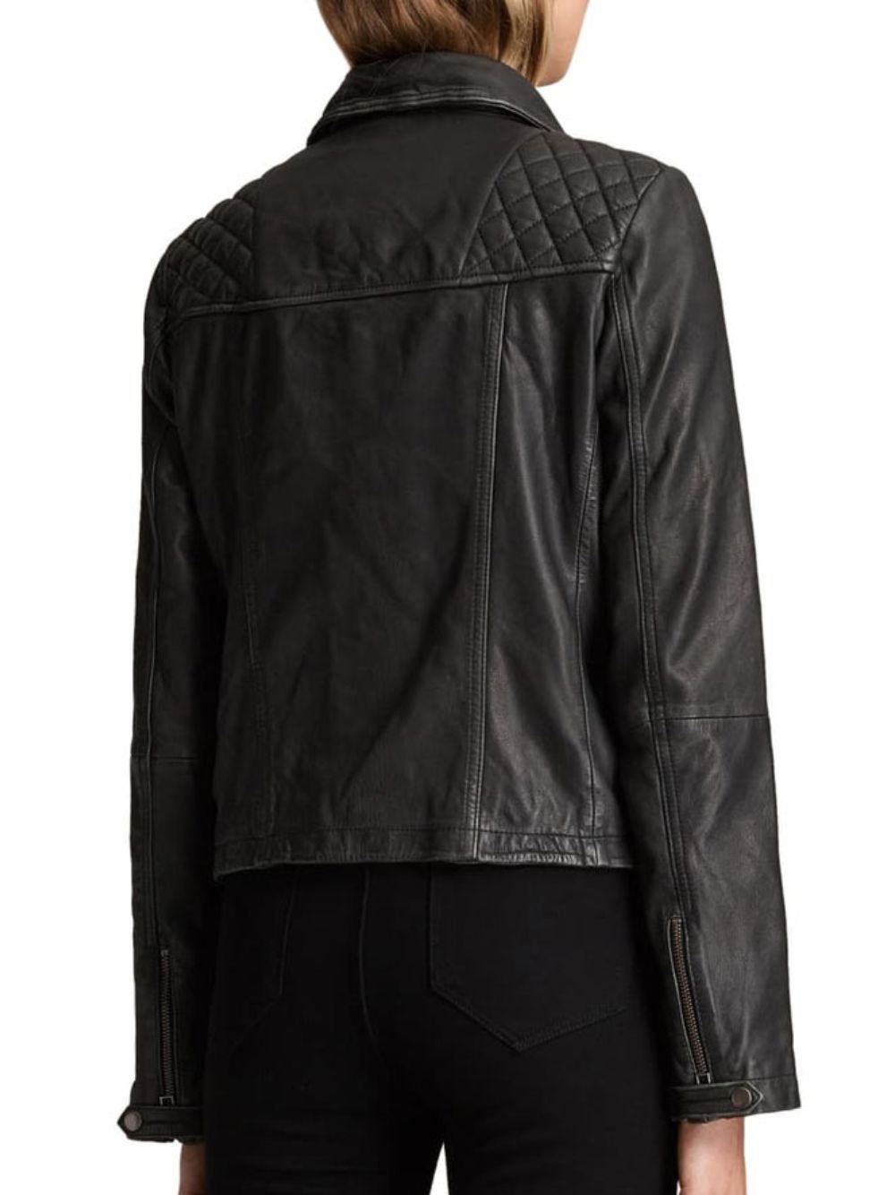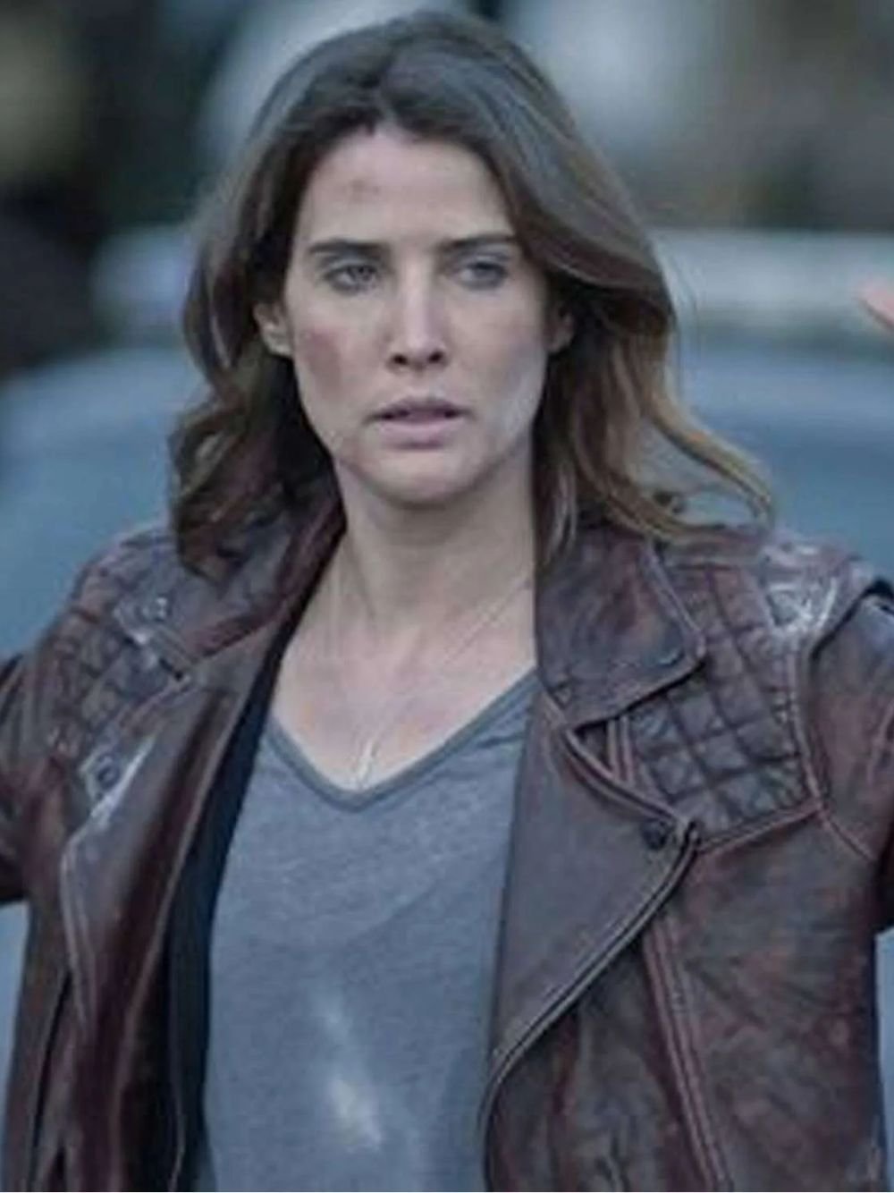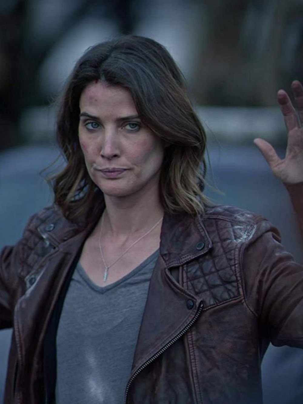Cobie Smulders Stumptown Drama Series Dex Parios Black Quilted Shoulder Biker Leather Jacket