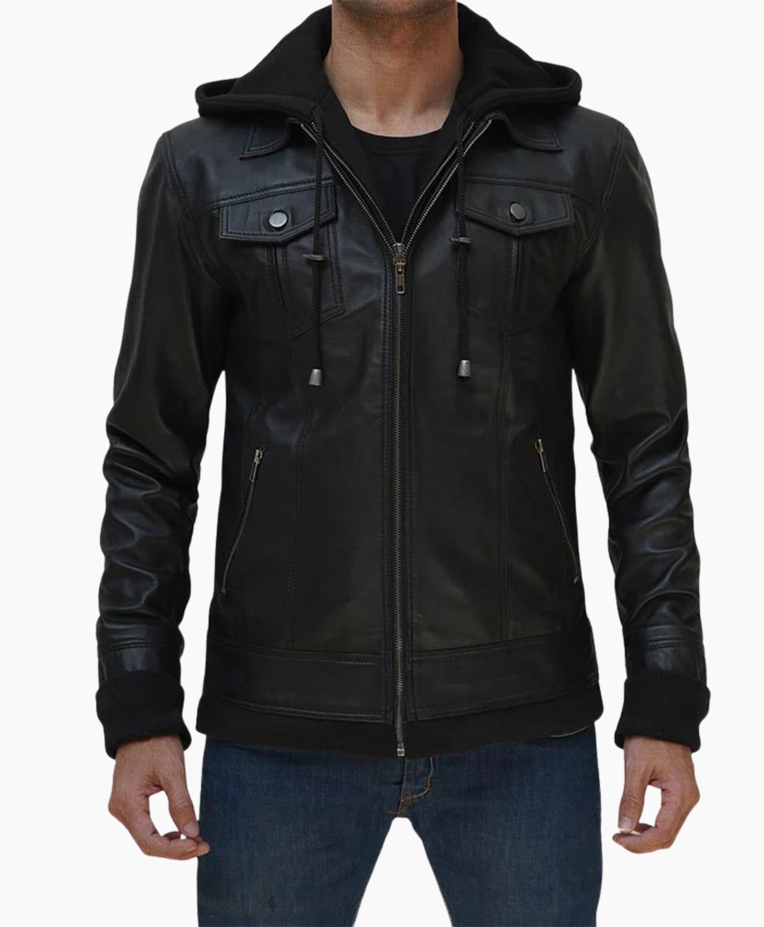 Stylish Black Leather Bomber Jacket with Removable Hood
