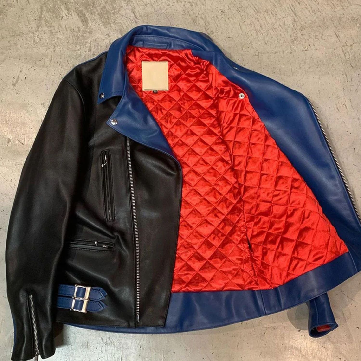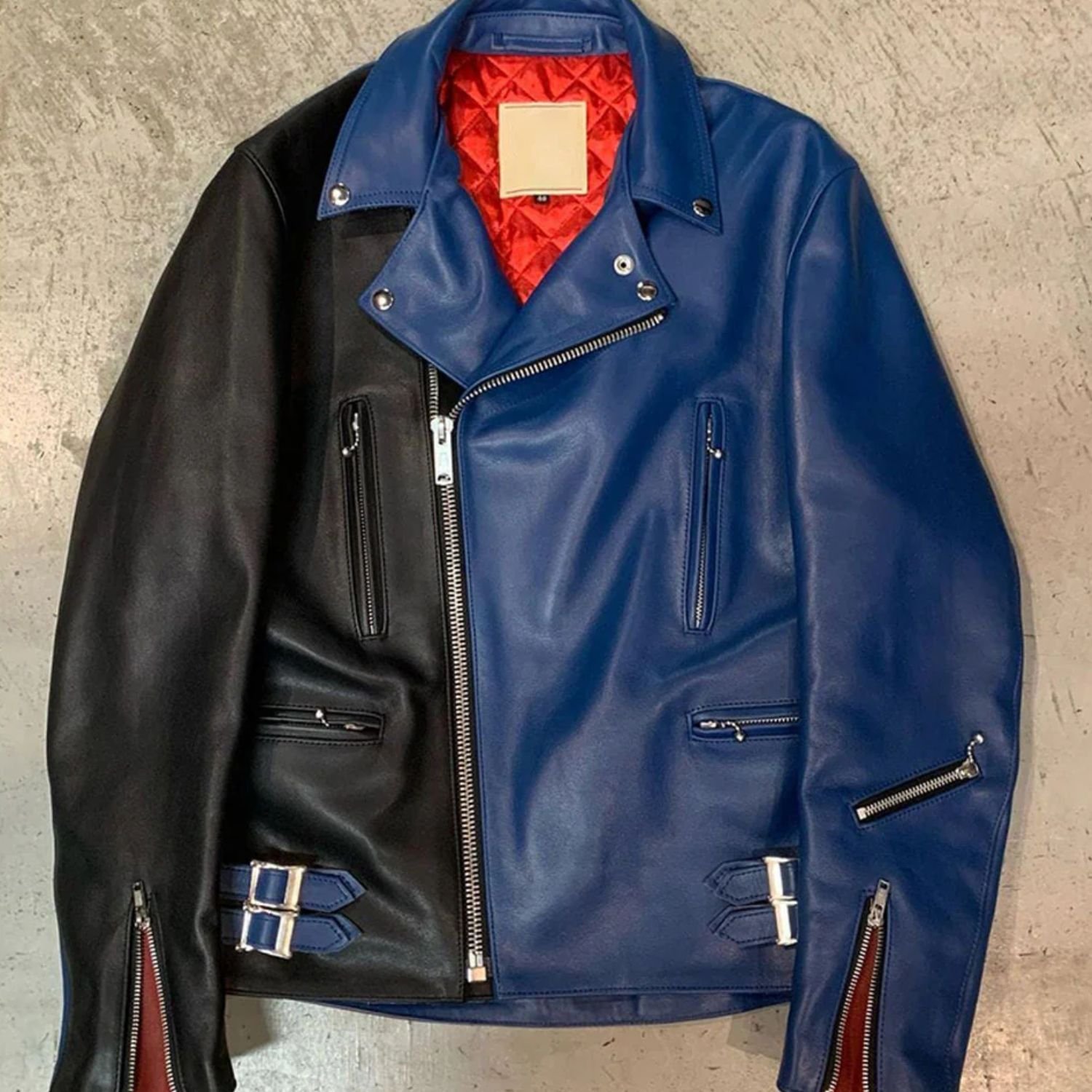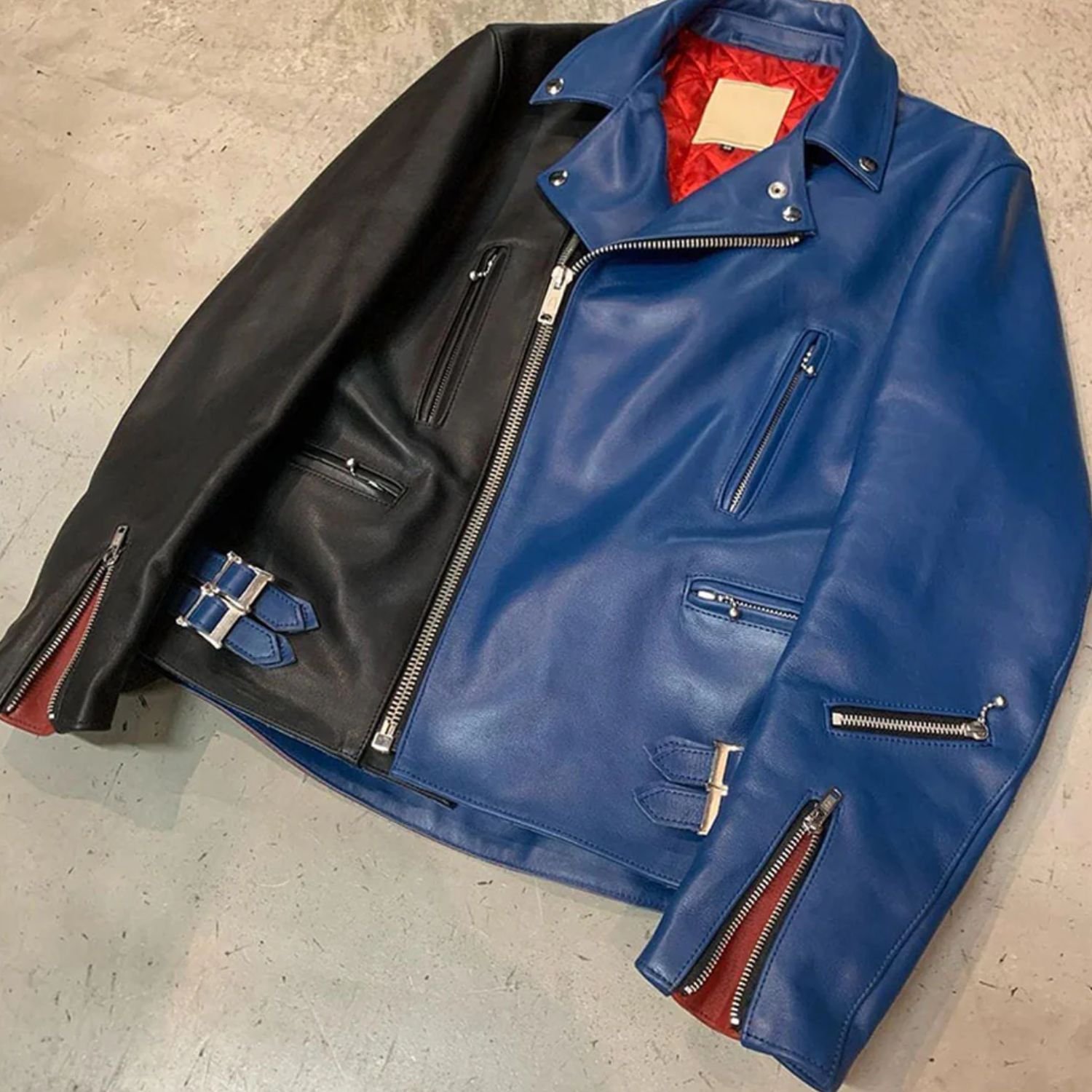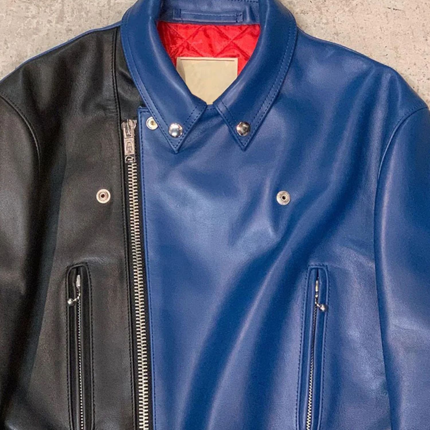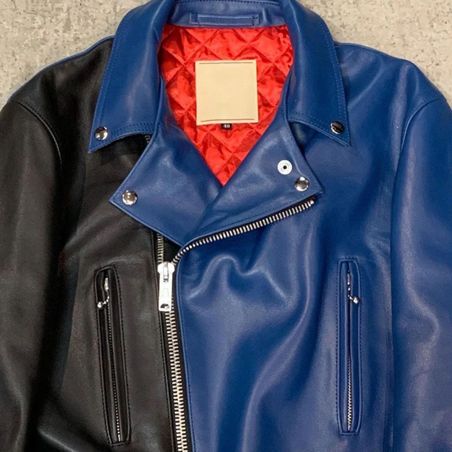 This blue and black leather jacket offers a unique contrast design, making it a must-have for fashion-forward individuals. The sleek black leather is perfectly complemented by bold blue accents, giving it a sporty yet sophisticated look. Its tailored fit, sharp lines, and stylish detailing make it the ultimate choice for those who want to elevate their outerwear game.