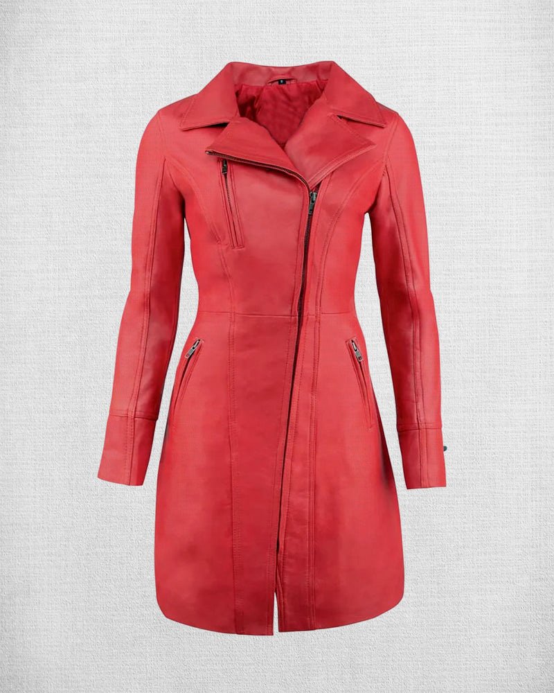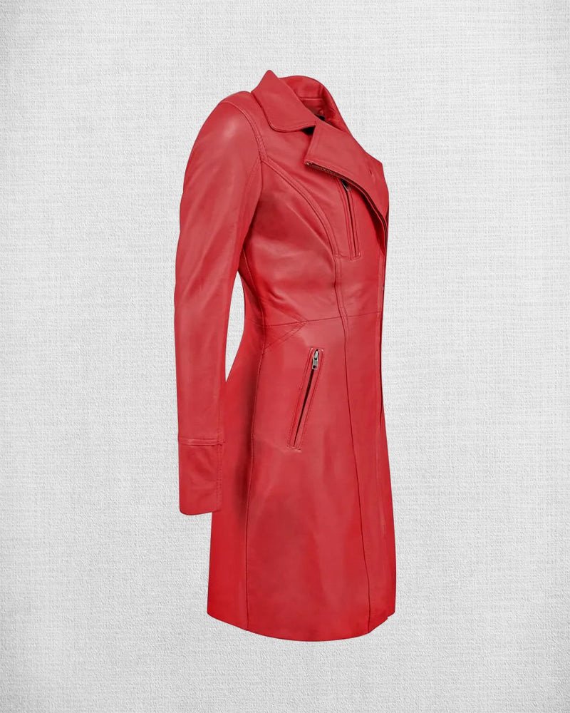 Make a definitive style statement with the Stylish Red Leather Coat For Women, a garment that effortlessly combines cinematic glamour with everyday functionality. This striking piece is meticulously crafted from 100% genuine premium leather, offering a supple, high-end texture that radiates luxury from every angle. The full-length / long coat design provides an elegant, sweeping silhouette that elongates the frame, while the timeless vibrant red color ensures you remain the centerpiece of any setting. Whether layered over a professional suit for a power move at the office or draped over an evening gown, this coat is the ultimate symbol of confidence and sophisticated taste.
