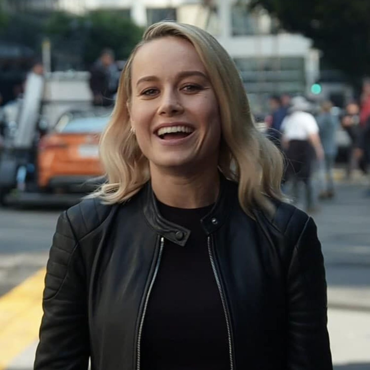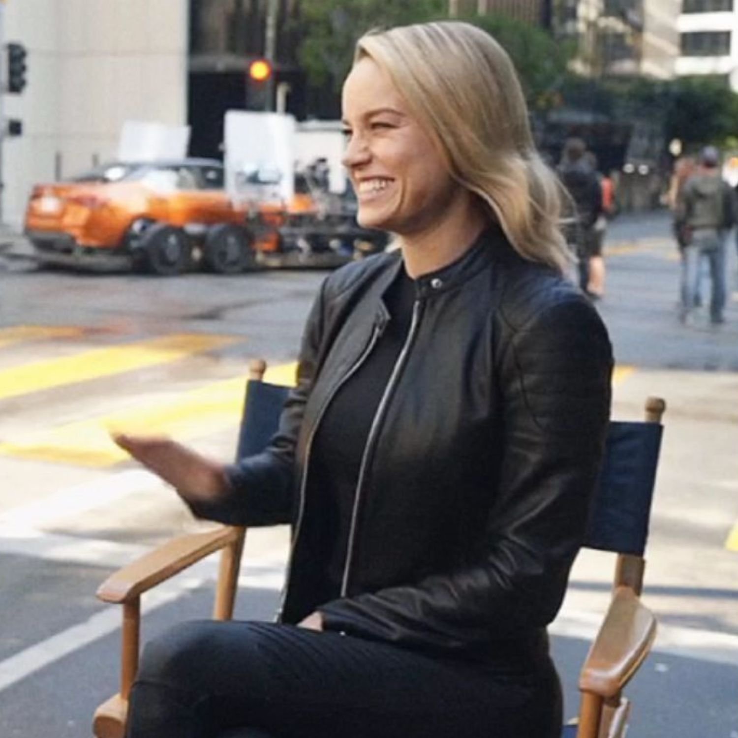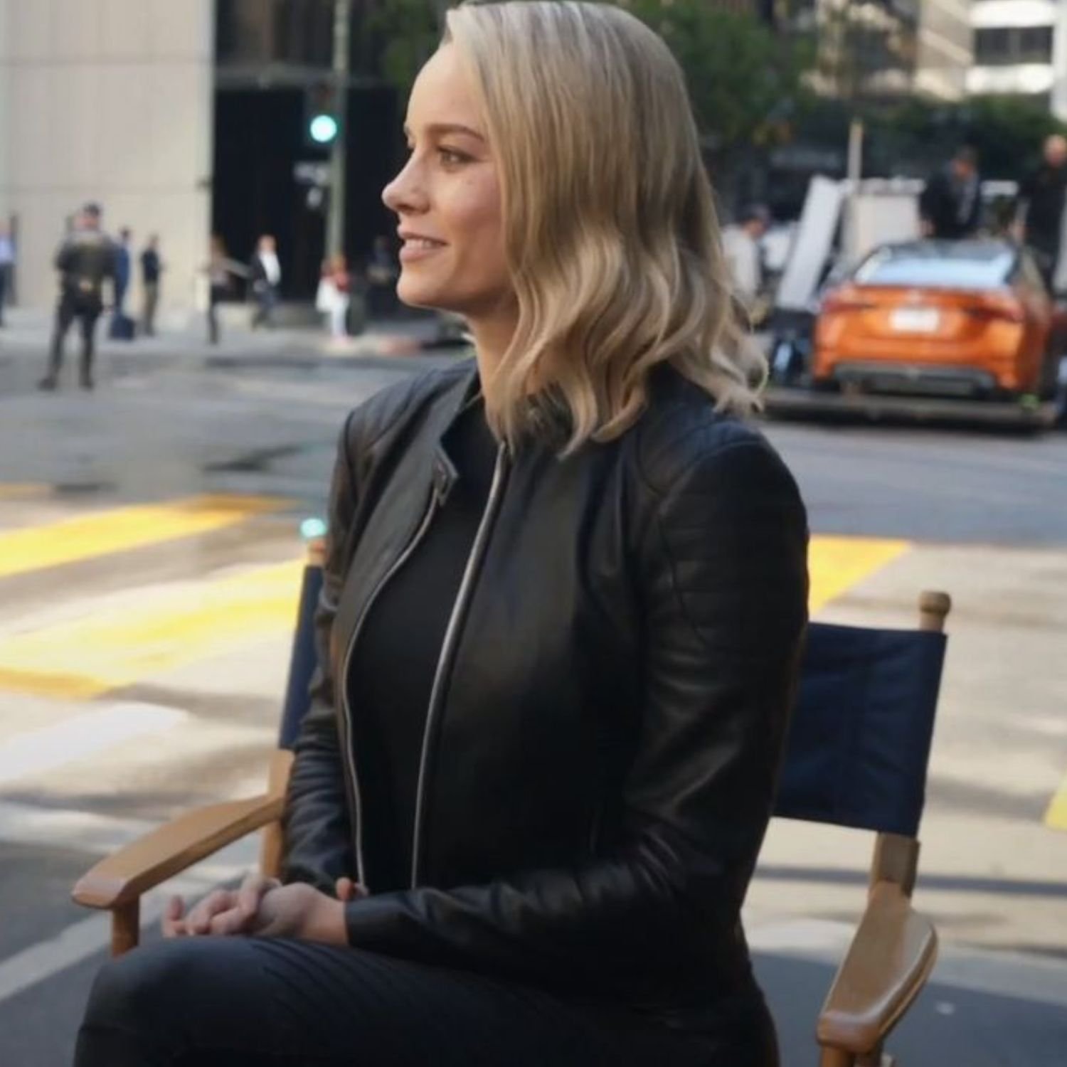 Brie Larson 2022 Super Bowl Nissan Commercial Ad Behind The Scenes Black Leather Jacket