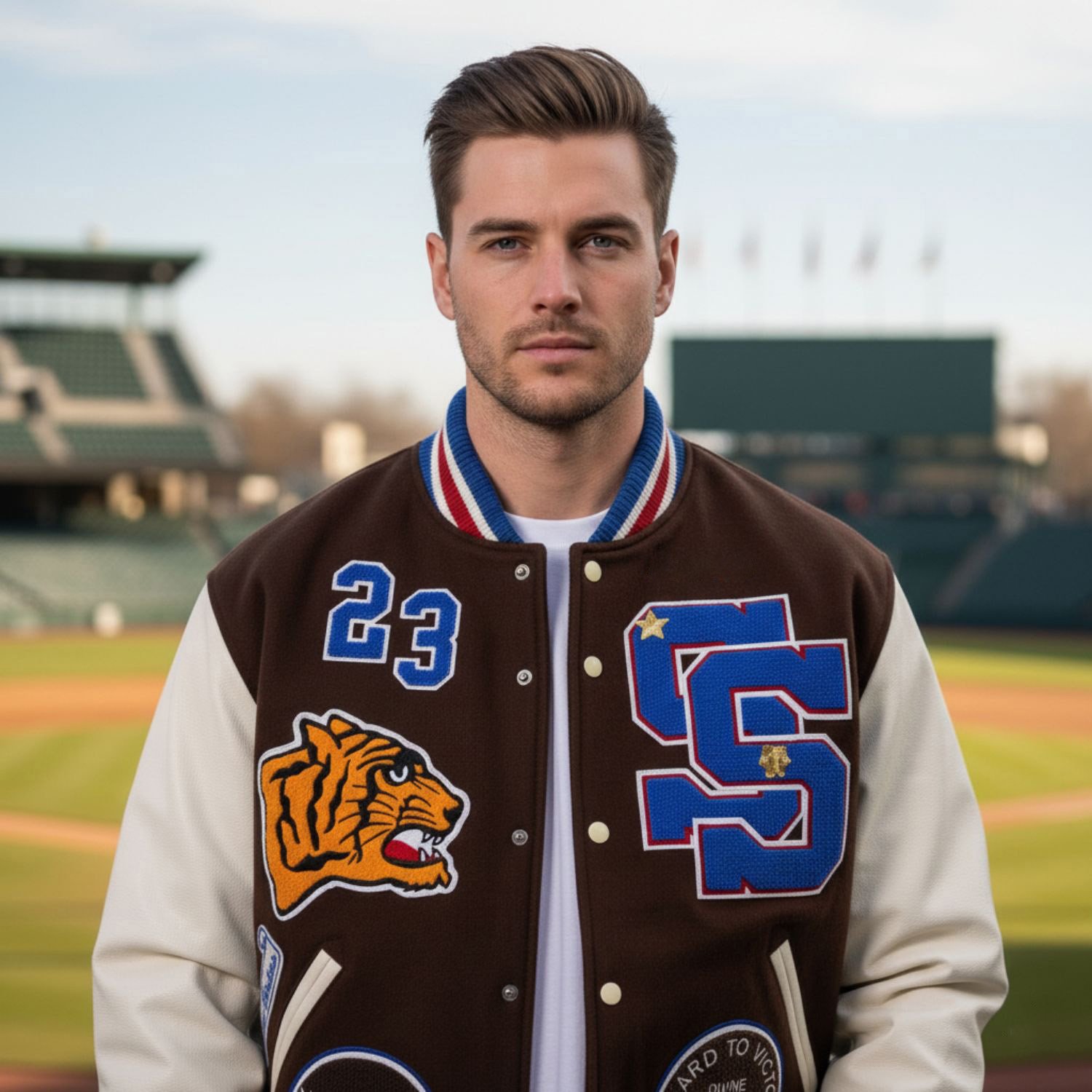 The iconic Supreme Tiger logo on the front brings bold character to your style, making this jacket a statement piece for any season. Whether you pair it with jeans, sneakers, or a hoodie underneath, the Supreme Tiger Brown Varsity Jacket guarantees a fashionable and confident appearance. Enjoy Free USA Shipping & Fast Delivery with your order.