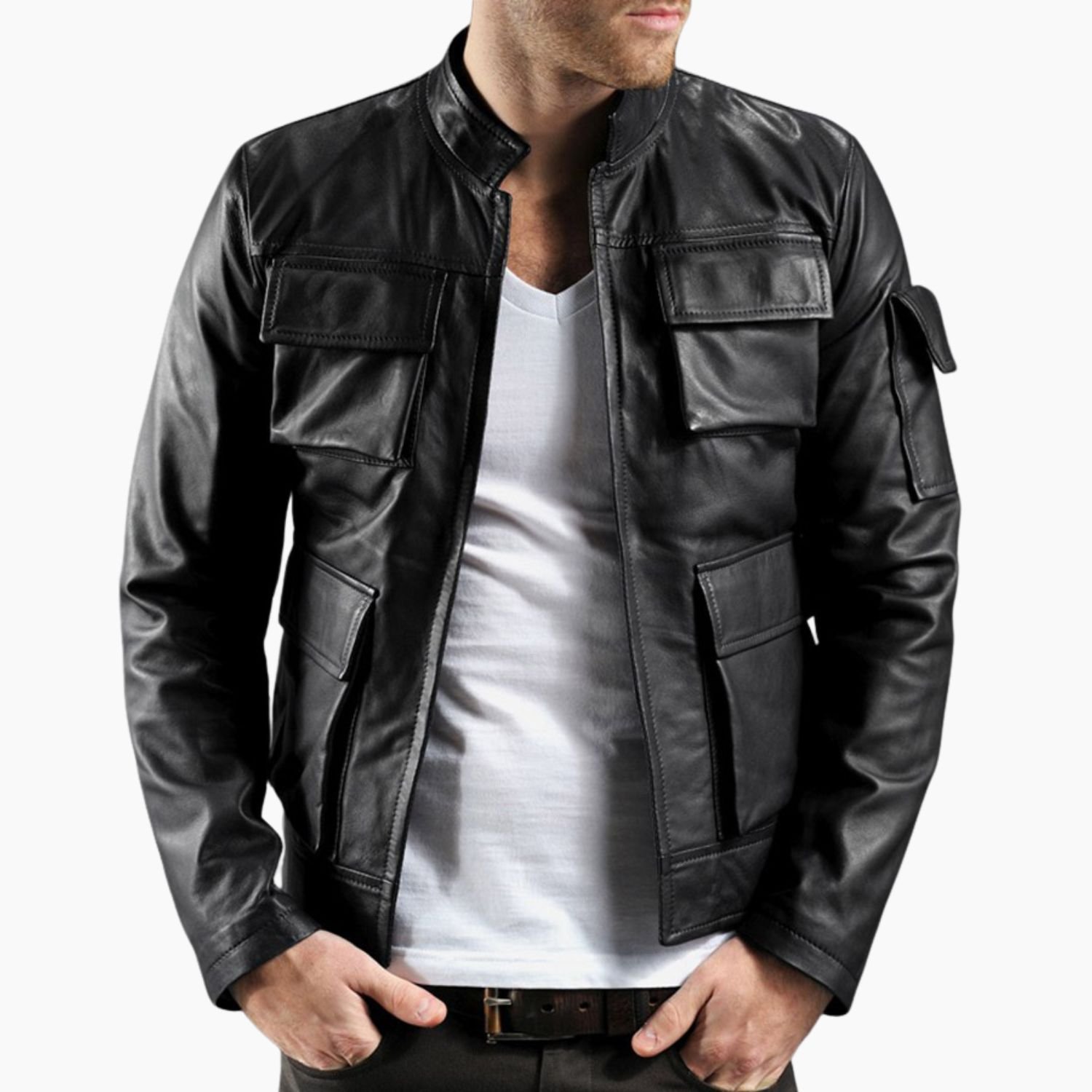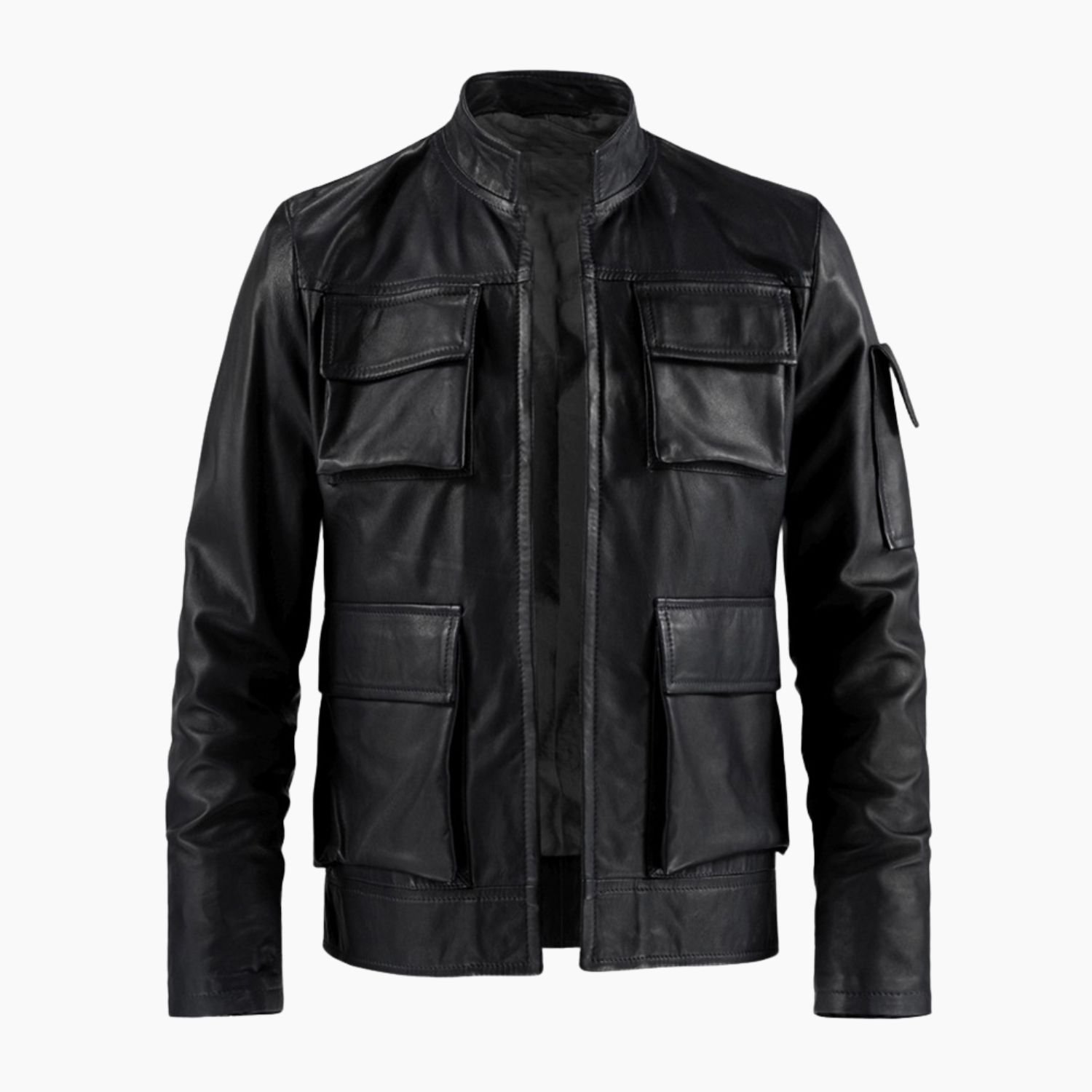 Crafted from premium-quality black leather, the jacket features a structured design that mirrors Han Solo’s bold, adventurous spirit. Its classic stand collar, zip-up front, and four front flap pockets stay true to the original film design, while offering functionality and a rugged, military-inspired aesthetic.